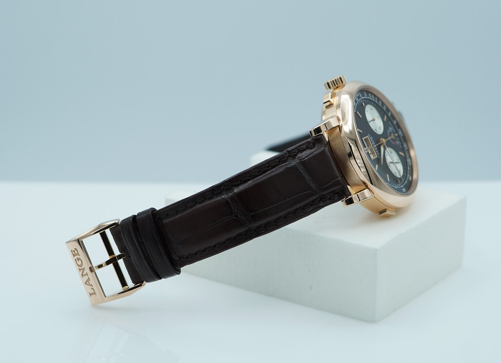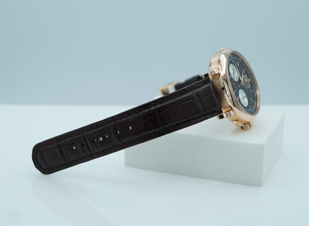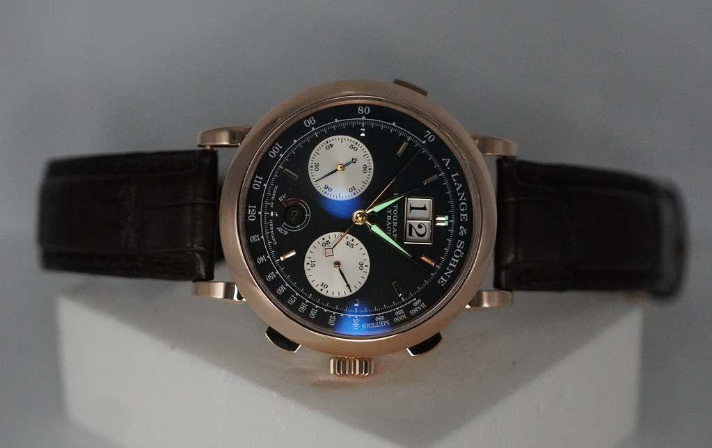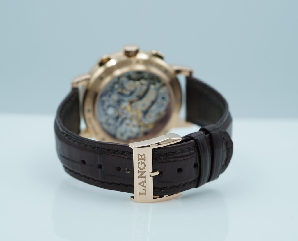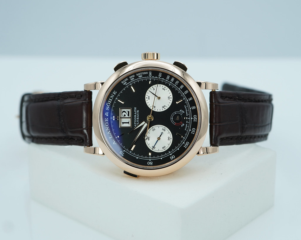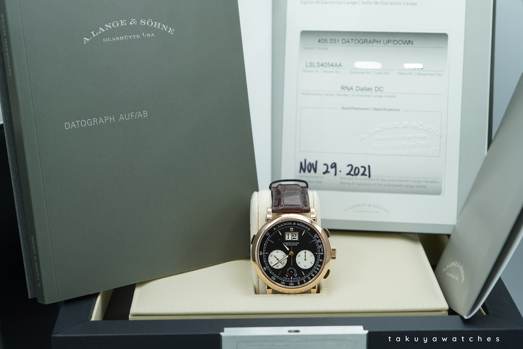 An Excellent Condition & Very Beautiful 2021 41mm A. Lange & Sohne Datograph Up Down 18K Rose Gold with Black Dial. It’s on Dark Brown Alligator Strap & 18K Rose Gold Tang Buckle. Purchased from A. Lange & Sohne USA Authorized Dealer in 11.2021.