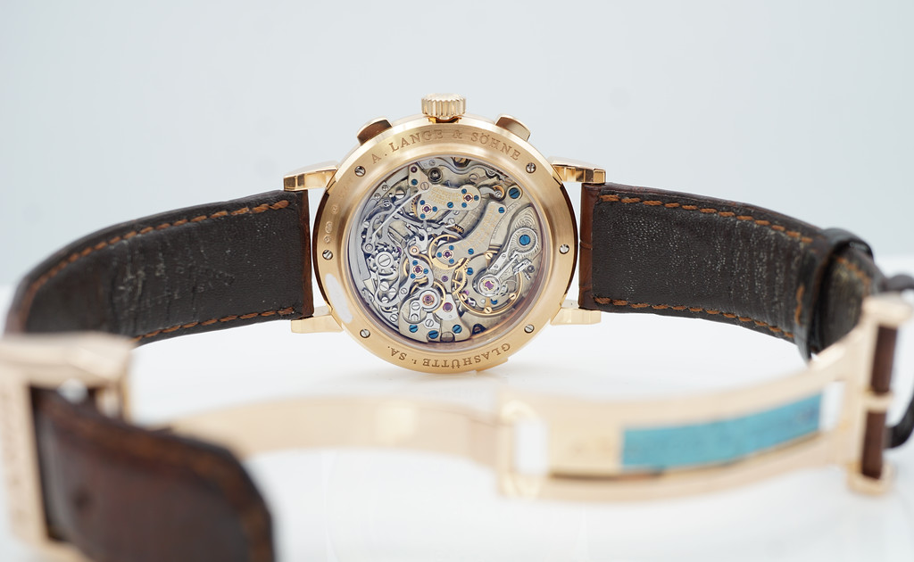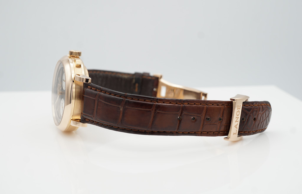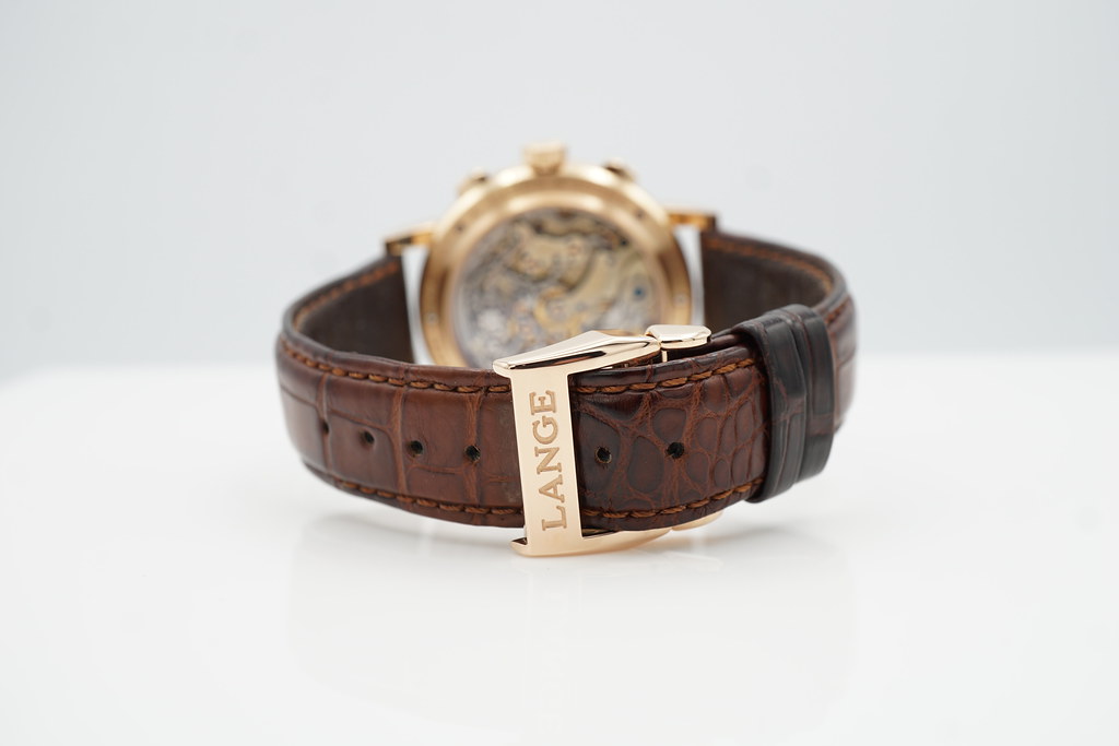 An Excellent Condition & Very Beautiful 41mm A. Lange & Sohne Datograph Up/Down 18K Rose Gold with Beautiful Black Dial. Its on Dark Brown Alligator Strap & 18K Rose Gold Deployant Clasp. Purchased from A. Lange & Sohne USA Authorized Dealer in 09.2018. Watch Running Perfect with Non Issues. Complete Set.
