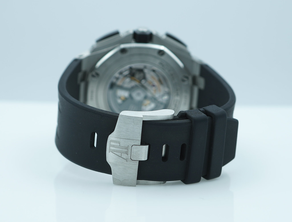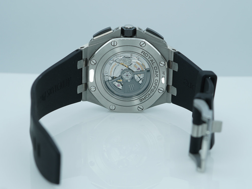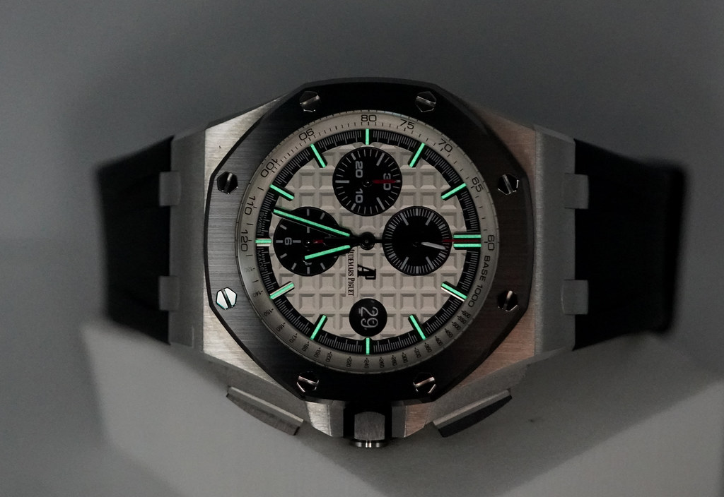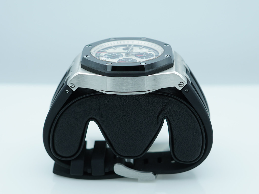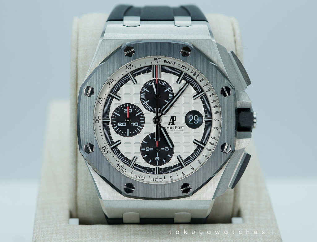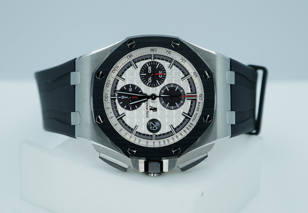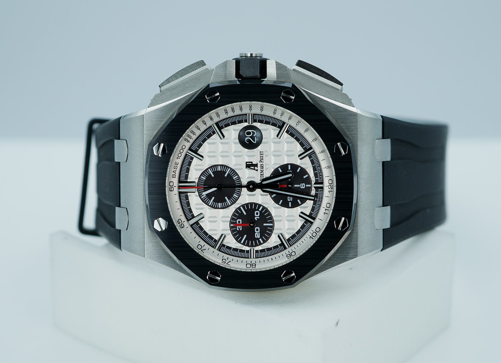 An Excellent Condition & Very Beautiful 44mm Audemars Piguet Royal Oak Offshore Chronograph Stainless Steel with Black Ceramic Bezel & White Panda Dial. It’s on Black Rubber Strap with Tang Buckle. Purchased from Audemars Piguet USA Authorized Dealer in 09.2014. The Watch had Full Services by APSC on 03.2022. Watch Running Excellent with Non Issues. Full Set.