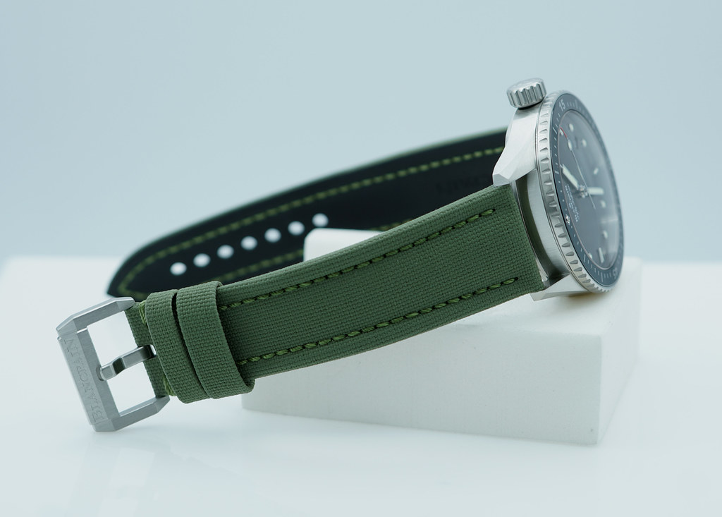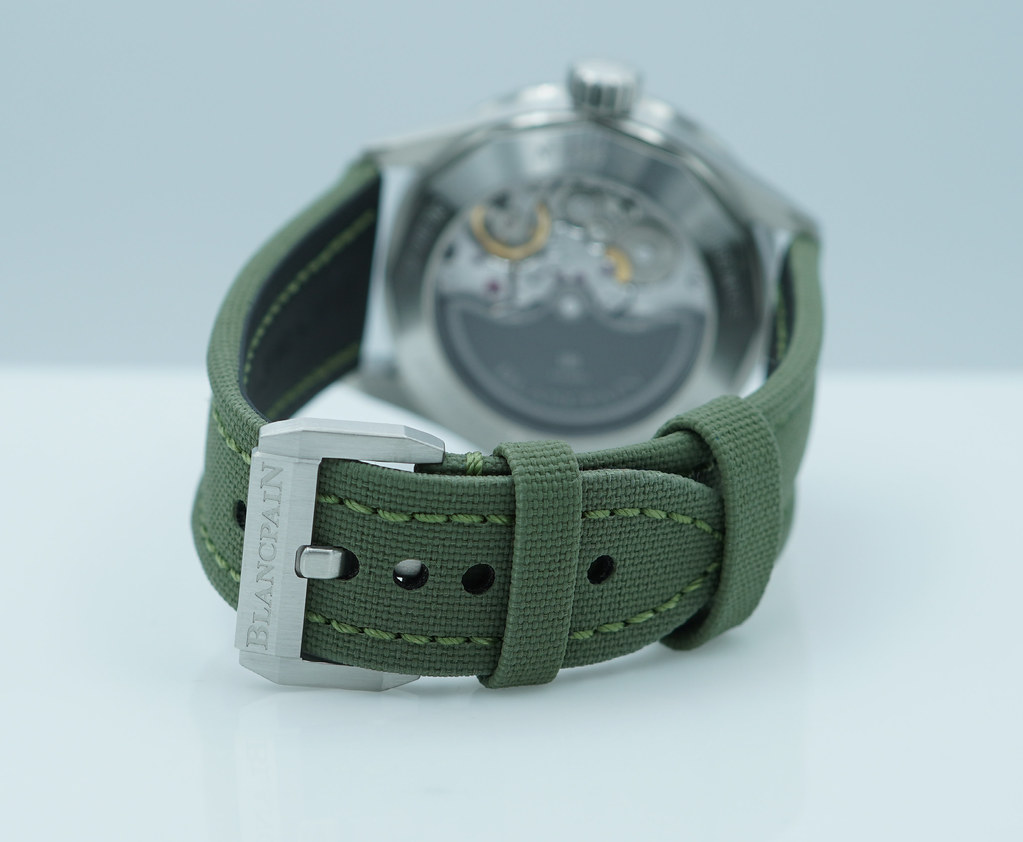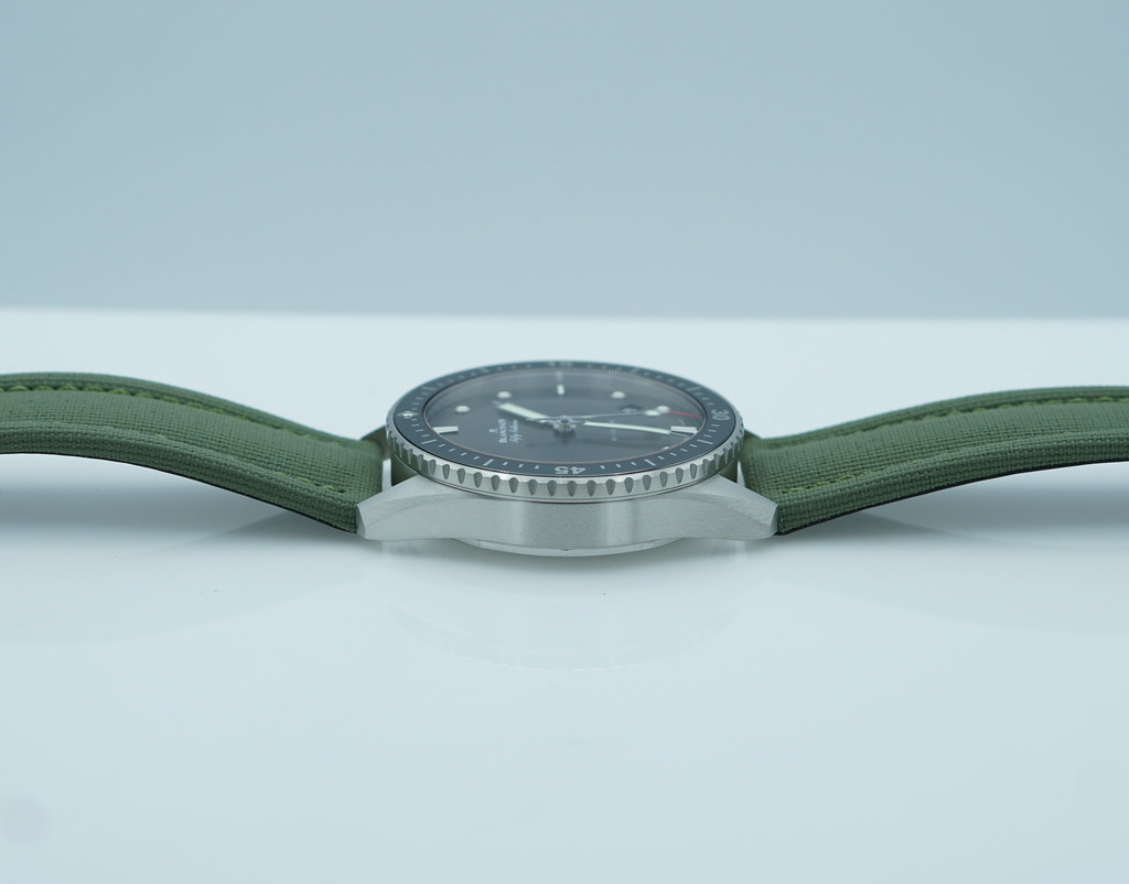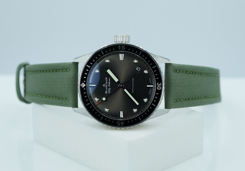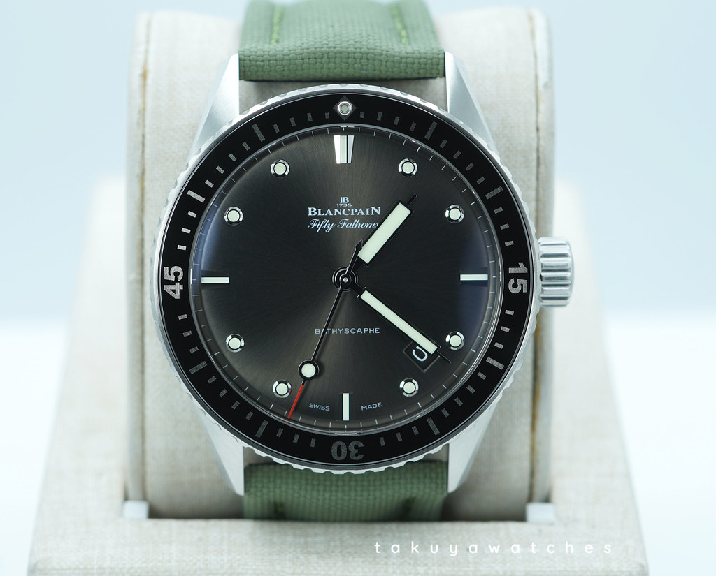 A Mint, Unpolished Condition & Very Cool 2025 43mm Blancpain Fifty Fathoms Bathyscaphe Satin-Brushed Stainless Steel Case with Black Ceramic Bezel and Sunburst Grey Dial. It’s on Black Sailcloth Strap with Pin Buckle. Just Purchased from Blancpain USA Authorized Dealer in 11.2025. Full Set with An Extra OEM Green Sailcloth Strap.