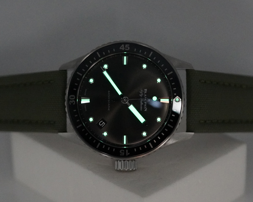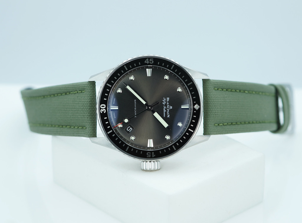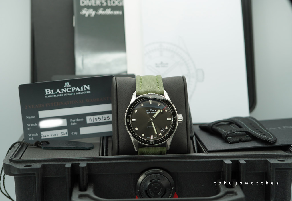 A Mint, Unpolished Condition & Very Cool 2025 43mm Blancpain Fifty Fathoms Bathyscaphe Satin-Brushed Stainless Steel Case with Black Ceramic Bezel and Sunburst Grey Dial. It’s on Black Sailcloth Strap with Pin Buckle. Just Purchased from Blancpain USA Authorized Dealer in 11.2025. Watch running perfect with Non Issues. Full Set with An Extra OEM Green Sailcloth Strap. Under 5 Years Factory Warranty.