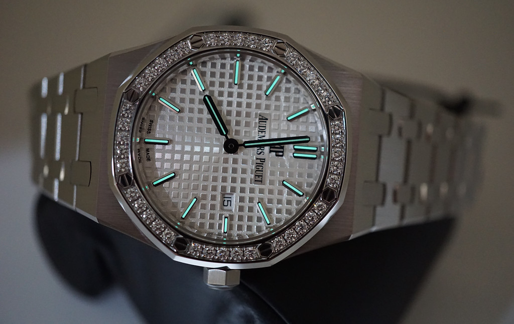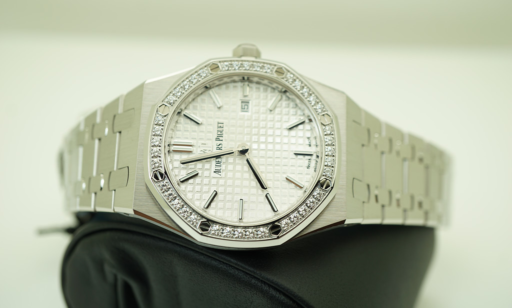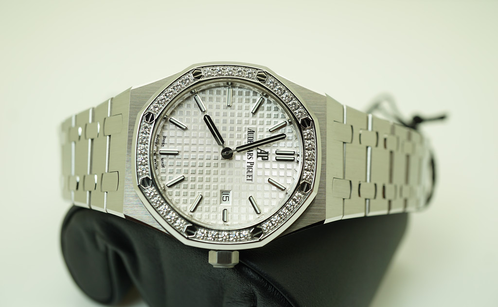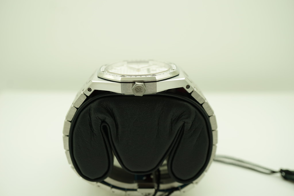 A Brand New in Box & Very Beautiful Ladies Watch 33mm Audemars Piguet Royal Oak Quartz 67651st Stainless Steel with Silvered Dial & Diamond-Set Bezel (40 Brilliant-Cut Diamonds; ~0.71 carat). Purchased from Audemars Piguet Boutique in 06.2021. Never Worn & Never Sized.