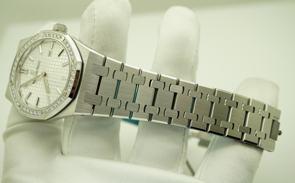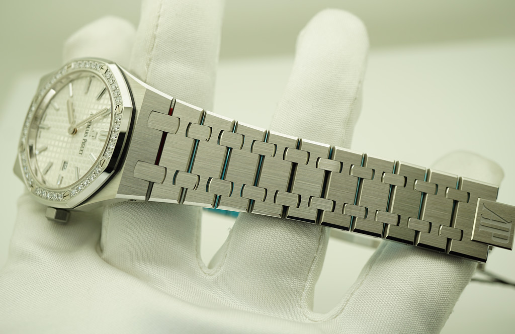 A Brand New in Box & Very Beautiful Ladies Watch 33mm Audemars Piguet Royal Oak Quartz 67651st Stainless Steel with Silvered Dial & Diamond-Set Bezel (40 Brilliant-Cut Diamonds; ~0.71 carat). Purchased from Audemars Piguet Boutique in 06.2021. Never Worn & Never Sized. Full Set & 5 Years Factory Warranty.