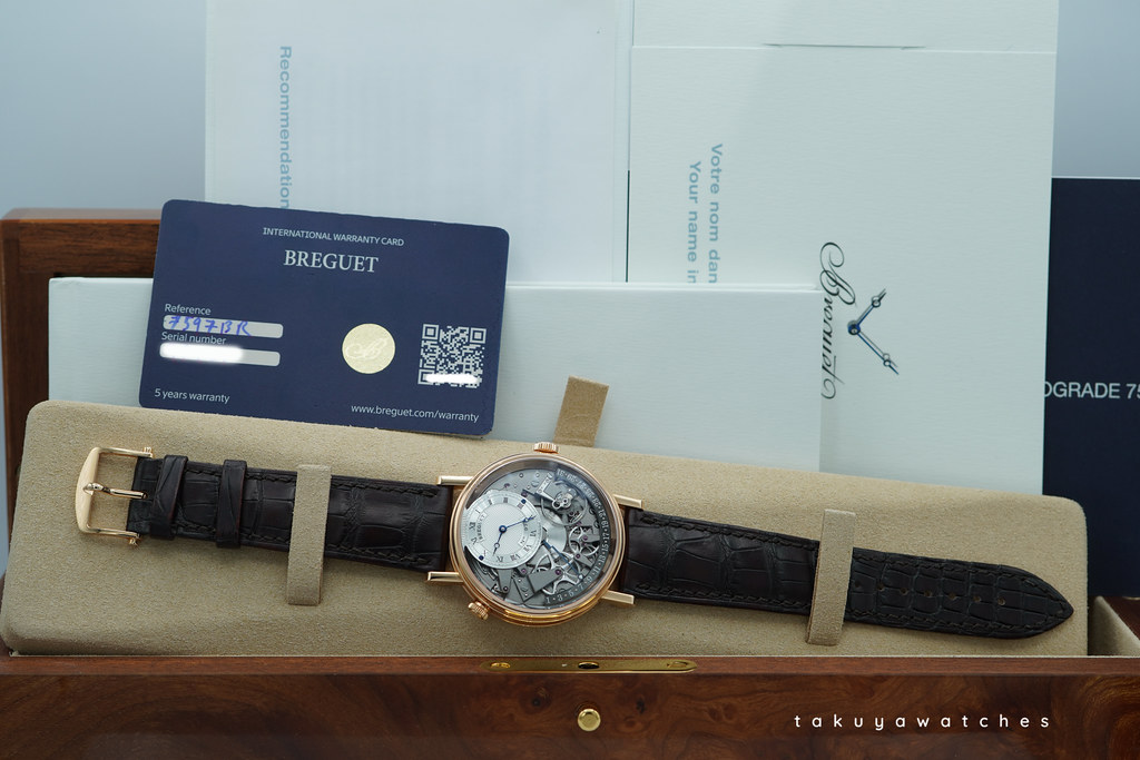 A Brand New In Box & Very Beautiful 40mm Breguet 7597BR Tradition Quantième Rétrograde Rose Gold with Silver Dial. Automatic Movement with 50 hours Power reserve. It’s on Dark Brown Leather Strap with Rose Gold Tang Buckle. Purchased from Breguet Authorized Dealer in 11.2025.