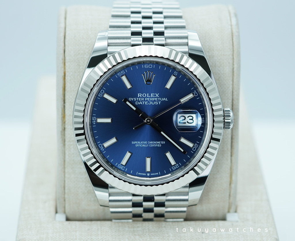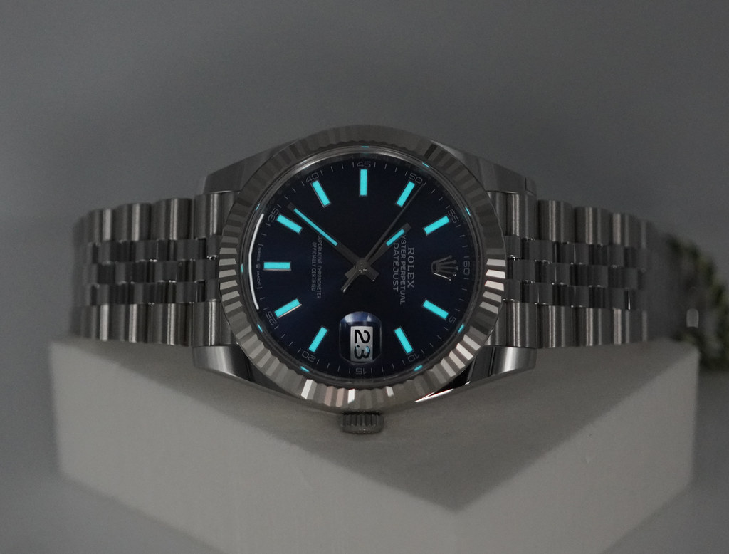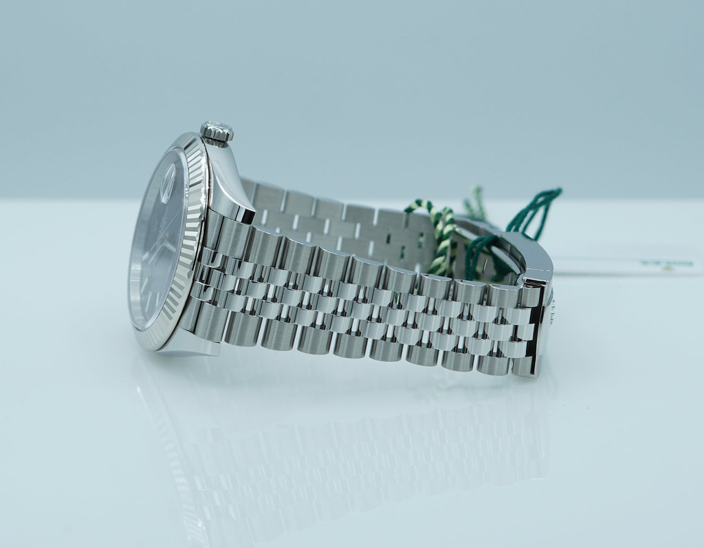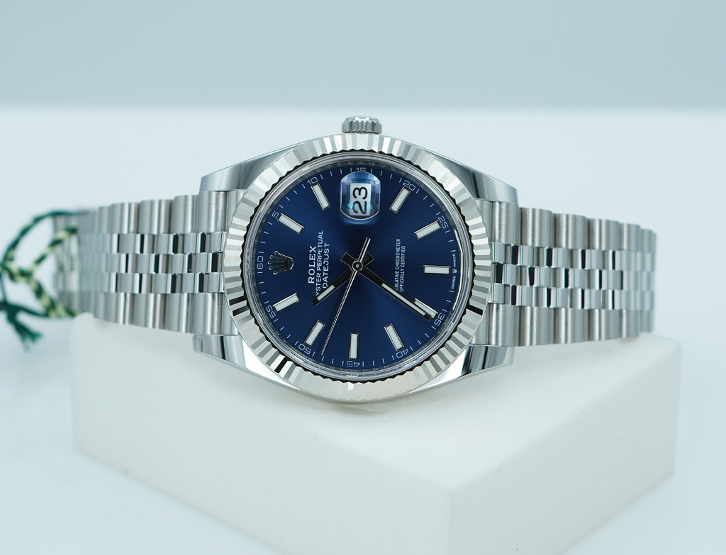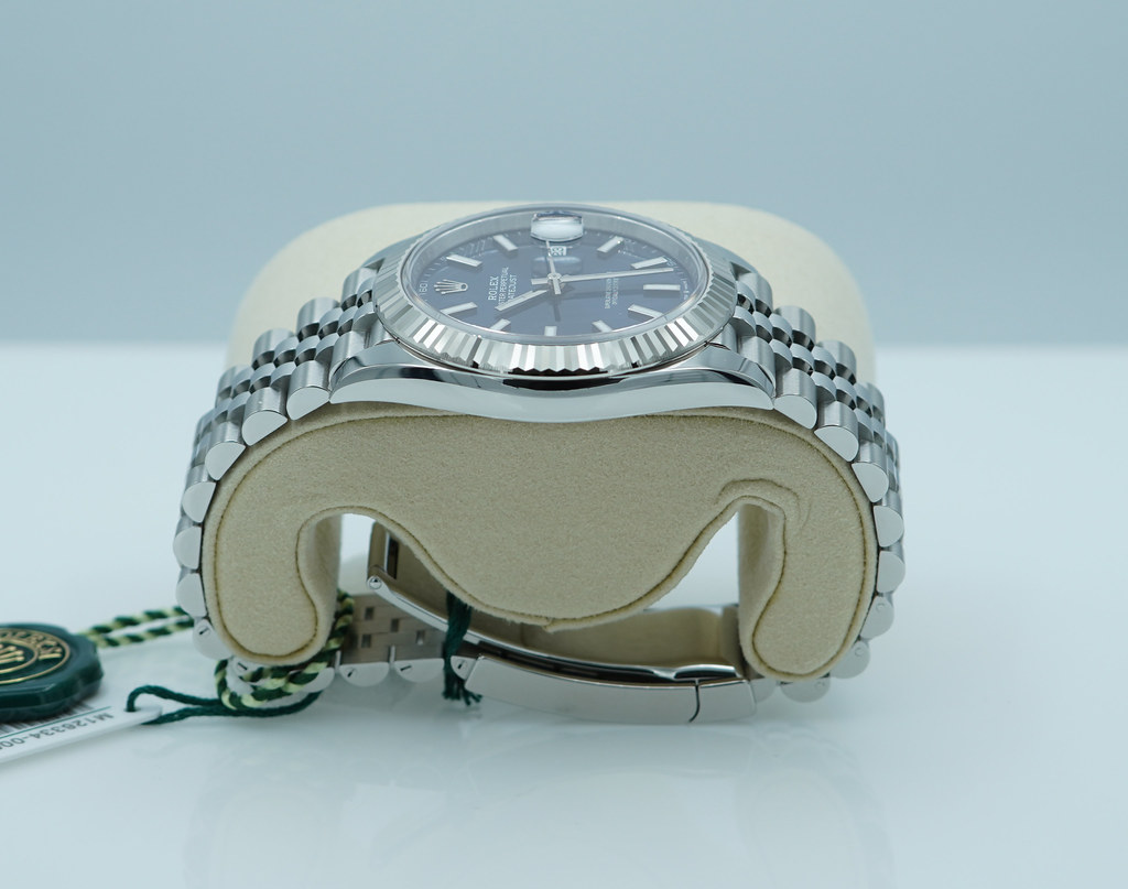 A Brand New In Box & Very Beautiful 2025 41mm Rolex 126334 Datejust 41 Stainless Steel with 18K White Gold Fluted Bezel & Blue Index Dial. It’s on Jubilee Bracelet. Purchased from Rolex Authorized Dealer in 11.2025.