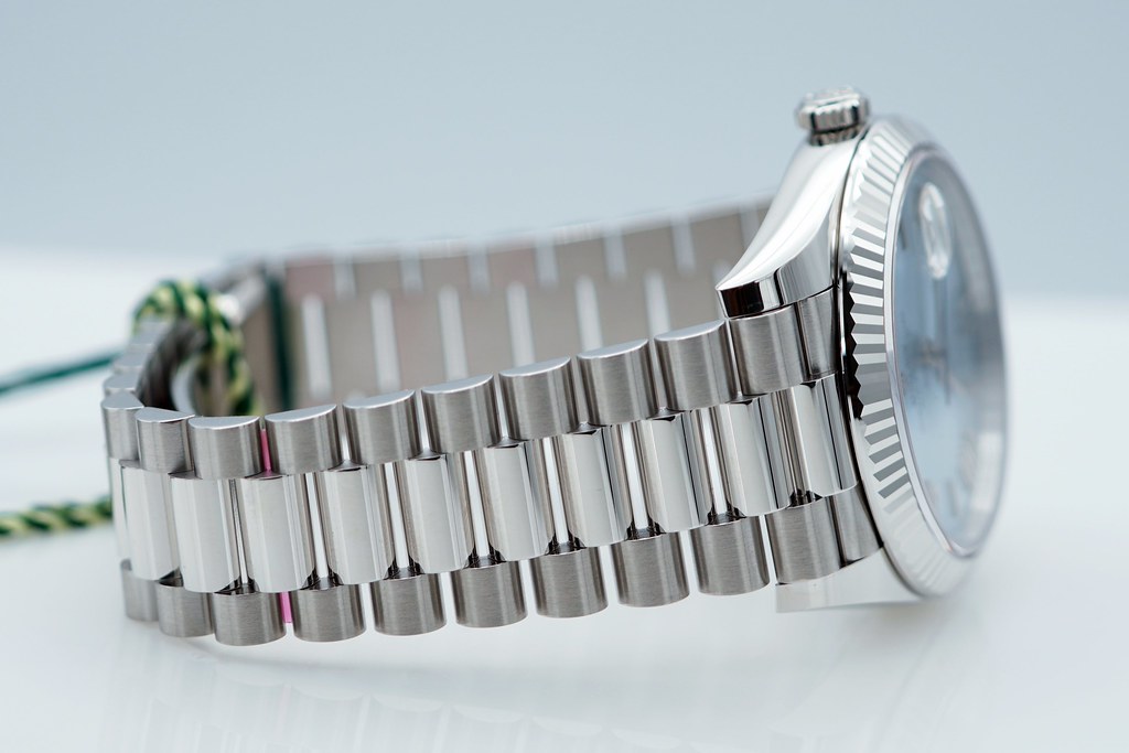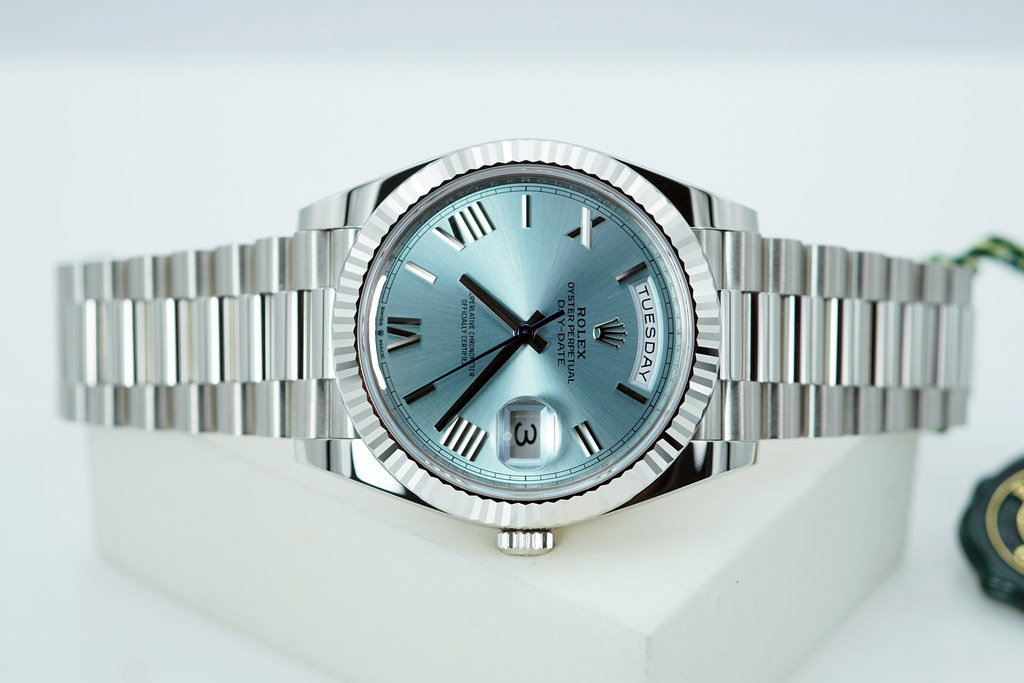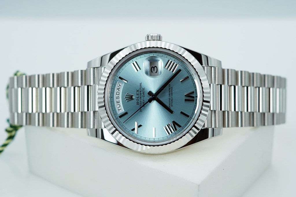 A Brand New In Condition & Very Beautiful New Model 2026 40mm Rolex 228236 Platinum Day-Date President with Fluted Platinum Bezel & Ice Blue Roman Numerals Dial. Just Purchased from Rolex Authorized Dealer in 04.2026. Unworn & Unsized with Some Stickers still intact. Full Set & Under 5 Years Factory Warranty.