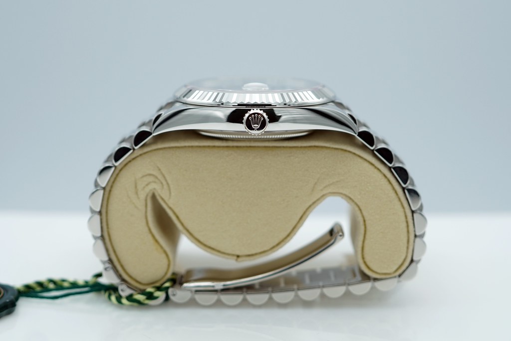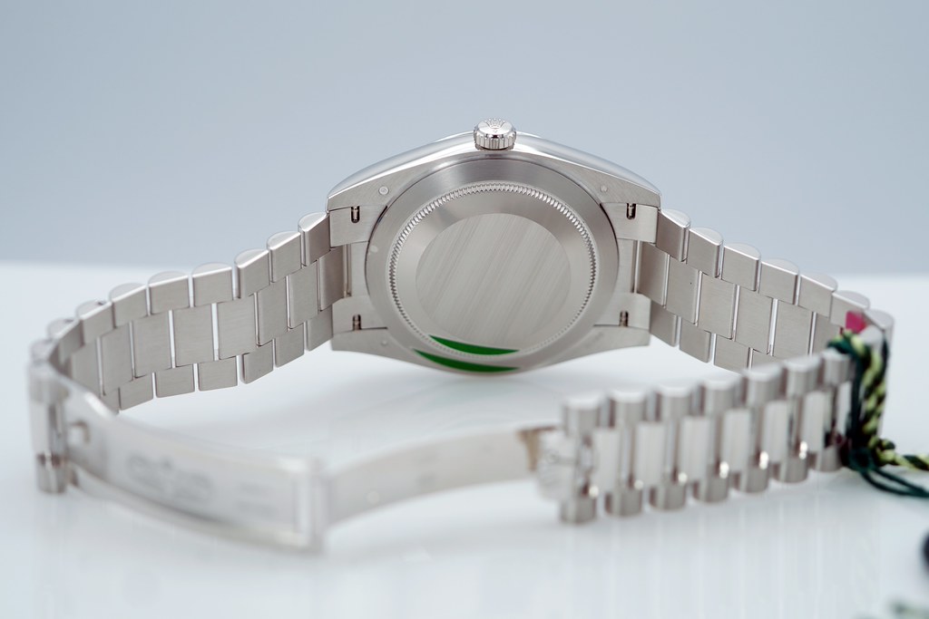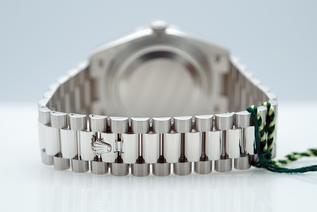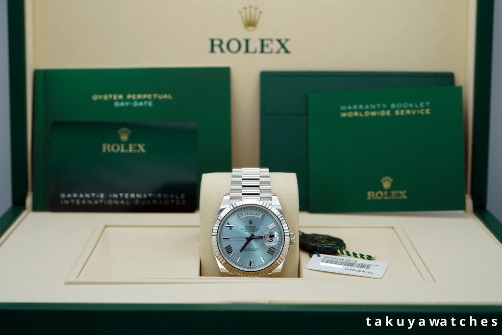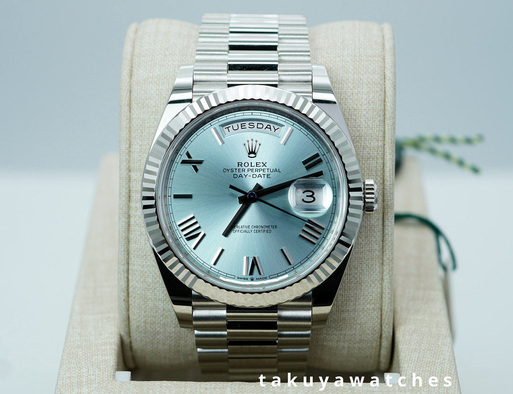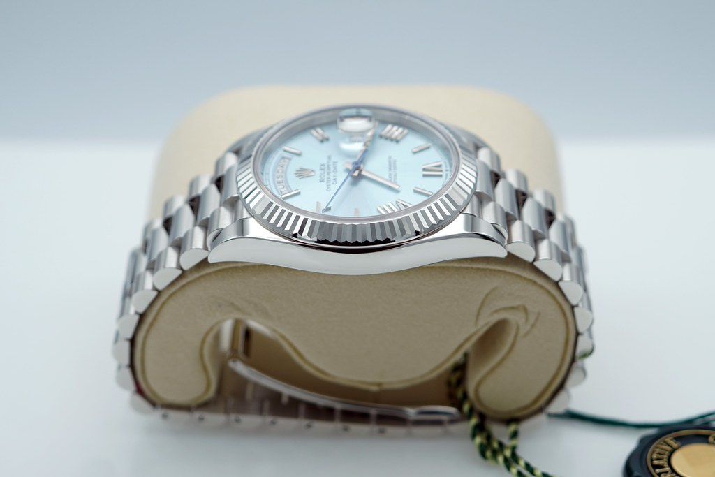 A Brand New In Condition & Very Beautiful New Model 2026 40mm Rolex 228236 Platinum Day-Date President with Fluted Platinum Bezel & Ice Blue Roman Numerals Dial. Just Purchased from Rolex Authorized Dealer in 04.2026. Unworn & Unsized with Some Stickers still intact.