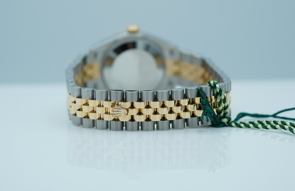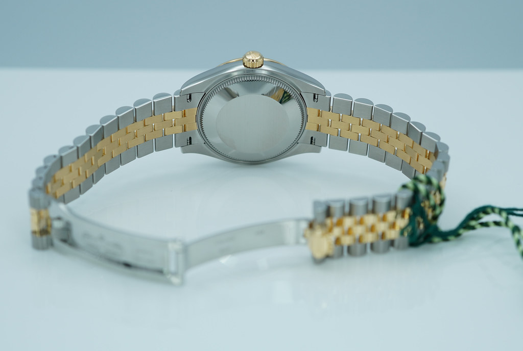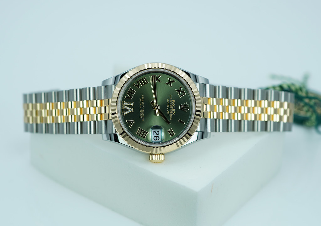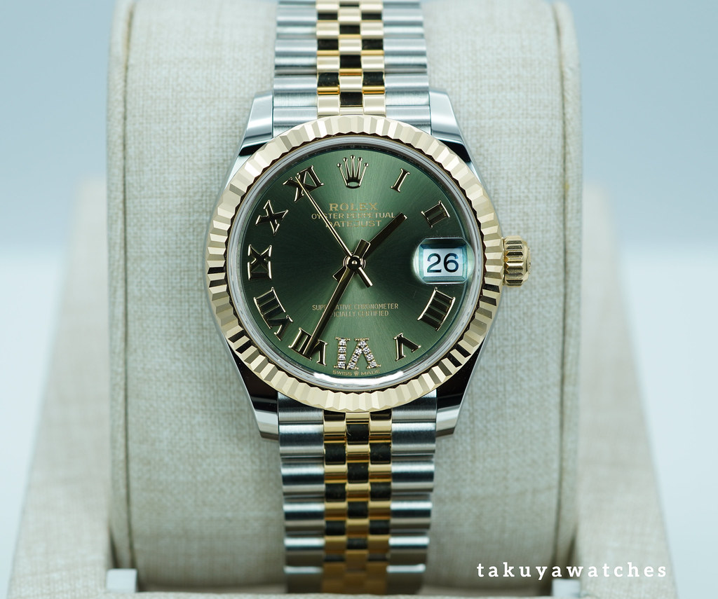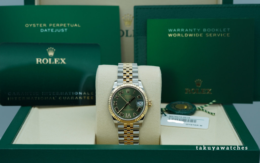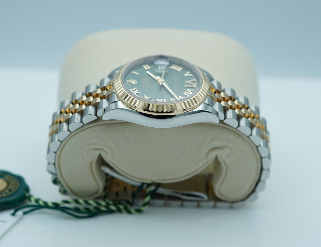 A Brand New In Box & Very Beautiful 2025 31mm Rolex 278273 Datejust Midsize 18K Yellow Gold & Stainless Steel with Olive Green VI Diamonds Dial. It’s on 18K Yellow Gold & Stainless Steel Jubilee Bracelet. Purchased from Rolex Authorized Dealer in 09.2025.