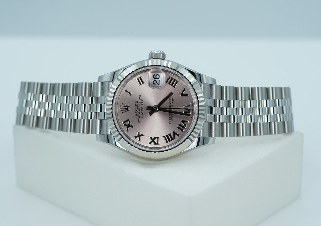 A Brand New in Box & Very Beautiful 2025 31mm Rolex 278274 Datejust Stainless Steel with 18K White Gold Fluted Bezel & Pink Roman Numerals Dial. Its on Jubilee Bracelet. Purchased from Rolex Authorized Dealer in 12.2025.