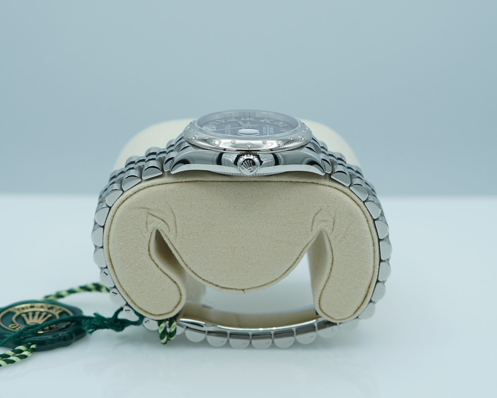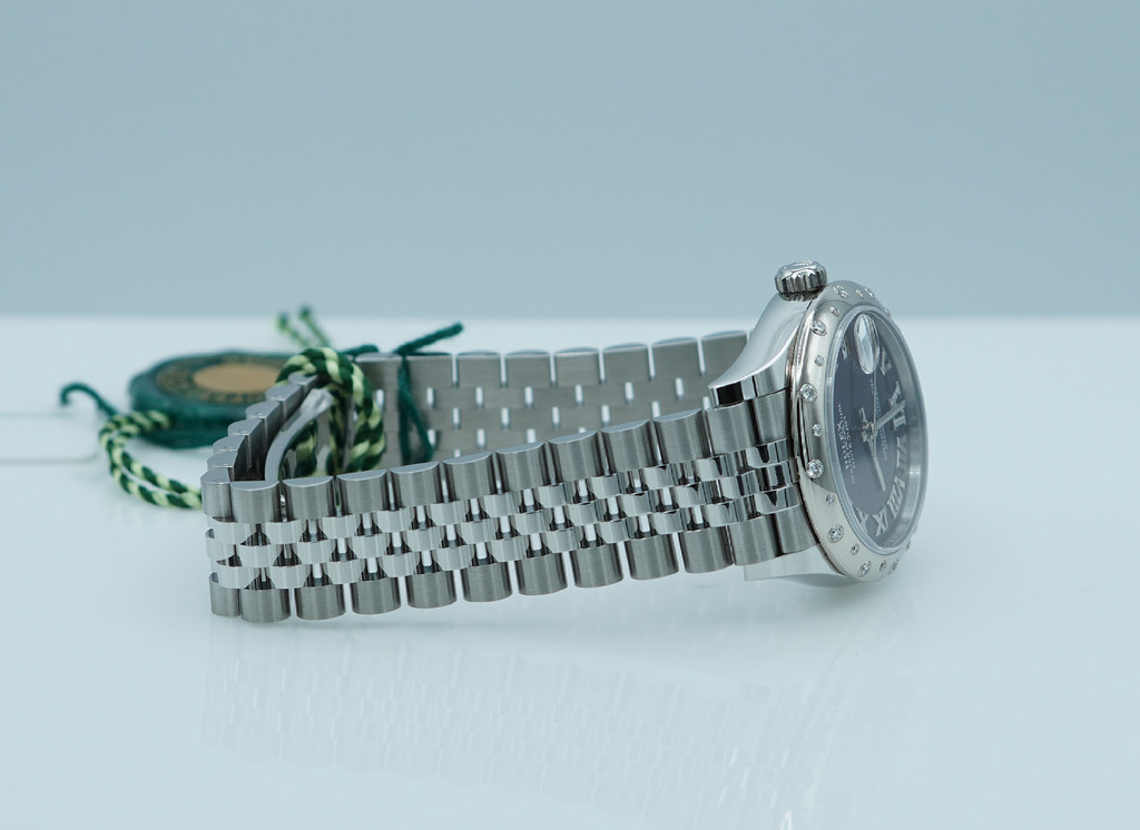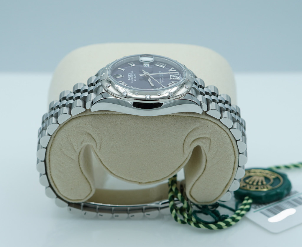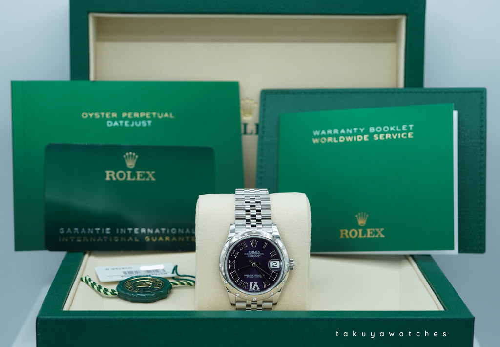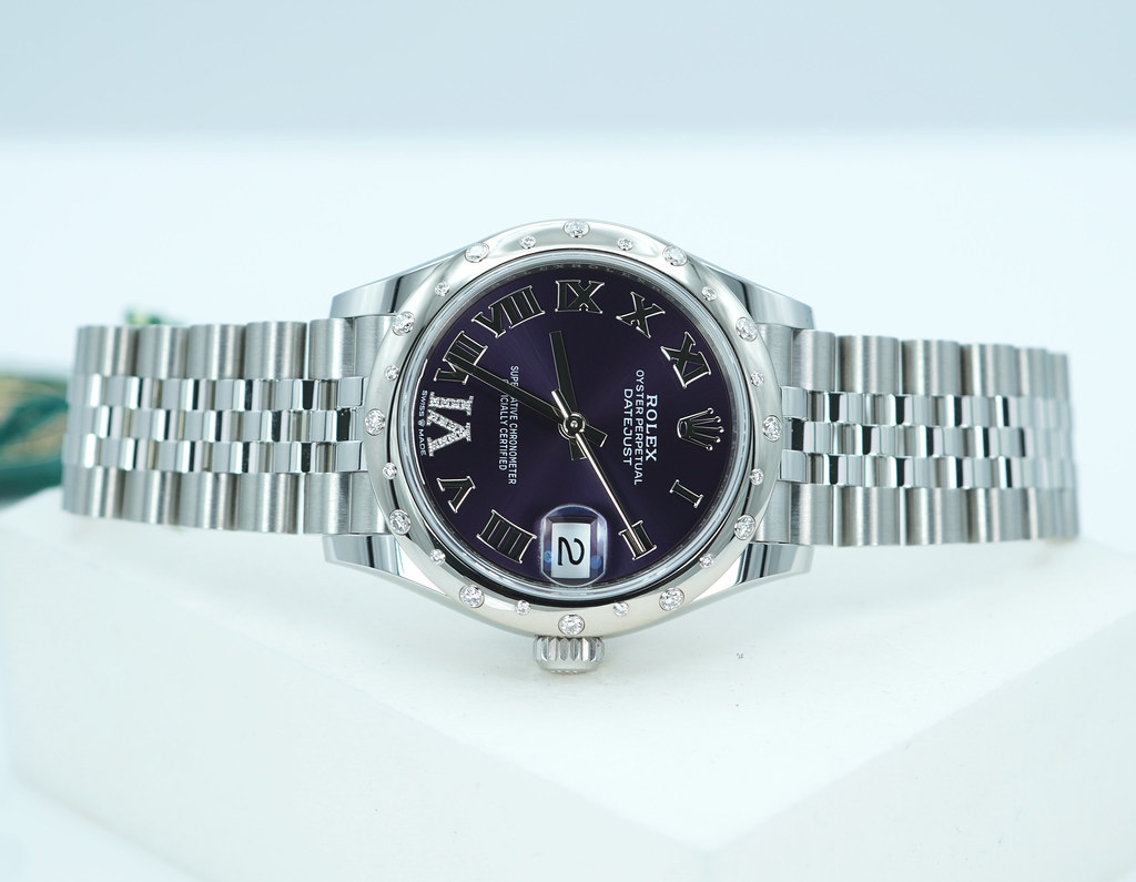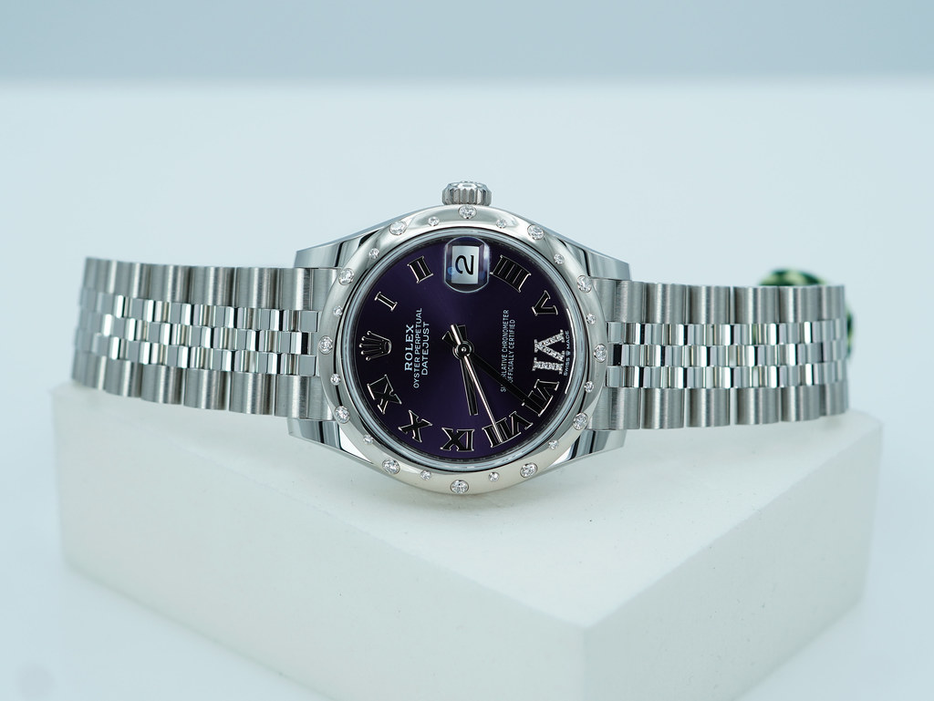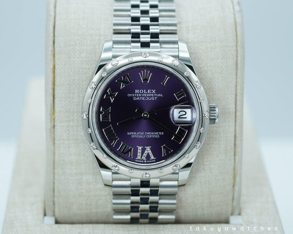 A Brand New in Box & Very Beautiful 2025 31mm Rolex 278344RBR Datejust Stainless Steel with 18K White Gold Diamond-Set Bezel & Aubergine Purple Roman Numerals VI 11 Diamonds Dial. Its on Jubilee Bracelet. Purchased from Rolex Authorized Dealer in 10.2025.