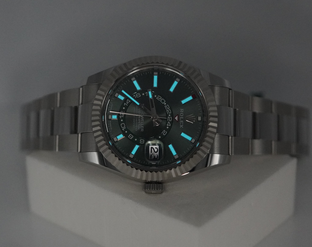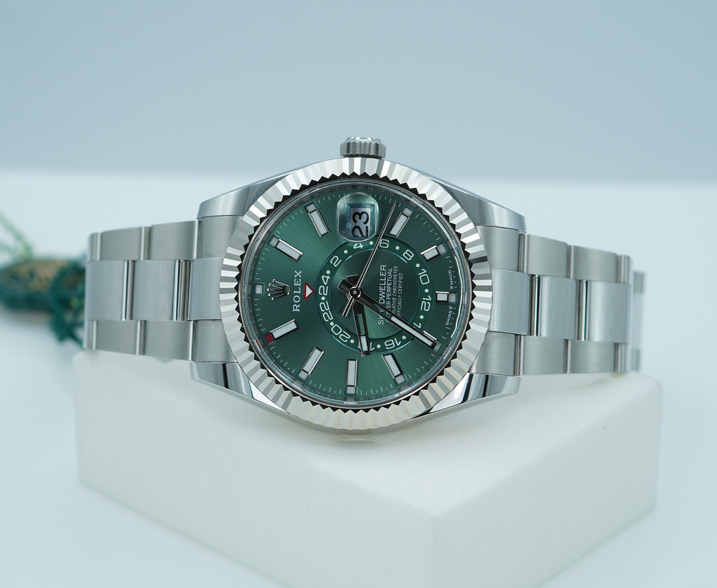 A Brand In Box & Very Beautiful New Model 2025 42mm Rolex Annual Calendar 336934 Skydweller Stainless Steel with 18K White Gold Fluted Bezel & Mint Green Dial. It’s on Oyster Bracelet. Purchased from Rolex Authorized Dealer in 11.2025.