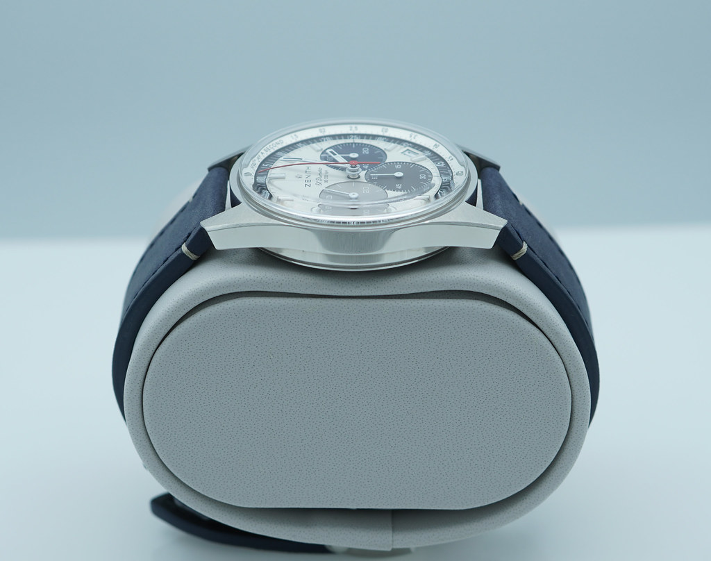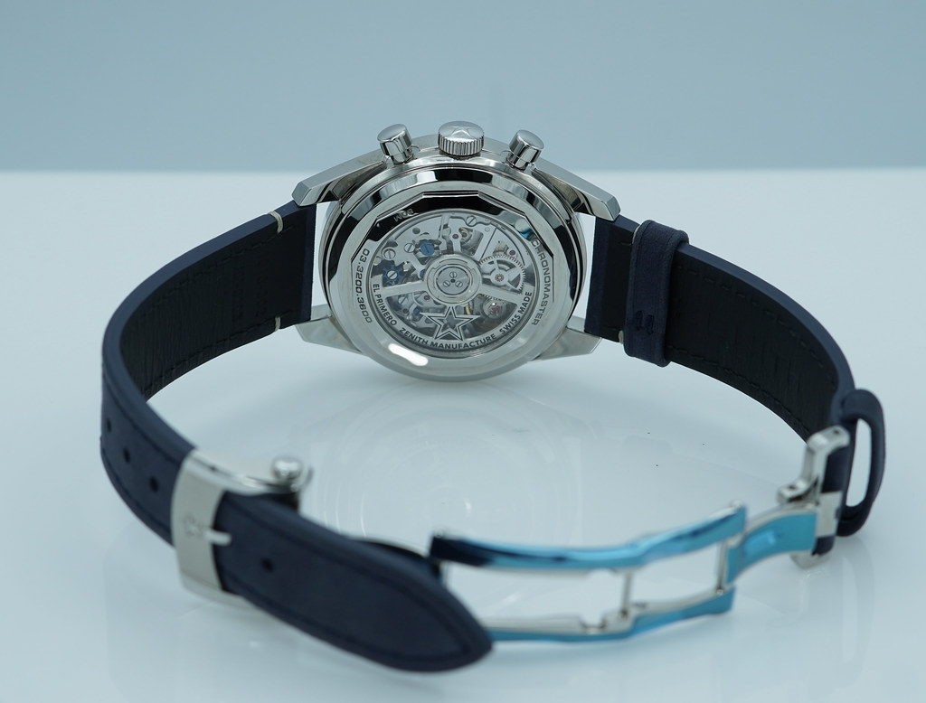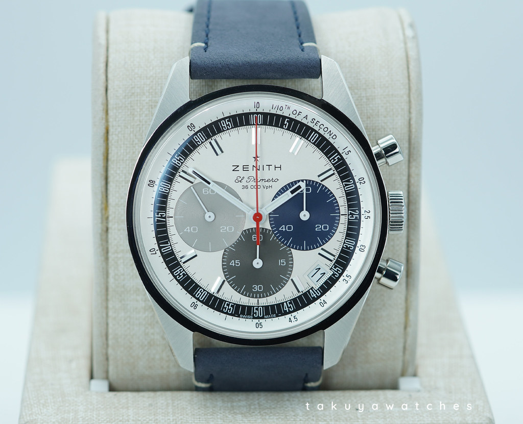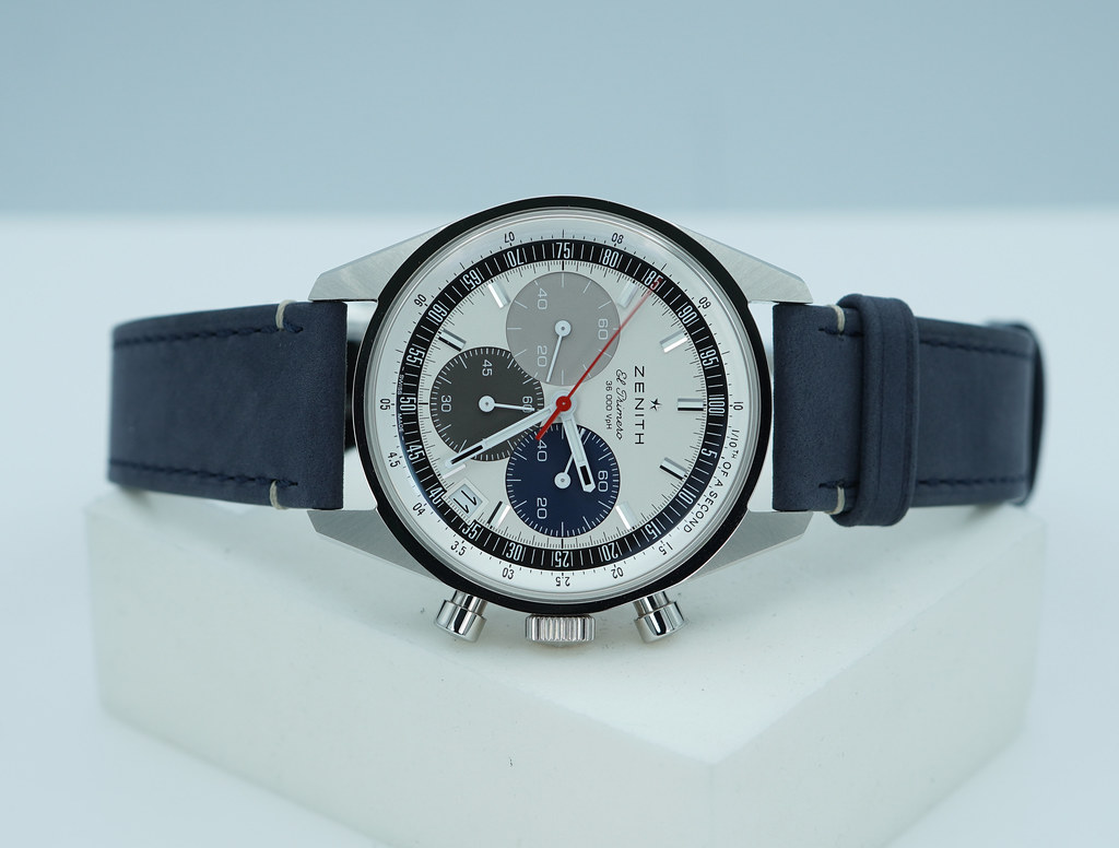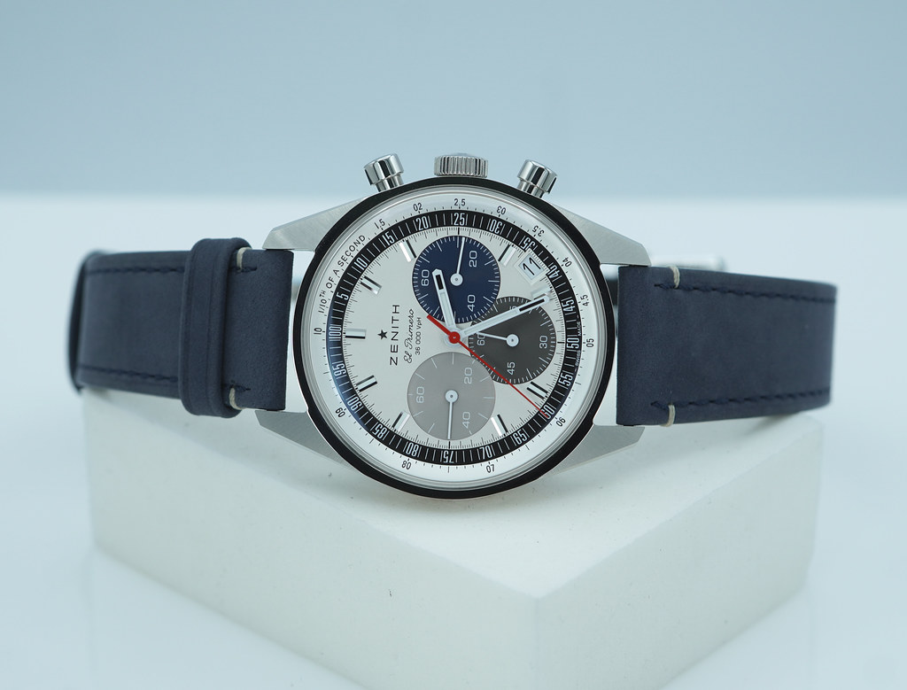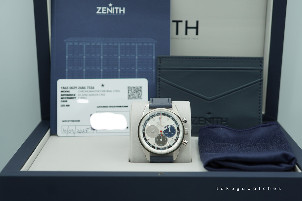 A Brand New In Box & Very Beautiful 2025 38mm Zenith El Primero Chronomaster Original with Iconic Tri-Color Dial. Stainless Steel Case on Blue Nubuck Claf Leather Strap with Deployant Clasp. El Primero 3600 Movement. Just Purchased from Zenith Authorized Dealer in 10.2025.