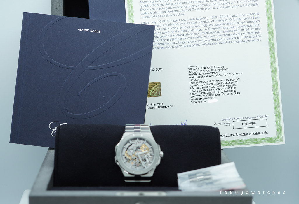 Complete Packages/Set (Double Boxes Set), & Complete Manual/Warranty Certificated dated in 2024 from Chopard NY Boutique. The Watch still has Plenty of Factory Warranty left.
