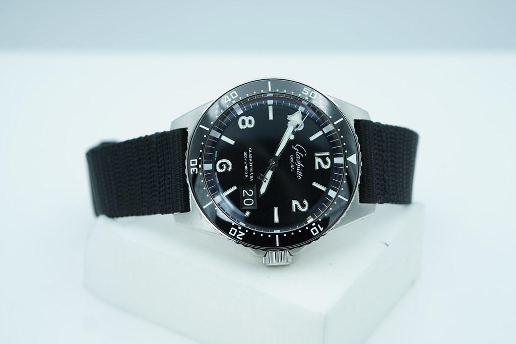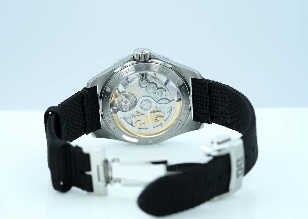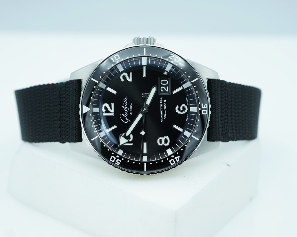 An Excellent, Unpolished Condition & Very Beautiful 2024 43.2mm Glashutte Original SeaQ Panorama Date Stainless Steel with Beautiful Black Ceramic Bezel & Galvanic Black Dial. Glashutte Original Automatic 36-13 Movement has an approximate power reserve of 100 hours. Purchased from Glashutte USA Authorized Dealer in 11.2024. Watch Running Perfect with Non Issues. Full Links. Under 2 Years Factory Warranty. Full Set with Extra Glashutte Nato Strap with Steel Deployant Clasp.