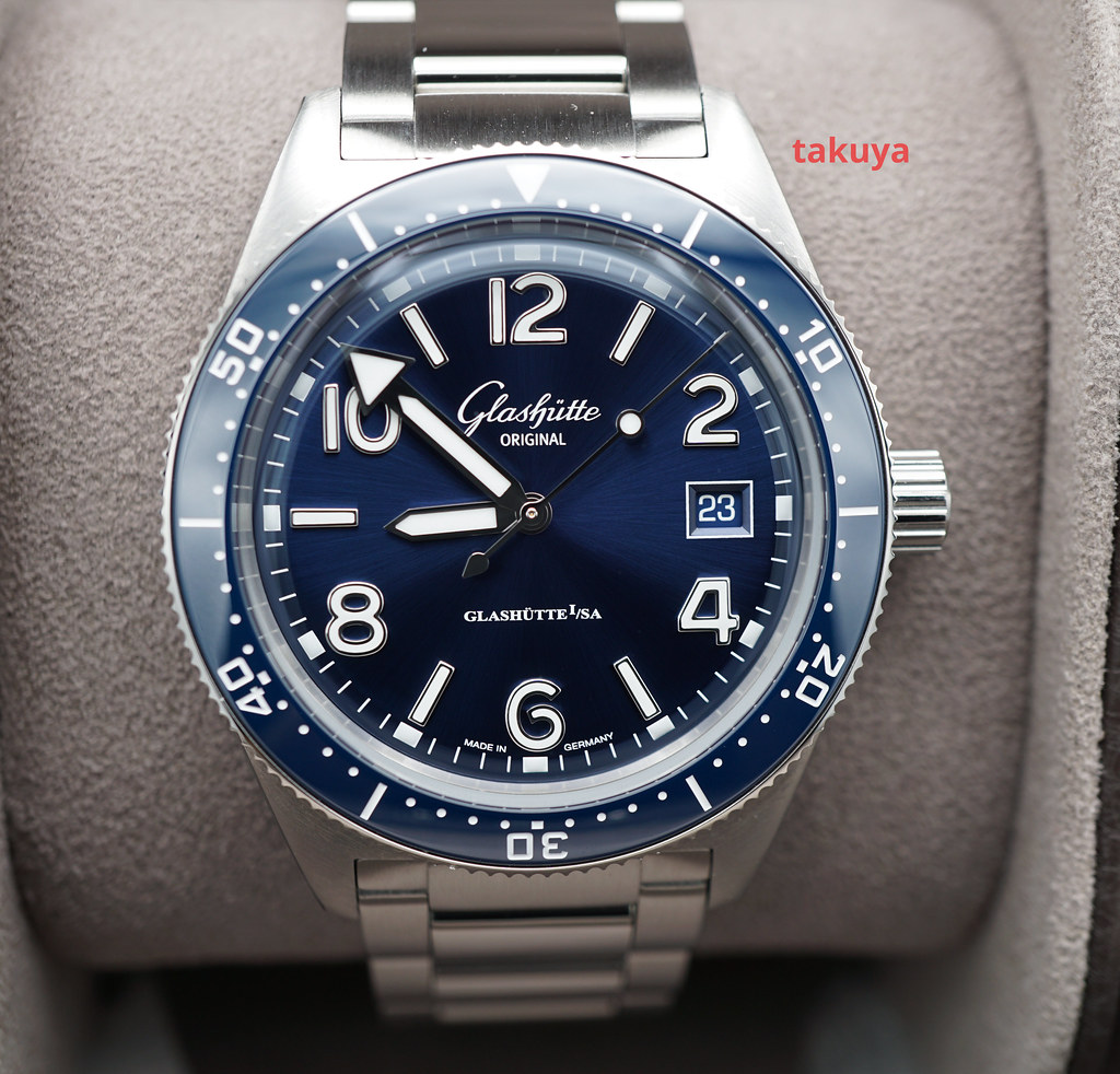 An Excellent Condition & Very Beautiful 39.5mm Glashutte Original SeaQ Stainless Steel with Beautiful Blue Ceramic Bezel & Sunburst Blue Dial. Glashutte Original Automatic 39-11 Movement has an approximate power reserve of 40 hours. Purchased from Glashutte USA Authorized Dealer in 10.2021.