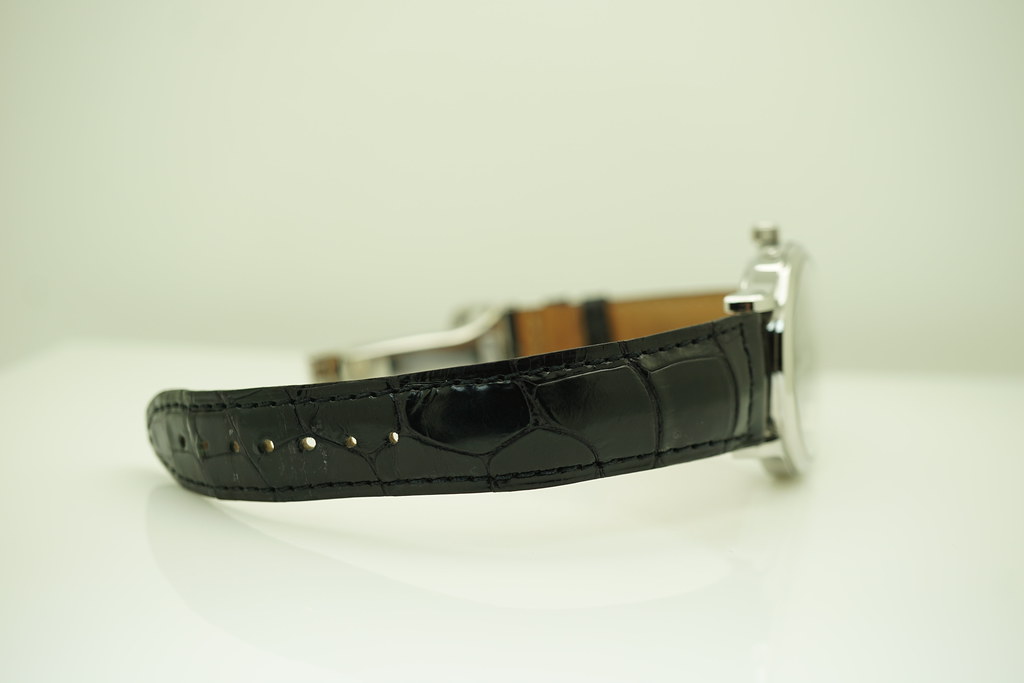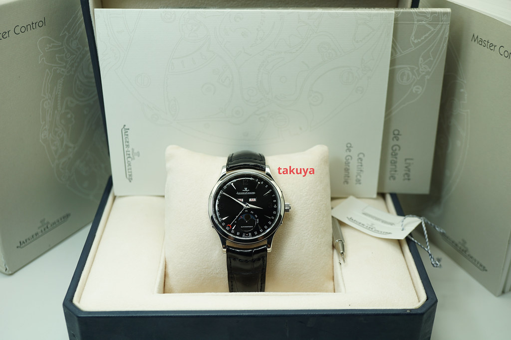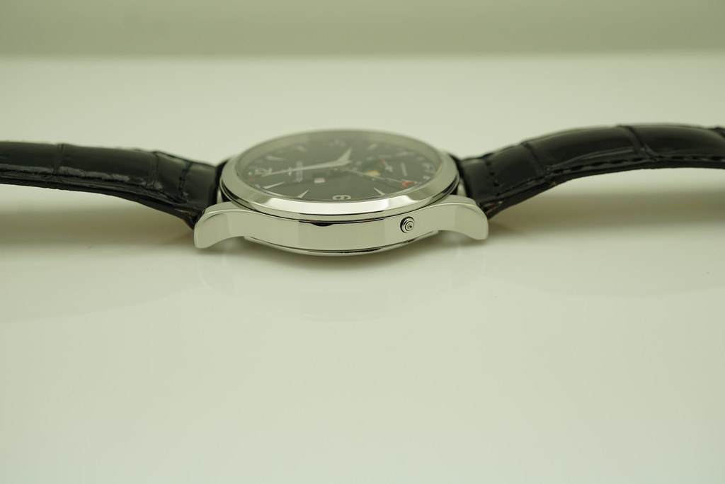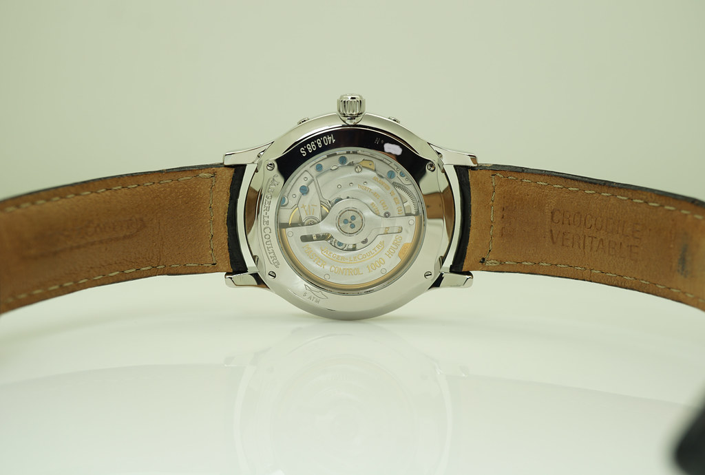 An Excellent Condition & Very Beautiful 37mm Jaeger LeCoultre Q140898S Master Moon Calendar Automatic with Black Dial, Stainless Steel Case on Black Alligator Leather Strap w/ Stainless Steel Deployant Clasp. Purchased from Jlc USA Authorized Dealer.