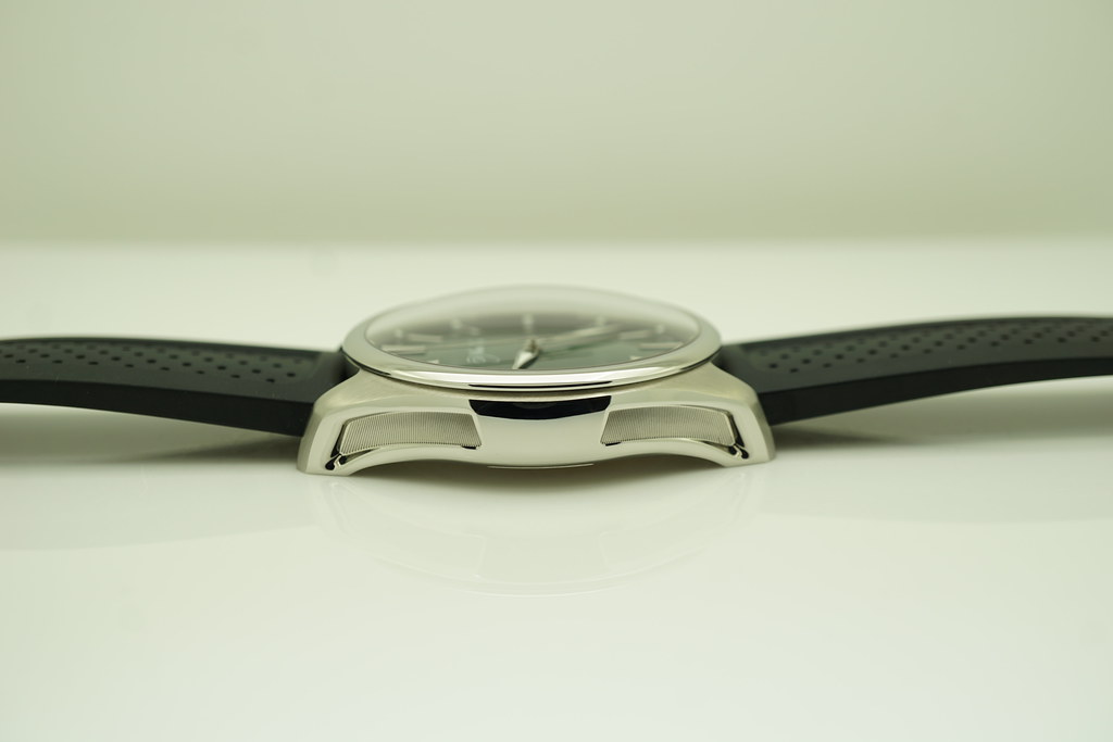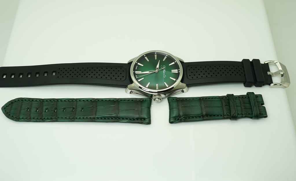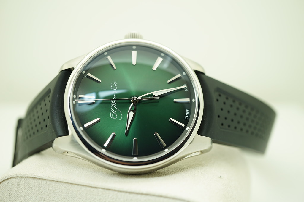 A Mint, Unpolished Condition & Very Beautiful 2021 Limited Edition of 15 Pieces Only 42.8mm H. Moser & Cie Pioneer Centre Seconds “Cure ALS”, Automatic Calibre HMC 200 with An Upgrade 18K Solid Red Gold Rotor. Stainless Steel Case with Curved Sapphire Crystal, CURE ALS Green Fumé Dial with Sunburst Pattern, on Green Alligator Leather Strap & Additional Black Rubber Strap with Steel Pin Buckle. Purchased from H. Moser & Cie Authorized Dealer in 11.2021. Watch running perfect with Non Issues. Full Set & Under 2 Years Factory Warranty.