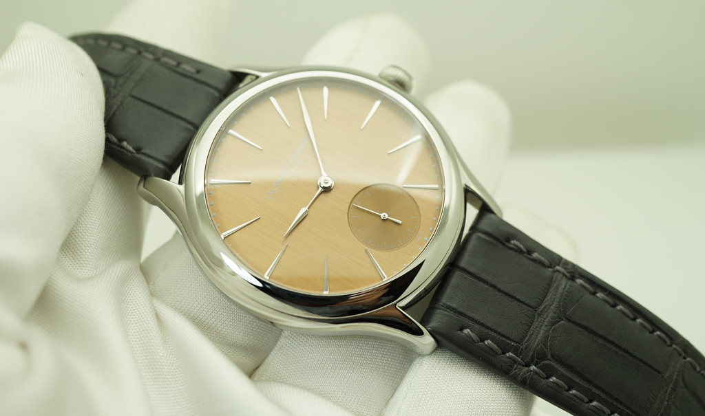 A Mint, Unpolished Condition & Very Beautiful 40mm Laurent Ferrier Galet Micro-Rotor Stainless Steel Circular Case with the manufactures’ signature onion-shaped crown, Beautiful Red-Gold Brushed Salmon Dial or Autumn Dial with 18K White Gold Index Markers and Hands, on Grey Alligator Strap with Steel Deployant Clasp, Superb micro-rotor LF 229.01 self-winding movement with 72 hours Power Reserve. Purchased from Laurent Ferrier Authorized Dealer in 02.2020. Watch Running Perfect with Non Issues. Full Set & Under 2 Years Factory Warranty.