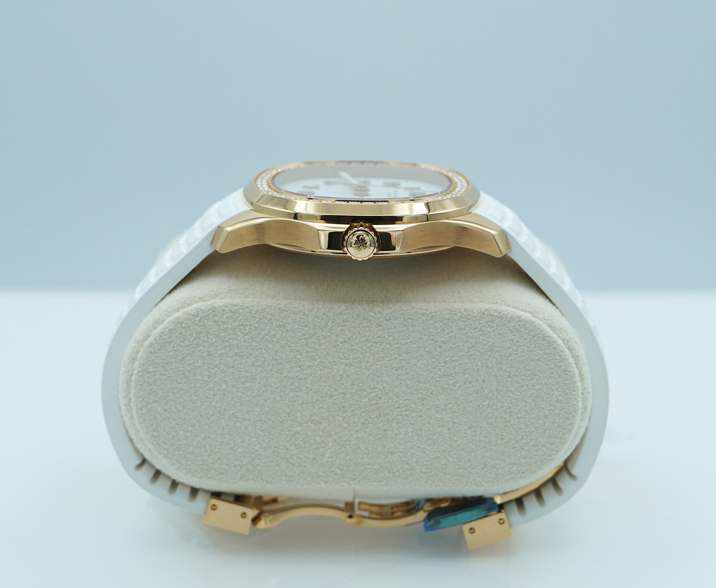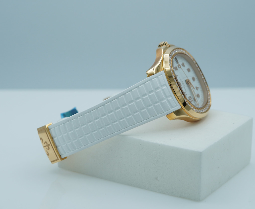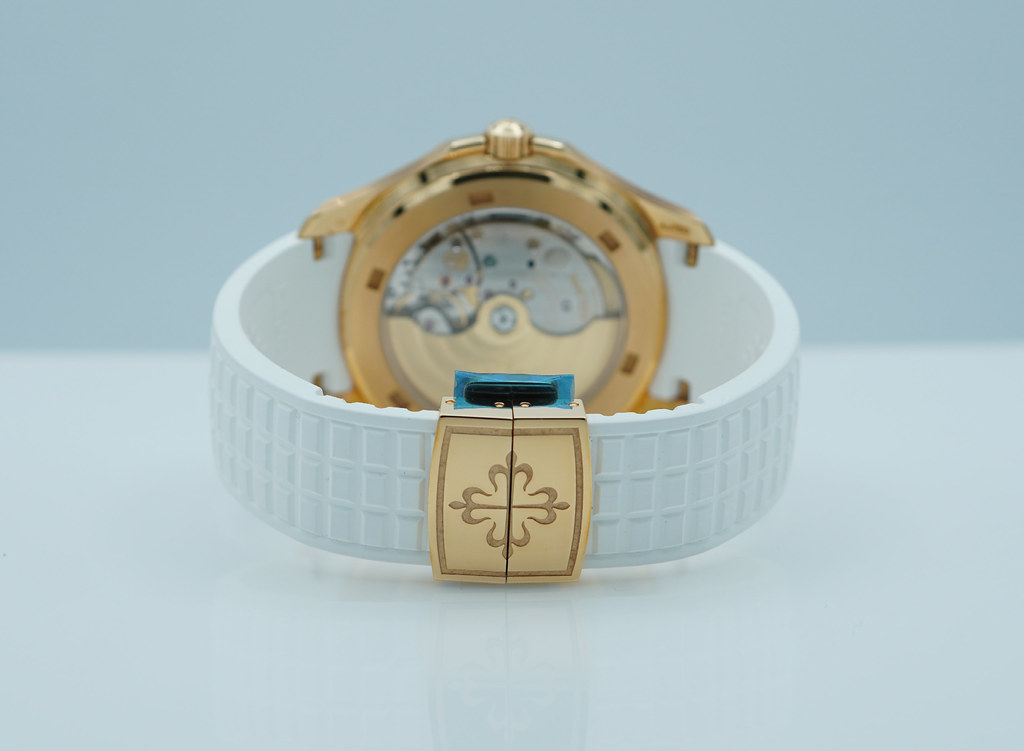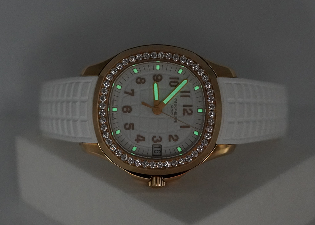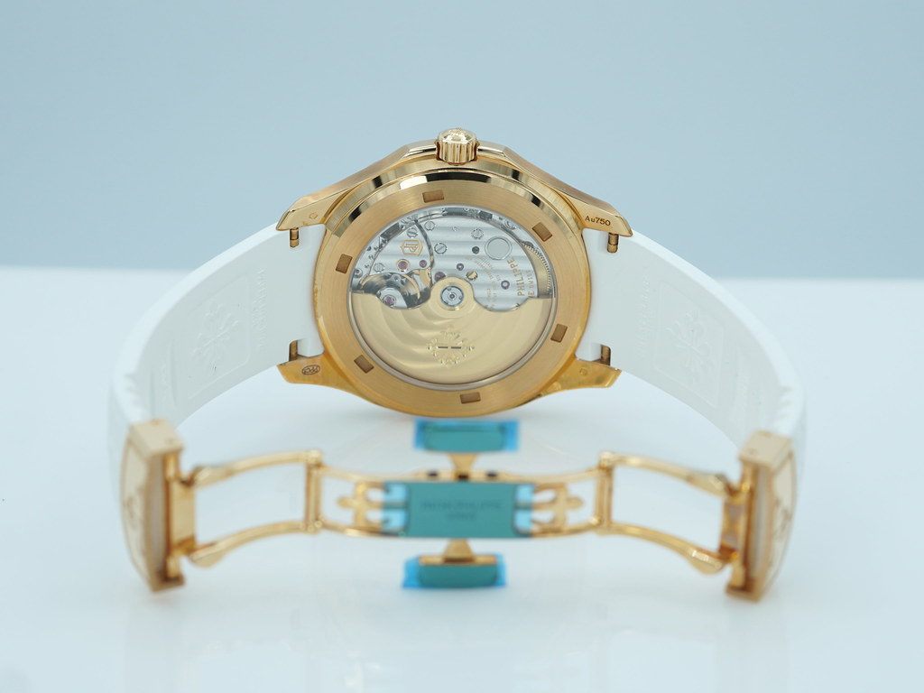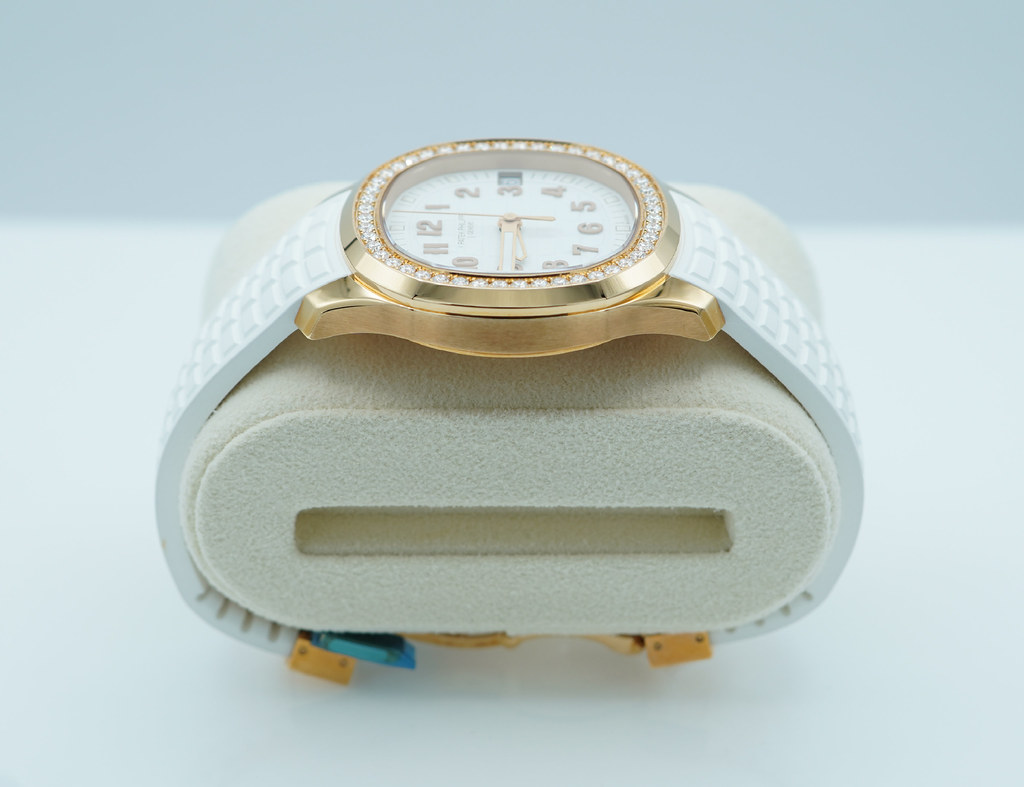 A New Old Stock & Very Beautiful Discontinued 2021 38mm Patek Philippe Aquanaut Luce 5268/200R 18K Rose Gold with White Pattern Dial & Bezel Factory Set with 48 brilliant cut diamonds. Its on White Tropical Rubber Strap with New Style Rose Gold Patek Philippe Deployant Clasp. New Automatic Movement 26-330 S C. Purchased from Patek Philippe USA Authorized Dealer in 2021. Unworn.