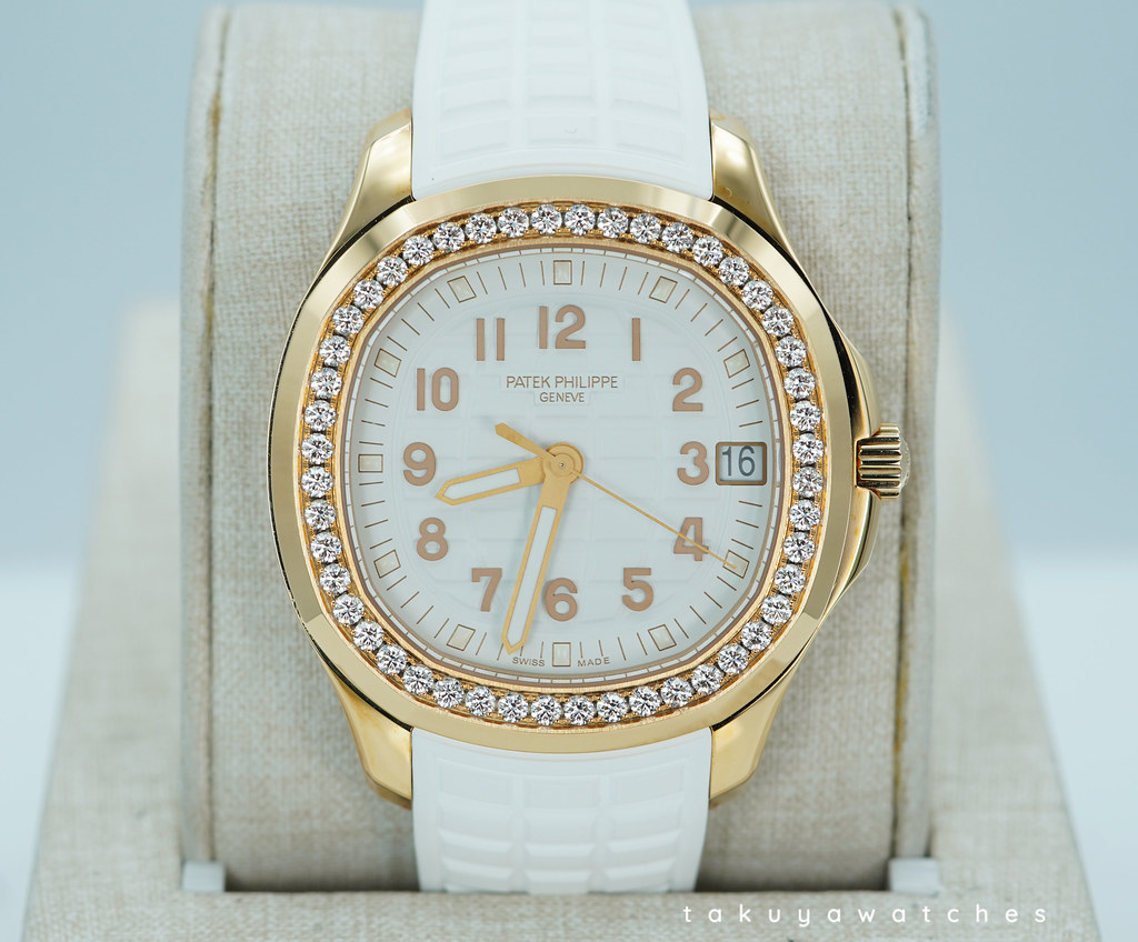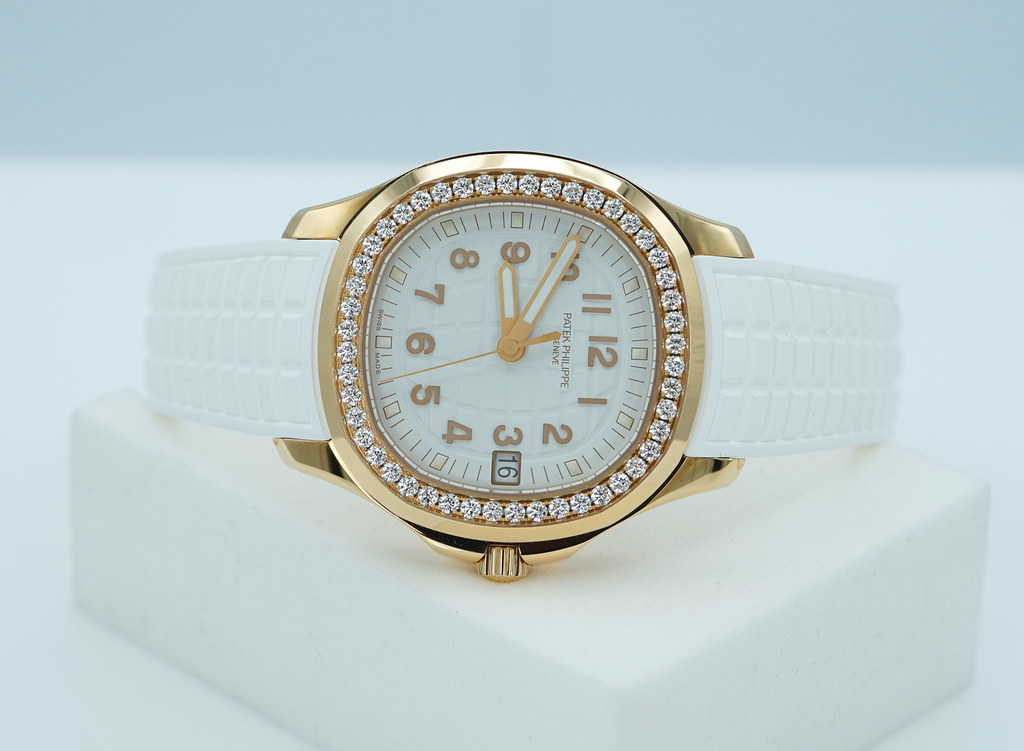 A New Old Stock & Very Beautiful Discontinued 2021 38mm Patek Philippe Aquanaut Luce 5268/200R 18K Rose Gold with White Pattern Dial & Bezel Factory Set with 48 brilliant cut diamonds. Its on White Tropical Rubber Strap with New Style Rose Gold Patek Philippe Deployant Clasp. New Automatic Movement 26-330 S C. Purchased from Patek Philippe USA Authorized Dealer in 2021. Unworn. Full Set.