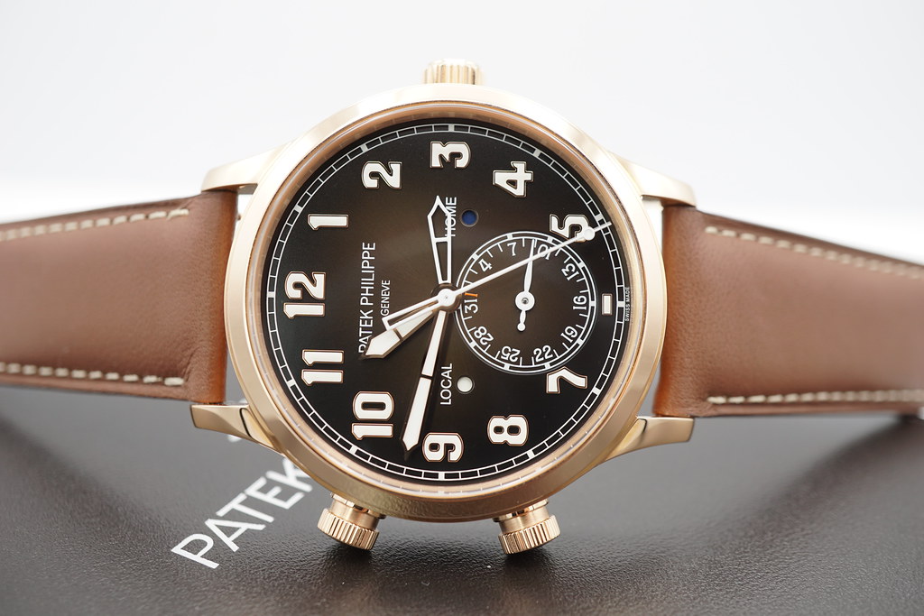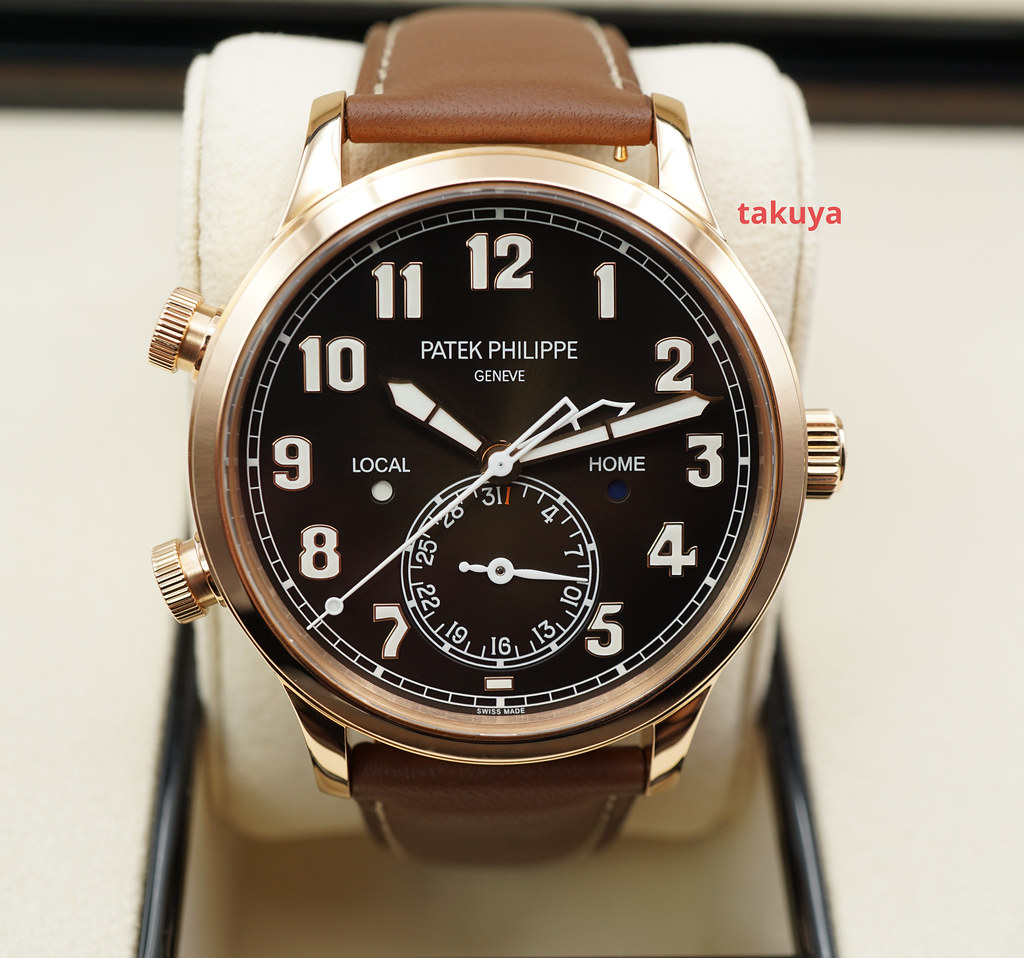 A New Old Stock & Very Beautiful 42mm Patek Philippe Complications 5524 Calatrava Pilot Travel Time Automatic, 18K Rose Gold Case with Brown Sunburst Dial. Its on Brown Calf Leather Strap with Rose Gold Pin Buckle. Purchased from Patek Philippe Authorized Dealer in 06.2018.