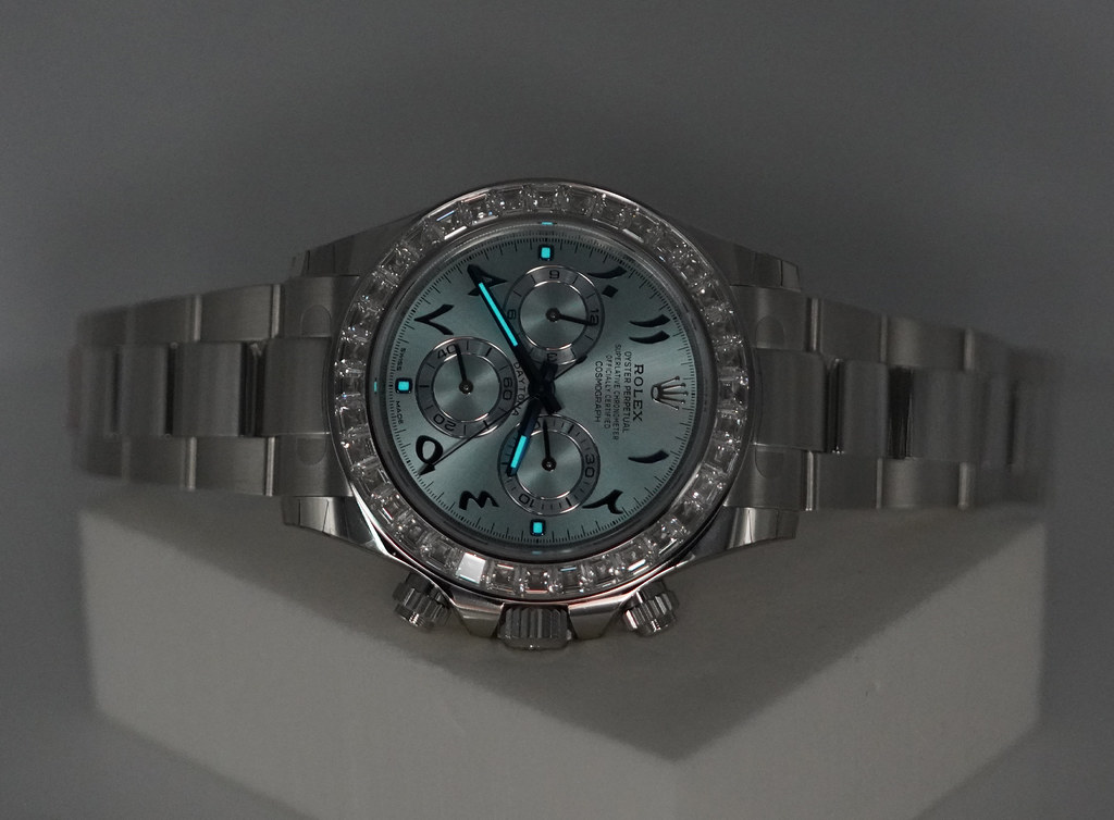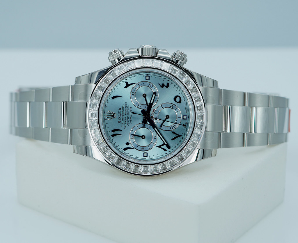 A New Old Stock with Most Stickers still Intact & Very Beautiful RARE 2023 40mm Rolex Platona 116576TBR Cosmograph Daytona Platinum with Factory Baguette Diamonds Bezel & Ice Blue Arabic Numerals Dial. Purchased from Rolex Authorized Dealer in 06.2023. Unworn & Unsized. Full Set & Under 5 Years Factory Warranty.