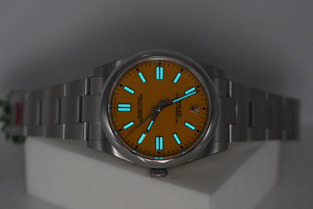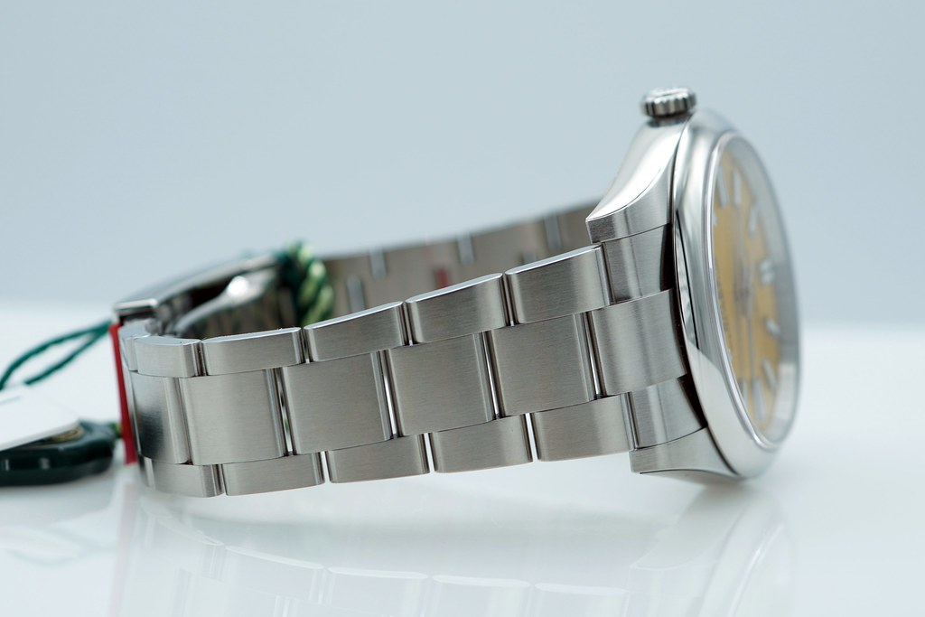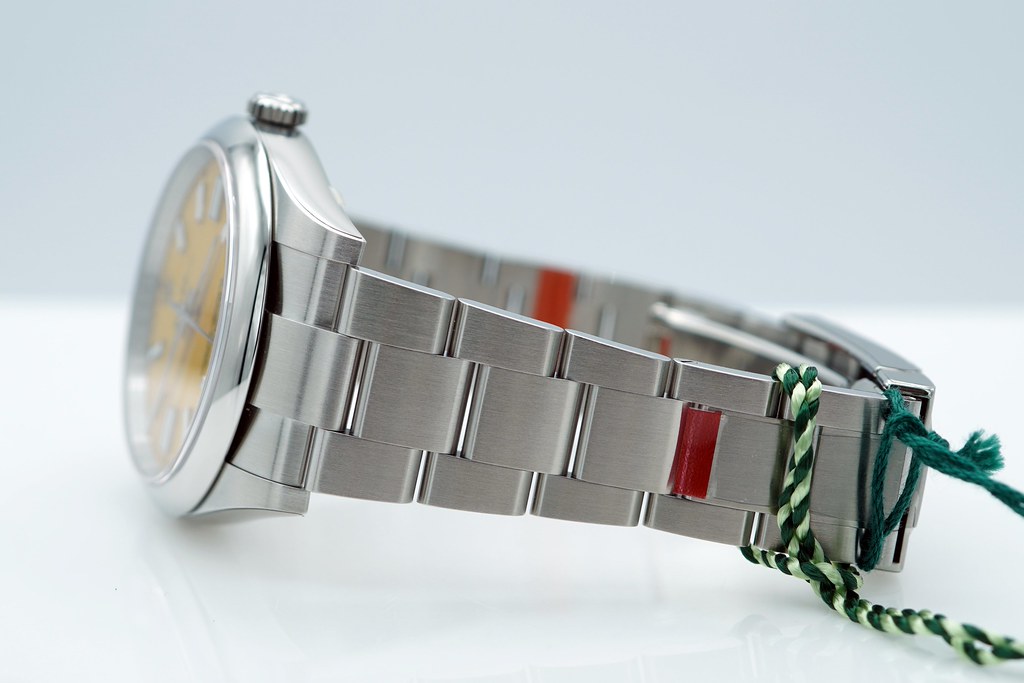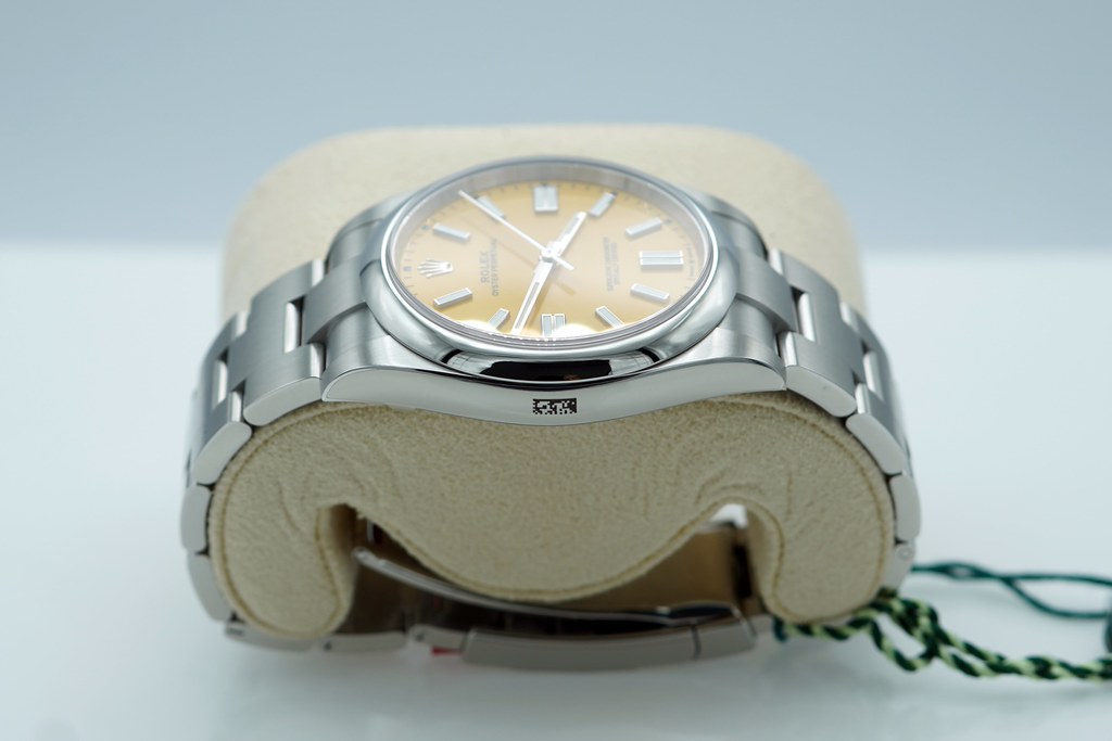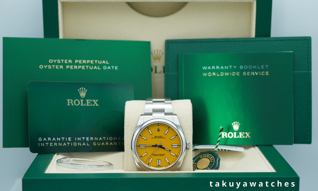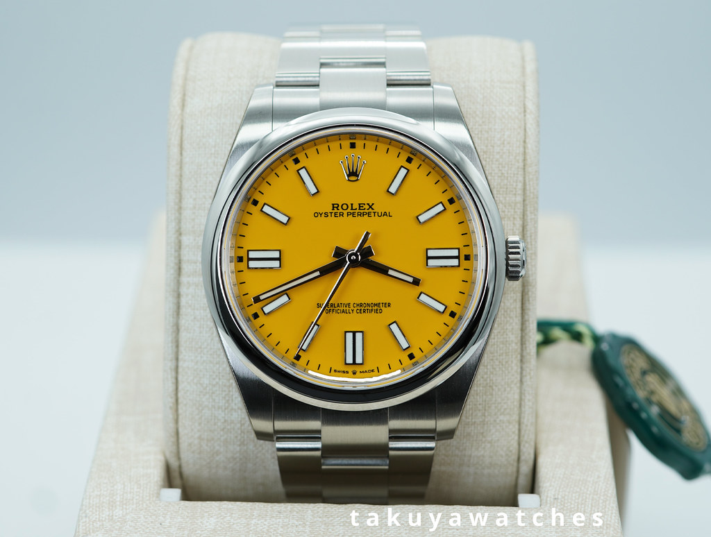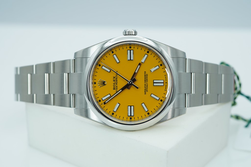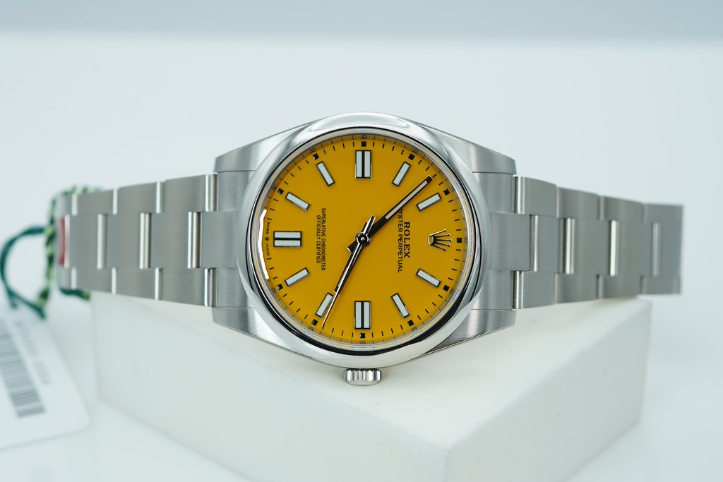 A New Old Stock with Full Stickers intact & Very Beautiful Discontinued 2022 41mm Rolex 124300 Oyster Perpetual Stainless Steel with Factory Yellow Dial. Purchased from Rolex USA Authorized Dealer in 2022. Unworn & Unsized.