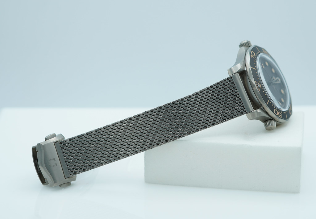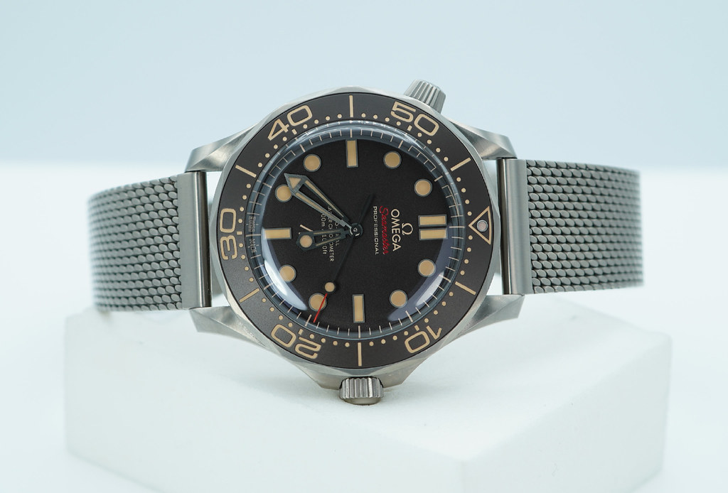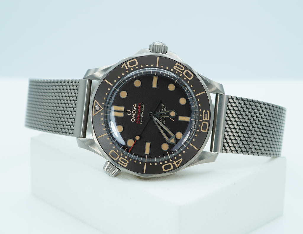 An Excellent Condition & Very Cool 42mm Omega Seamaster Diver 300m 007 James Bond No Time To Die Edition. Grade 2 Titanium Case (Strong & Lightweight) on Titanium Mesh Bracelet, Beautiful Dome Sapphire Crystal with Brown Tropical Aluminium Bezel and Dial. Omega Co-Axial Master Chronometer 8806 Movement with 55 hours Power Reserve. Purchased from Omega Authorized Dealer.