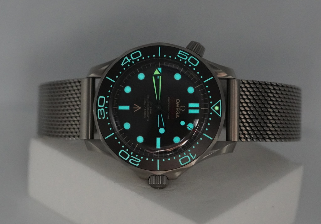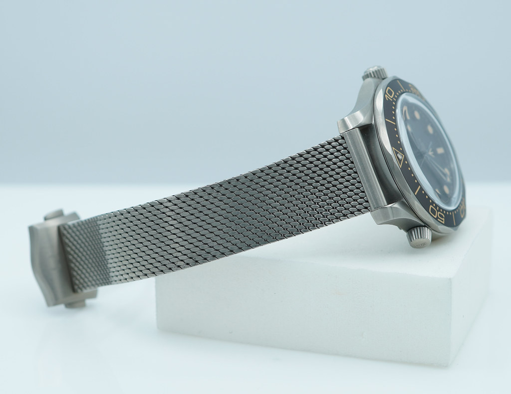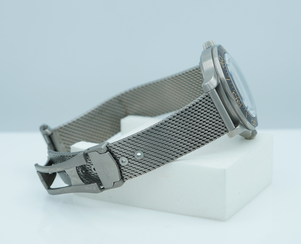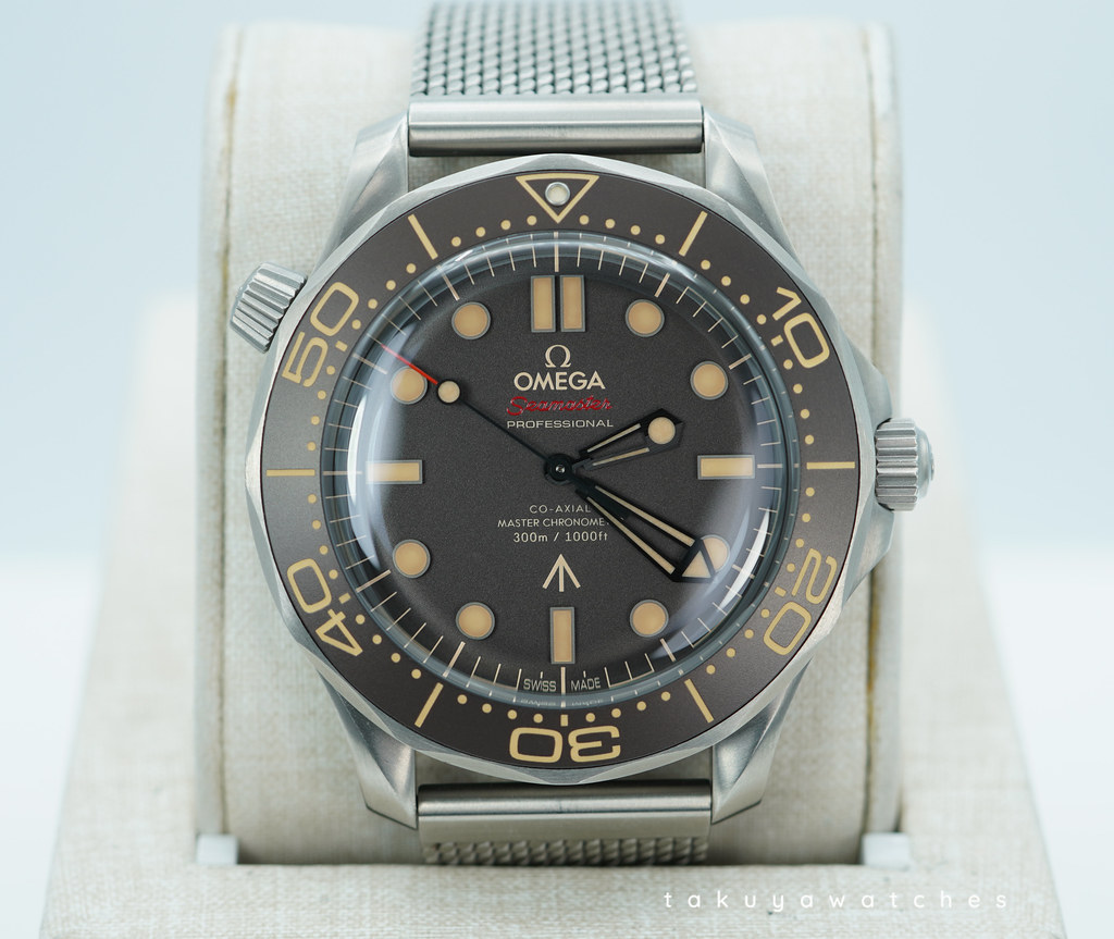 A Mint, Unpolished Condition & Very Cool 2025 42mm Omega Seamaster Diver 300m 007 James Bond ” No Time To Die ” Edition. Grade 2 Titanium Case (Strong & Lightweight) on Titanium Mesh Bracelet, Beautiful Dome Sapphire Crystal with Brown Tropical Aluminium Bezel and Dial. Omega Co-Axial Master Chronometer 8806 Movement with 55 hours Power Reserve. Purchased from Omega Authorized Dealer in 05.2025.