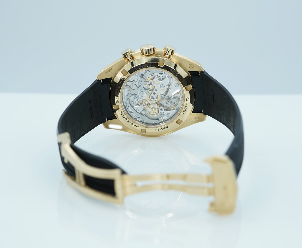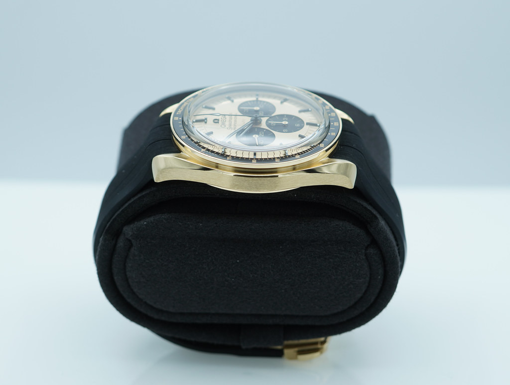 An Excellent Condition & Very Beautiful 2023 42mm Omega Speedmaster Professional Moonwatch 18K Moonshie Gold with Champagne Panda Dial & Sapphire Crystals. Manual-Winding Chronograph 3861 Movement with Co-Axial Escapement. Its on Omega Rubber Strap with Moonshine Gold Deployant Clasp. Purchased from Omega USA Authorized Dealer in 06.2023.