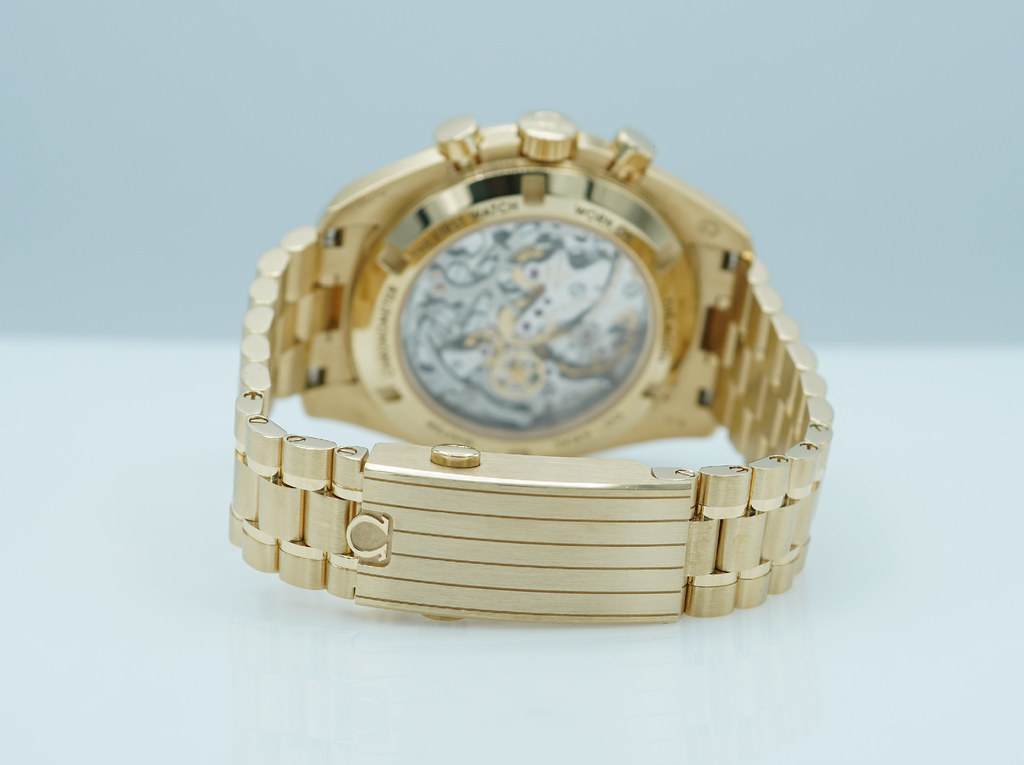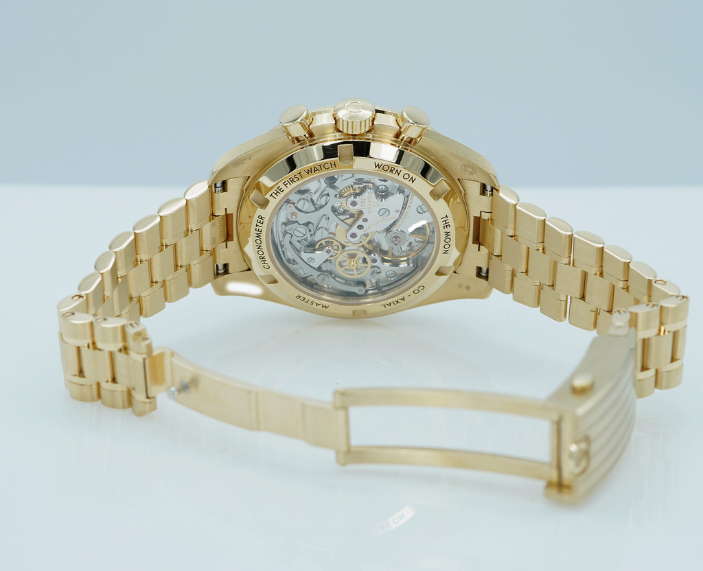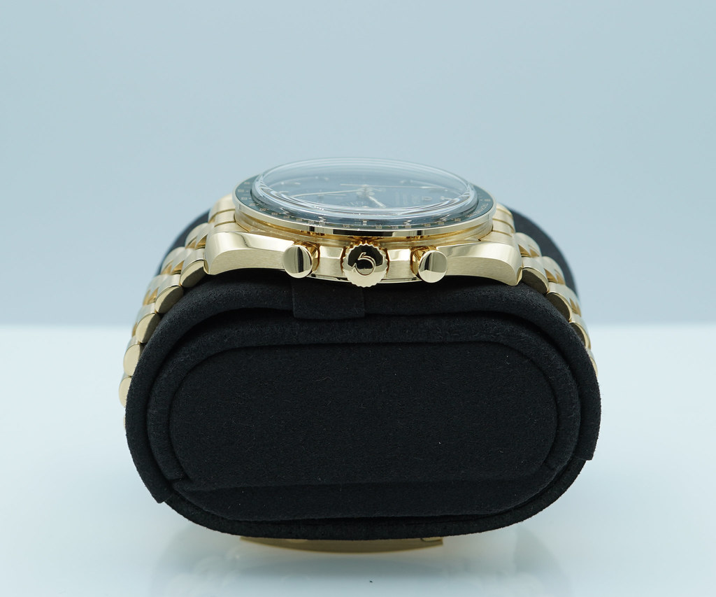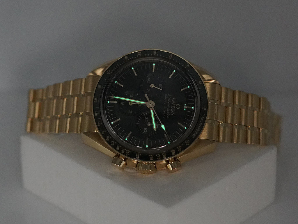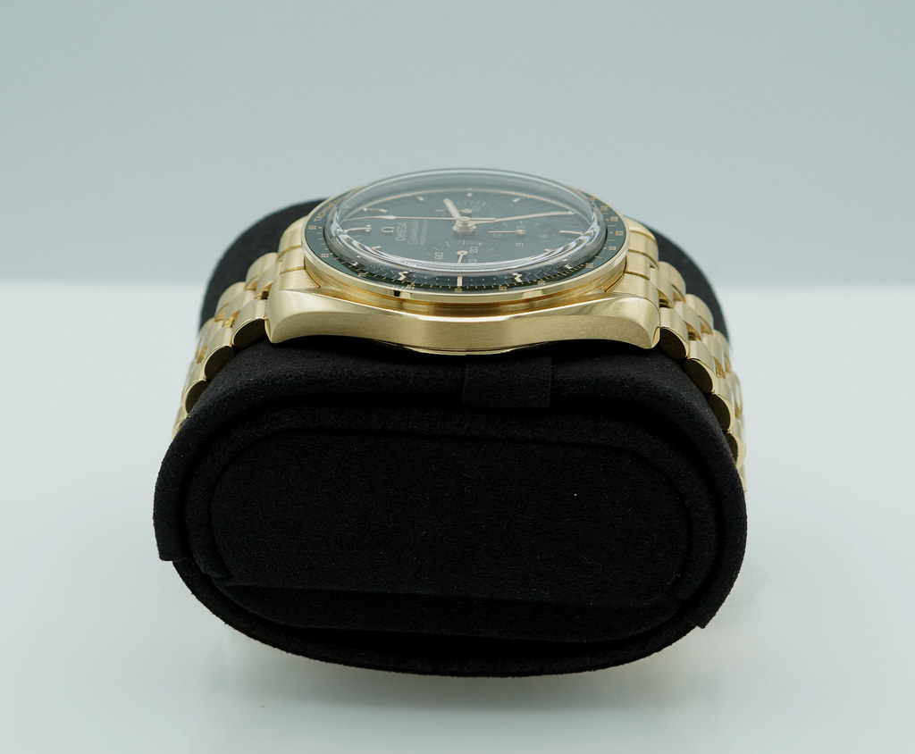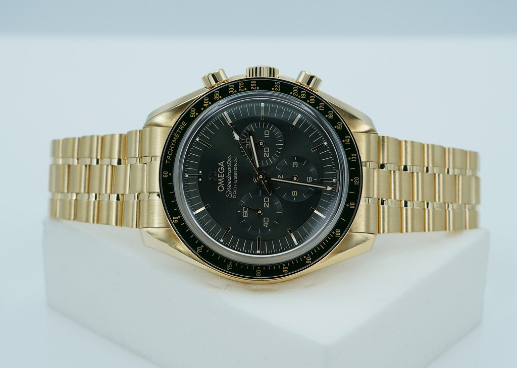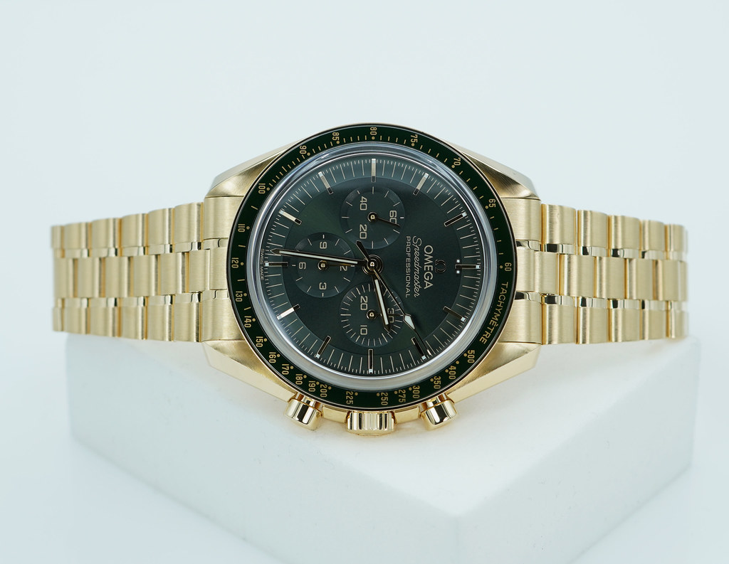 An Excellent Condition & Very Beautiful 2023 42mm Omega Speedmaster Professional Moonwatch Moonshine 18K Yellow Gold with Olive Green Dial & Green Ceramic Bezel. Manual-Winding Chronograph 3861 Movement with Co-Axial Escapement. Purchased from Omega USA AD in 12.2023. Watch running perfect with Non Issues. Full Links. Full Set & Under 5 Years Factory Warranty.