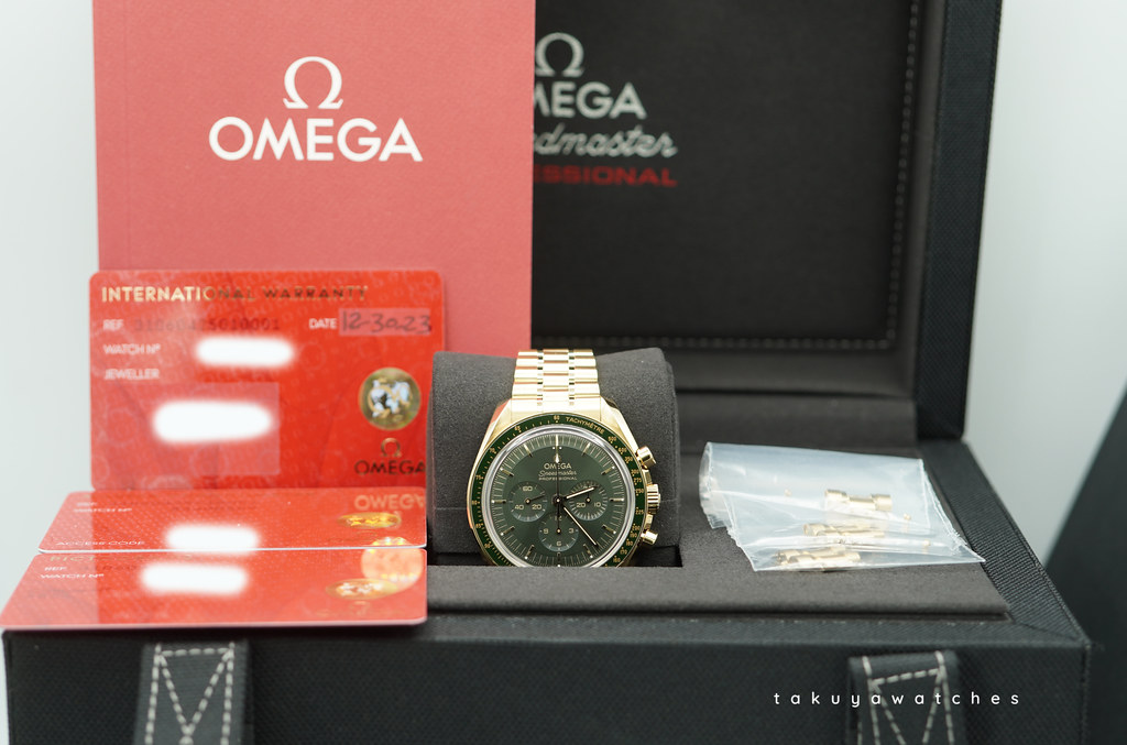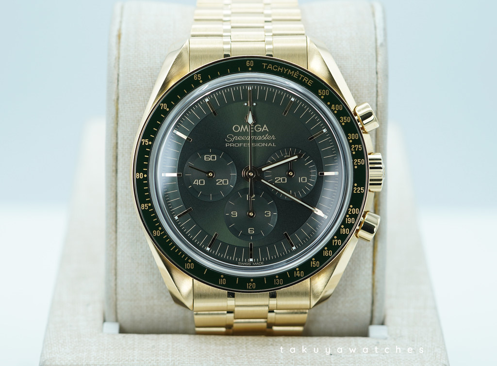 An Excellent Condition & Very Beautiful 2023 42mm Omega Speedmaster Professional Moonwatch Moonshine 18K Yellow Gold with Olive Green Dial & Green Ceramic Bezel. Manual-Winding Chronograph 3861 Movement with Co-Axial Escapement. Purchased from Omega USA AD in 12.2023.