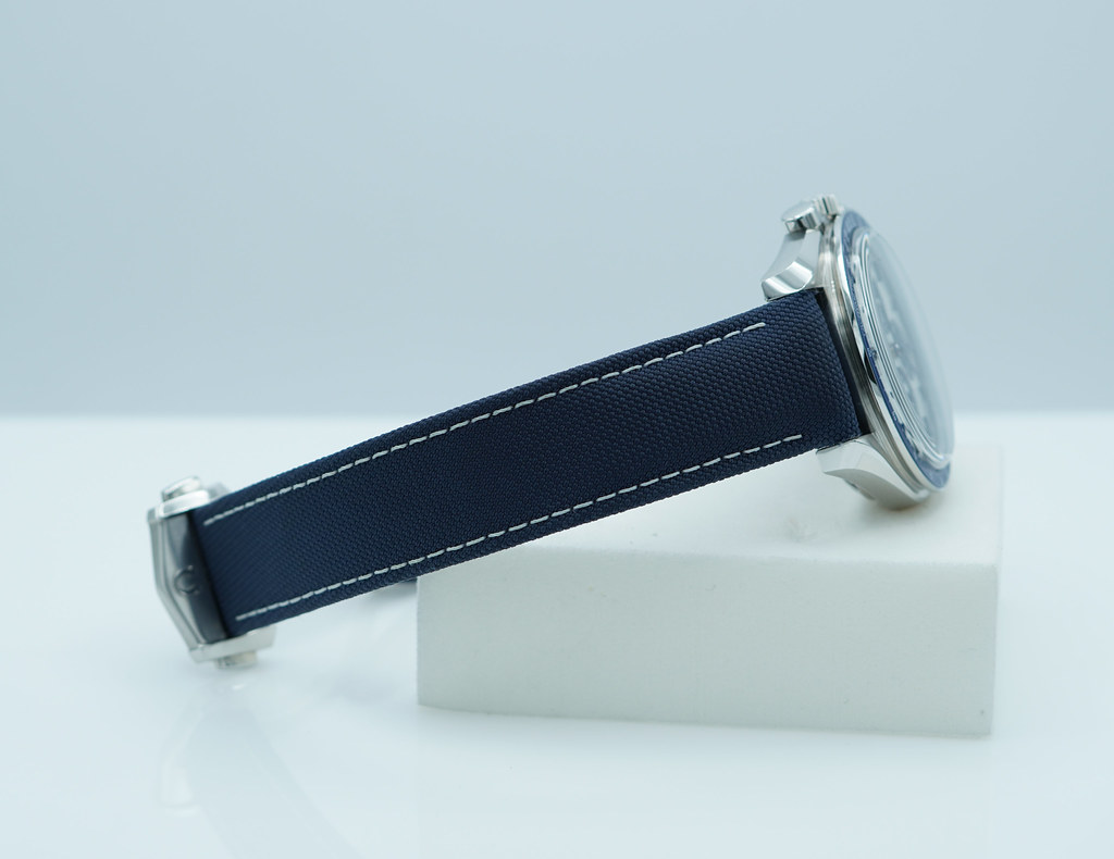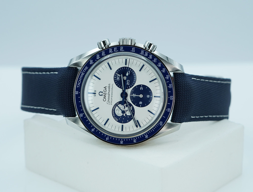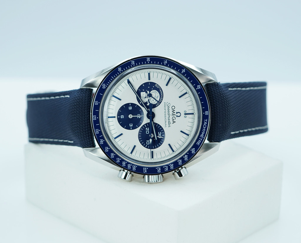 An Excellent, Unpolished Condition & Very Beautiful 2025 42mm Omega Speedmaster Professional Moonwatch 50th Anniversary Silver Snoopy Award, Silver Dial with Blue Subdials, Stainless Steel Case on Blue Fabric Strap & Steel Tang Buckle. Purchased from Omega USA AD in 09.2025. Watch running perfect with Non Issues. Full Set with an Extra Omega Blue Fabric Strap with Omega Deployant Clasp. Under 5 Years Factory Warranty.