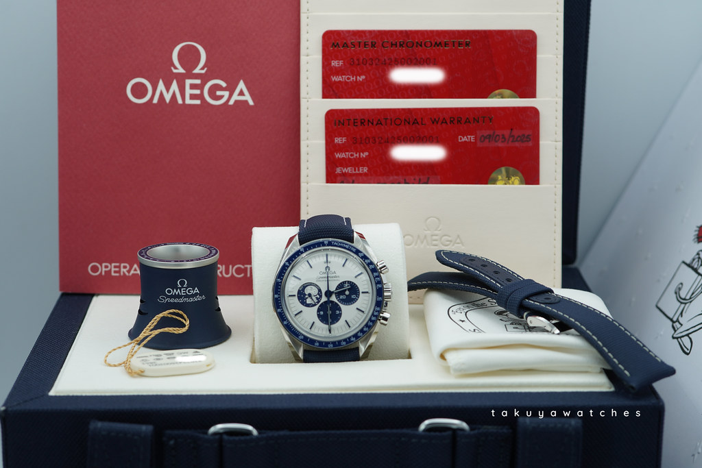 An Excellent, Unpolished Condition & Very Beautiful 2025 42mm Omega Speedmaster Professional Moonwatch 50th Anniversary Silver Snoopy Award, Silver Dial with Blue Subdials, Stainless Steel Case on Blue Fabric Strap & Steel Tang Buckle. Purchased from Omega USA AD in 09.2025. Watch running perfect with Non Issues. Full Set with an Extra Omega Blue Fabric Strap with Omega Deployant Clasp.