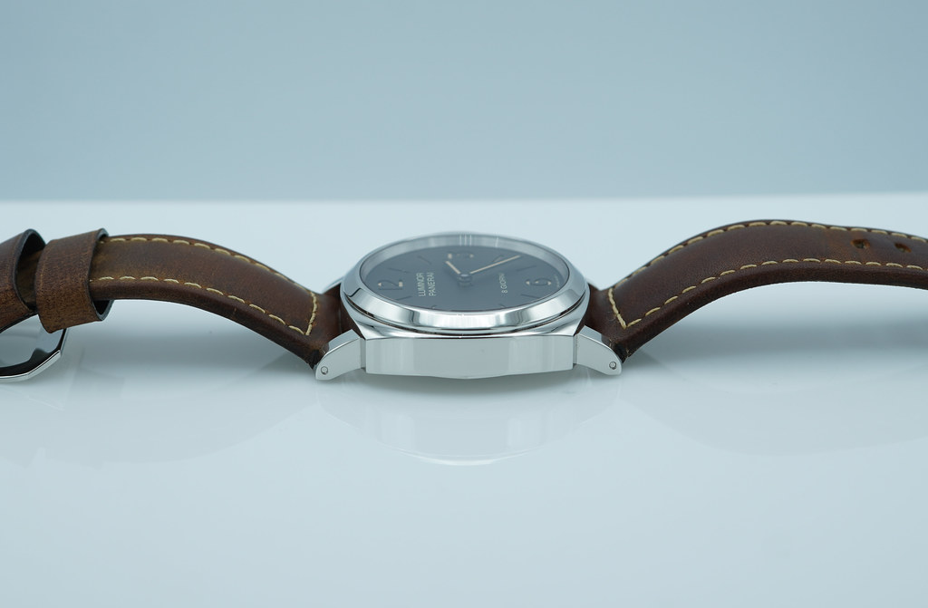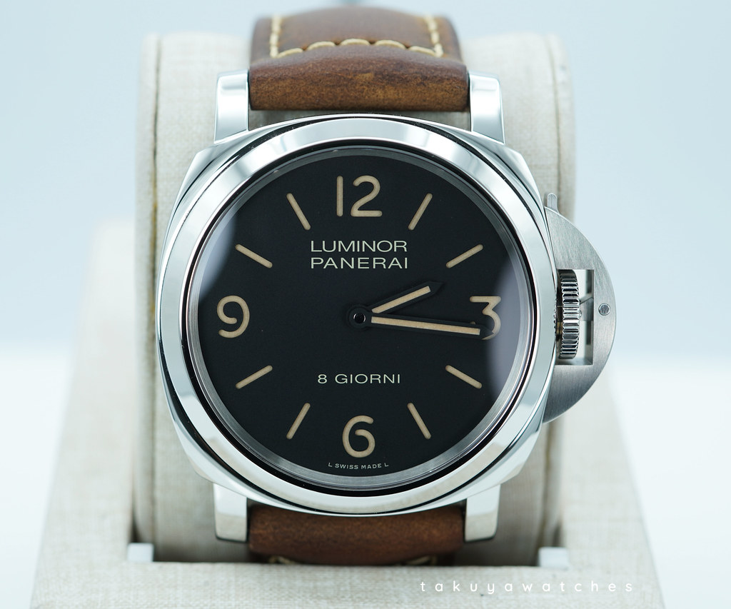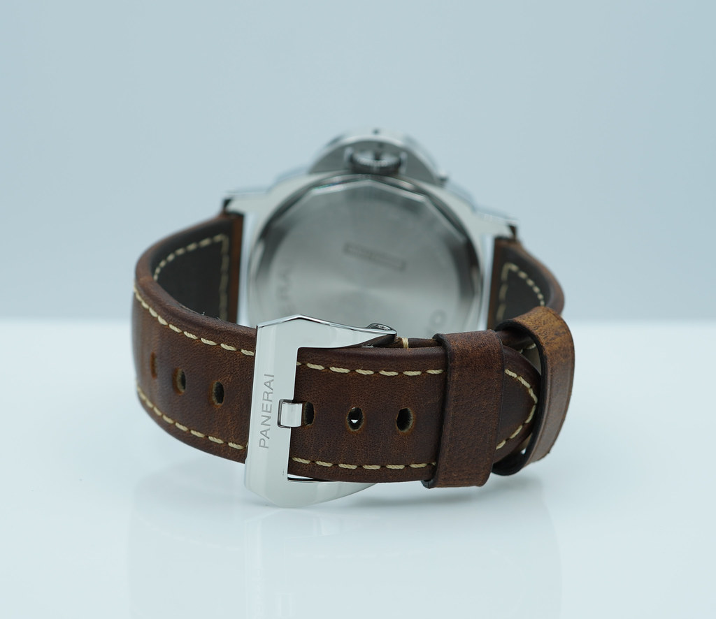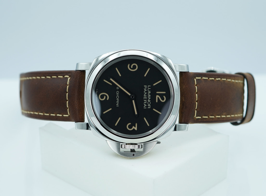 An Excellent Condition & Very Beautiful 2021 44mm Panerai PAM00914 Luminor Base Hand-Wound 8 Days Power Reserve P.5000 Movement with Black Dial. Stainless Steel Case on Panerai Scamosciato Brown Leather Straps with Steel Tang Buckle. Purchased from Panerai Authorized Dealer in 07.2021.