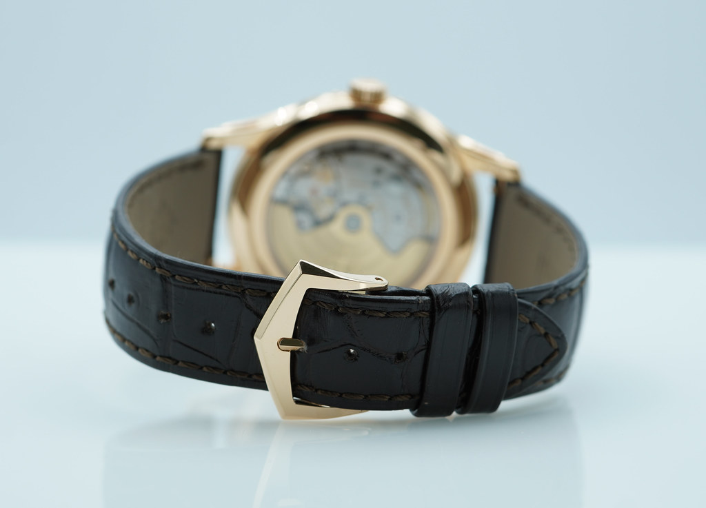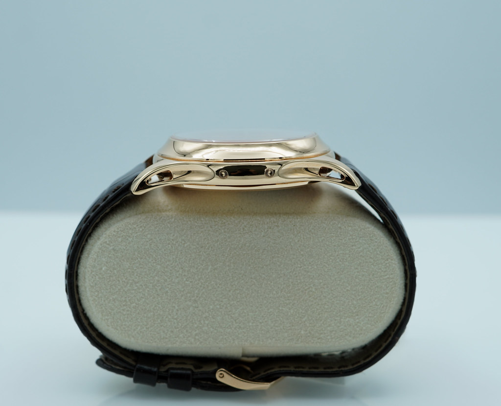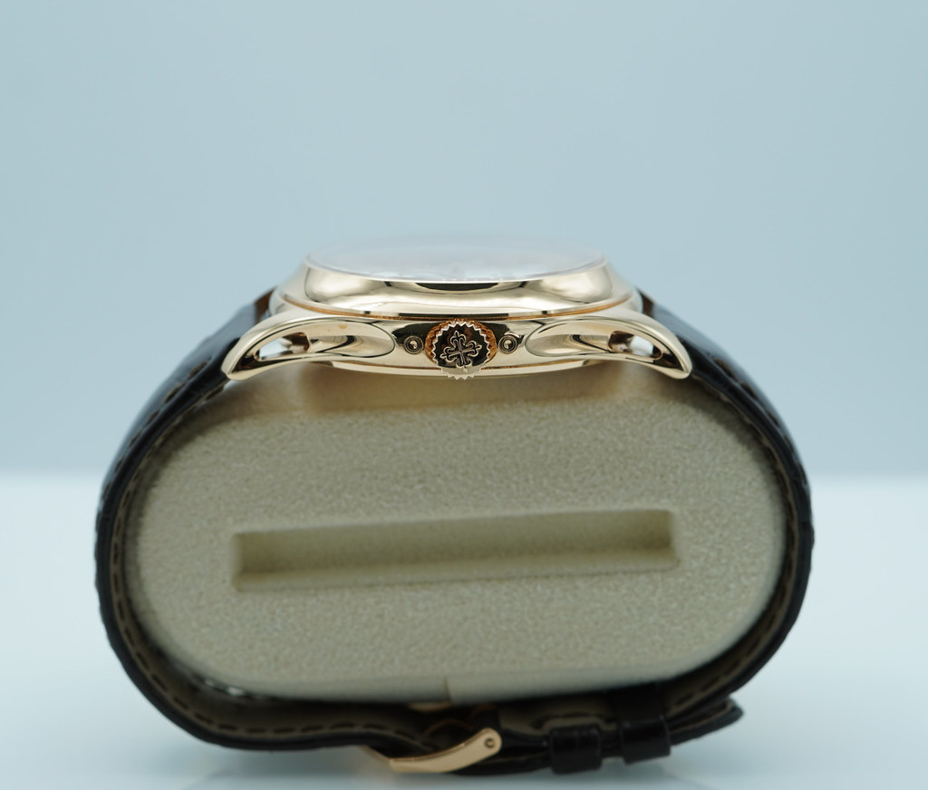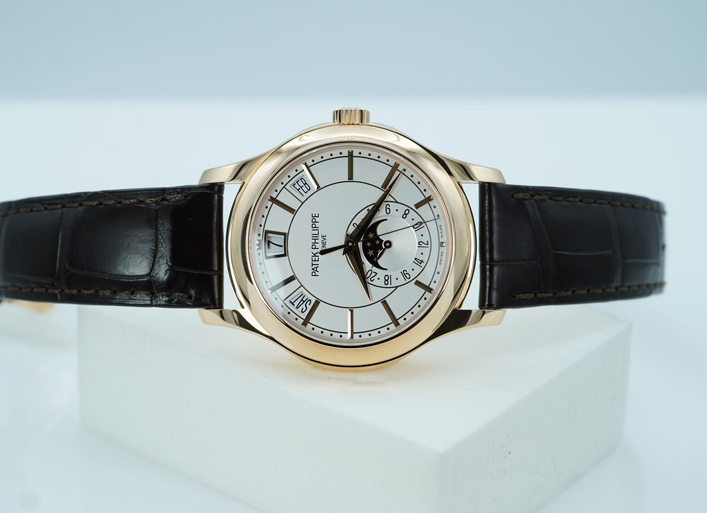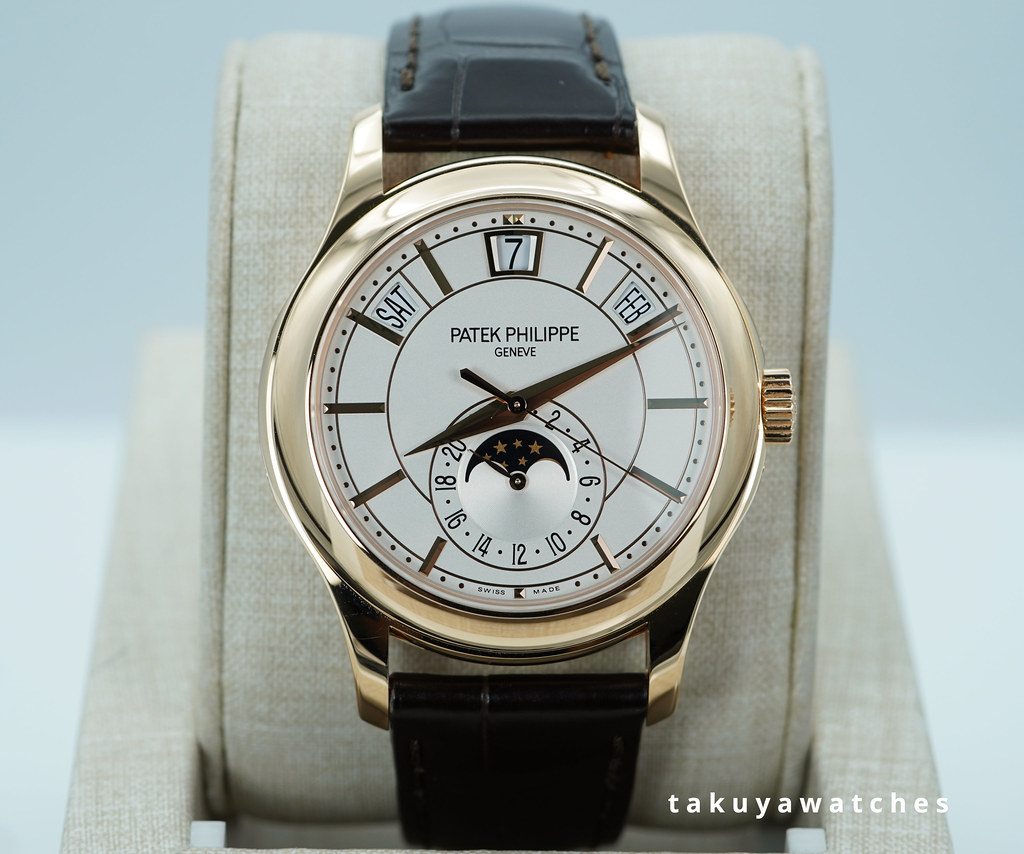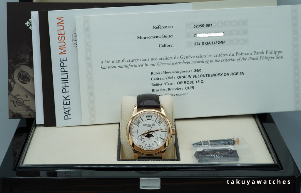 An Excellent, Unpolished Condition & Very Beautiful 2021 40mm Patek Philippe 5205 18K Rose Gold Annual Calendar Complications with White Opaline Dail, on Dark Brown Alligator Strap with 18K Rose Gold Tang Buckle. Purchased from Patek Philippe USA Authorized Dealer in 12.2021.