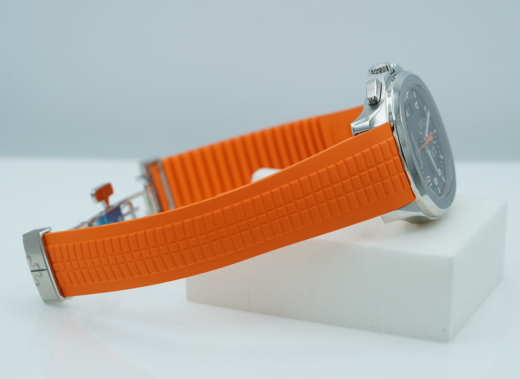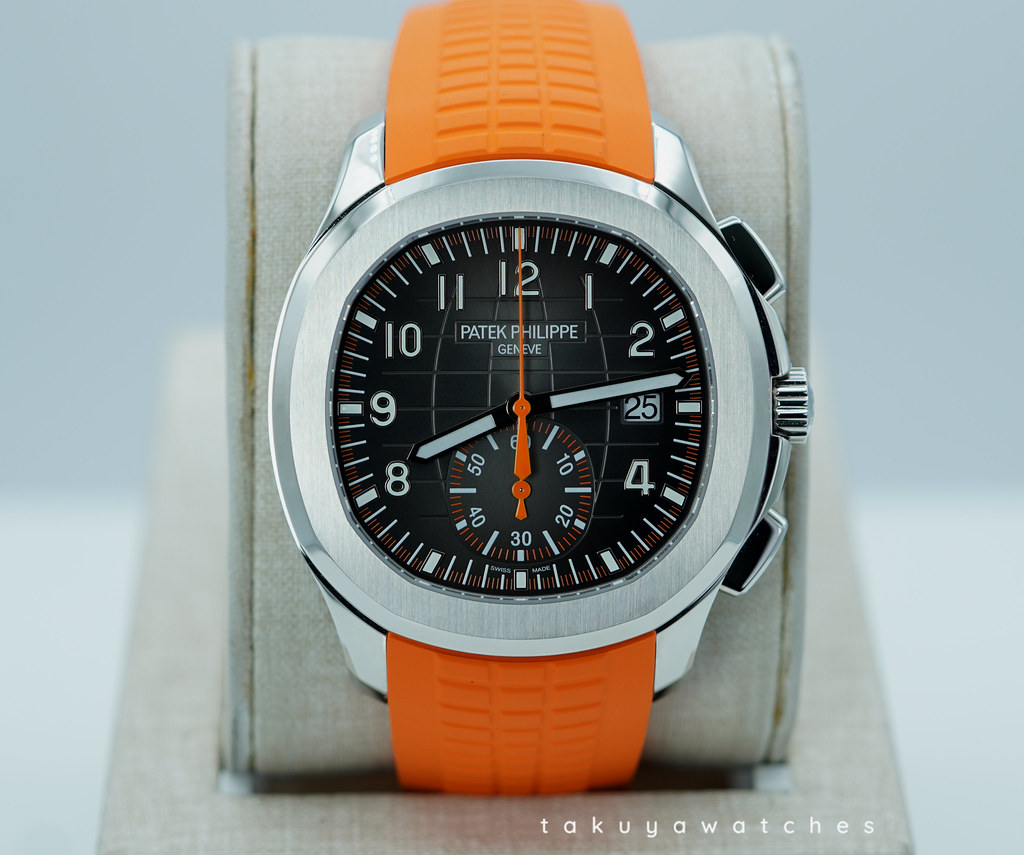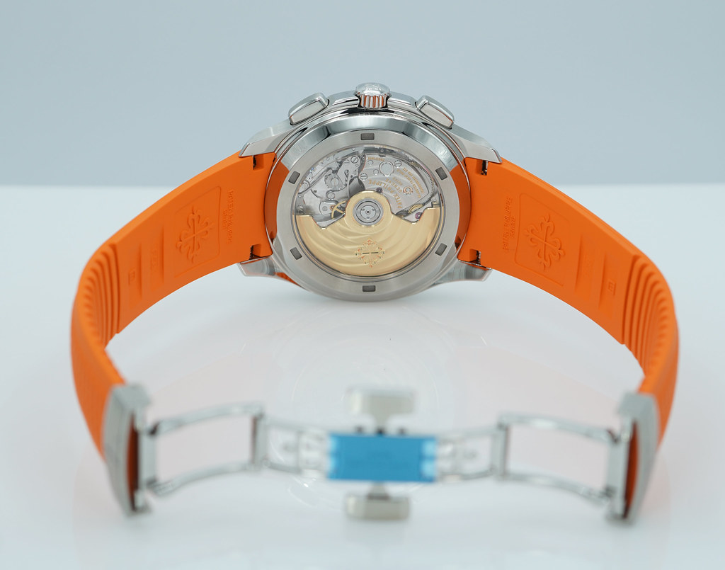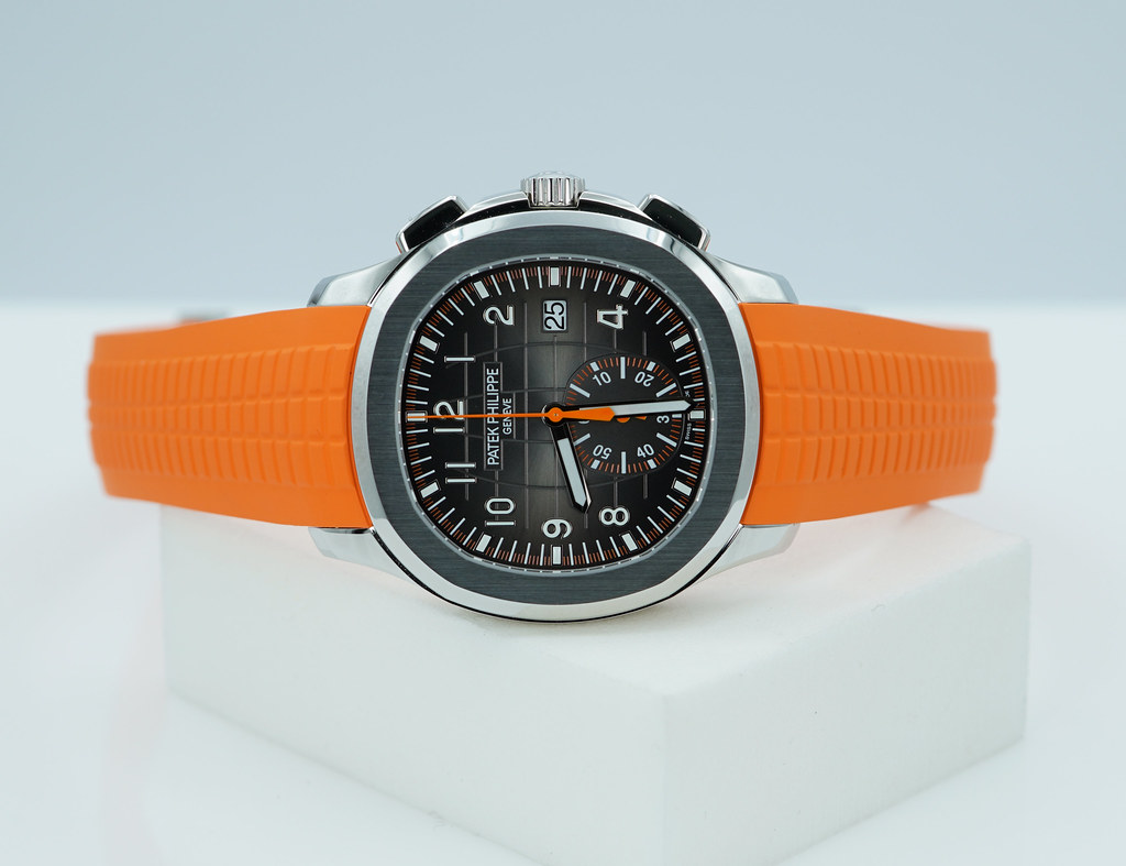 A Mint, Unpolished Condition & Very Beautiful 2020 Patek Philippe 42mm 5968 Aquanaut Chronograph with Black embossed dial with luminous Arabic gold applied numerals & Orange Accents. Stainless Steel Case on Orange Tropical Strap with New Style Patek Philippe Deployant Clasp. Purchased from Patek Philippe USA Authorized Dealer in 2020. Both Orange and Black Straps are Uncut. Full Set.