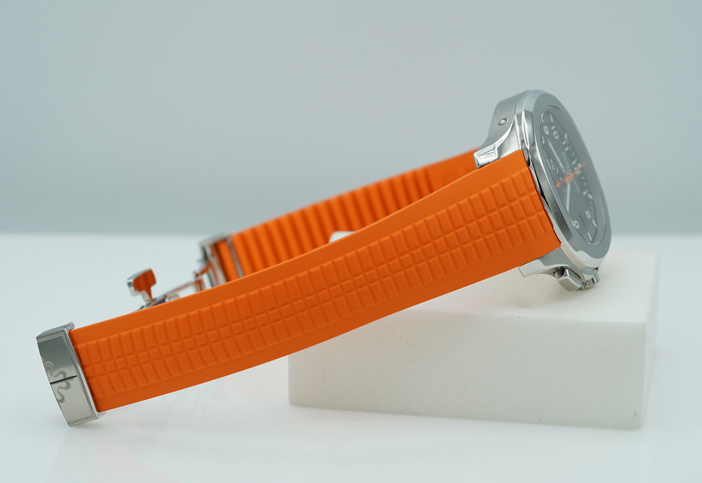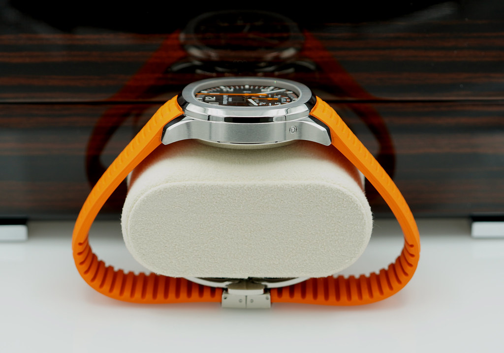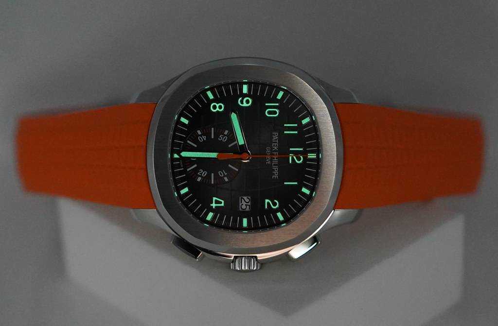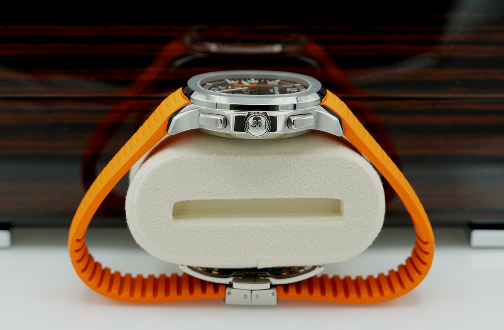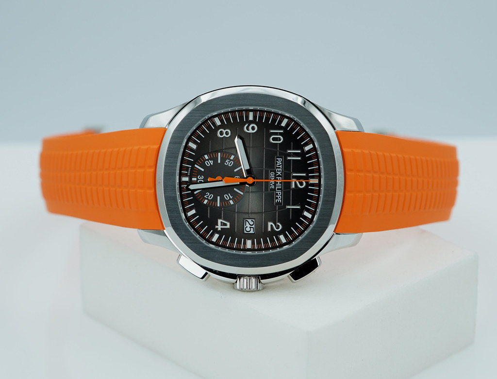 A Mint, Unpolished Condition & Very Beautiful 2020 Patek Philippe 42mm 5968 Aquanaut Chronograph with Black embossed dial with luminous Arabic gold applied numerals & Orange Accents. Stainless Steel Case on Orange Tropical Strap with New Style Patek Philippe Deployant Clasp. Purchased from Patek Philippe USA Authorized Dealer in 2020. Both Orange and Black Straps are Uncut. Full Set.