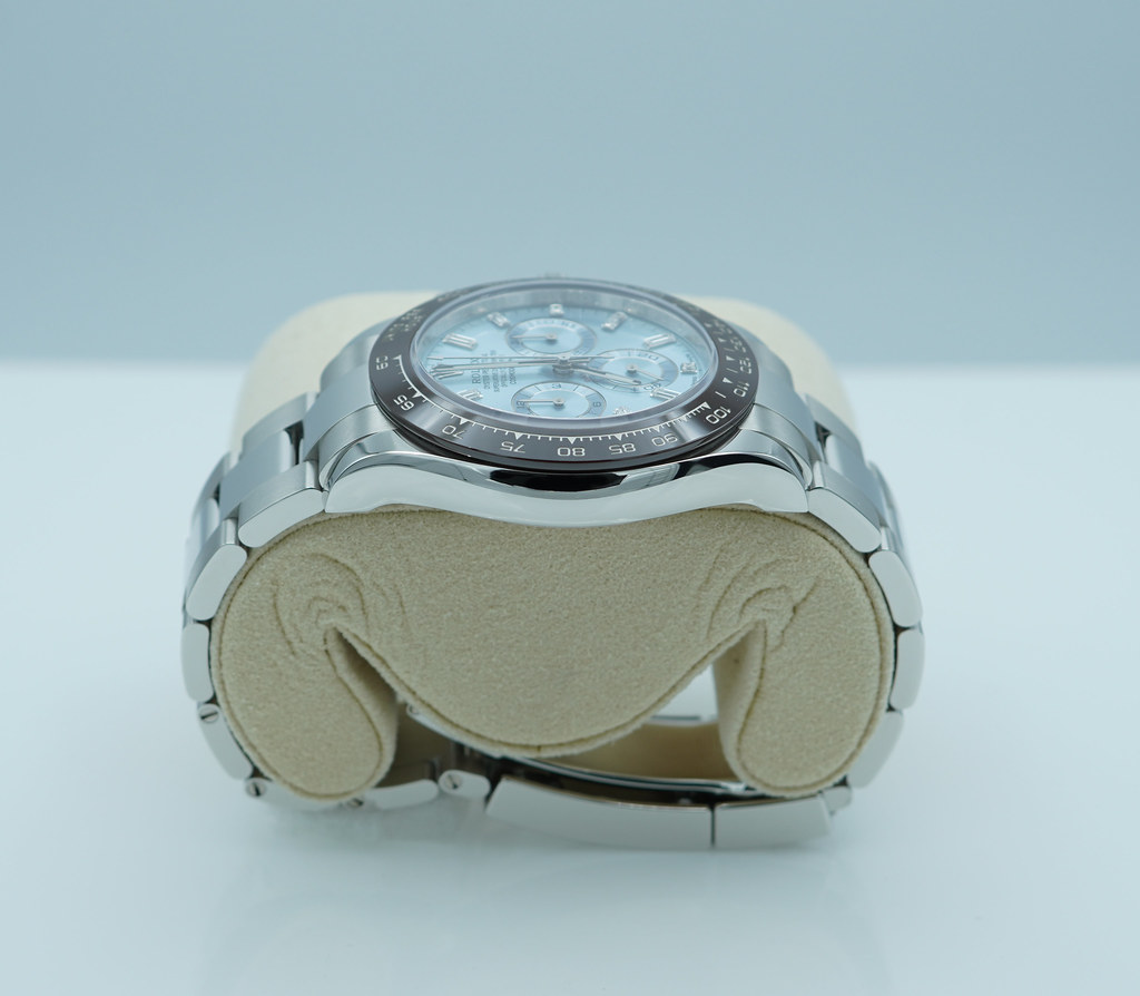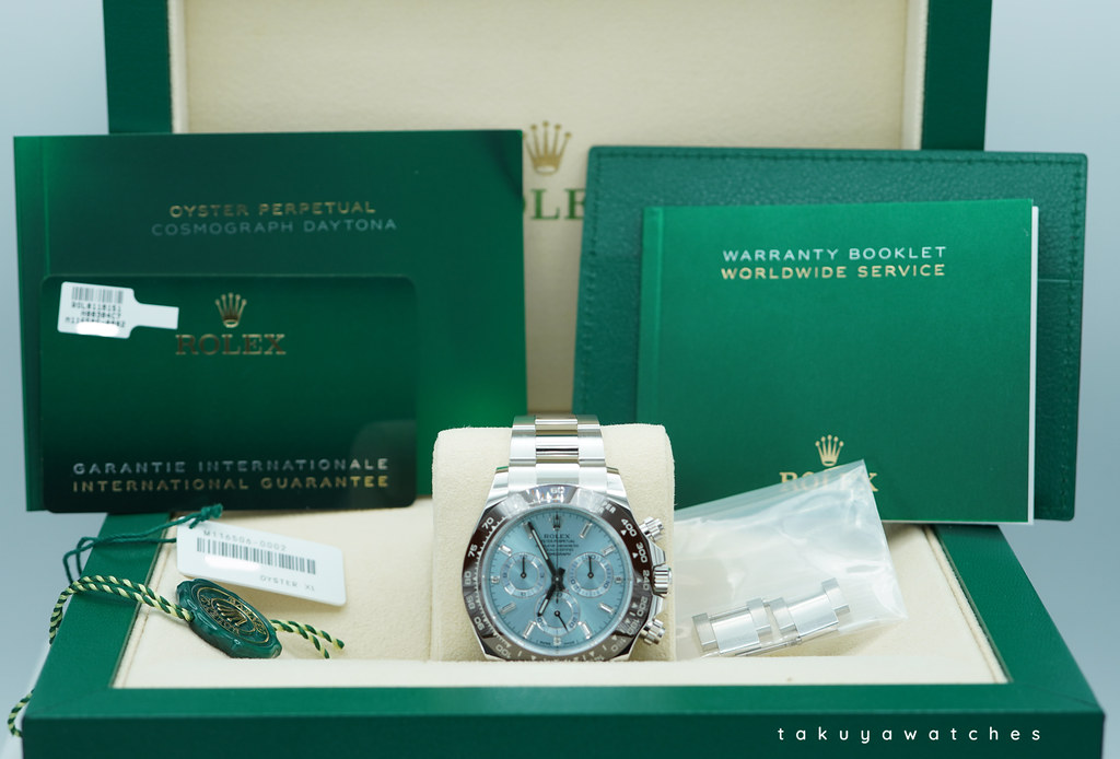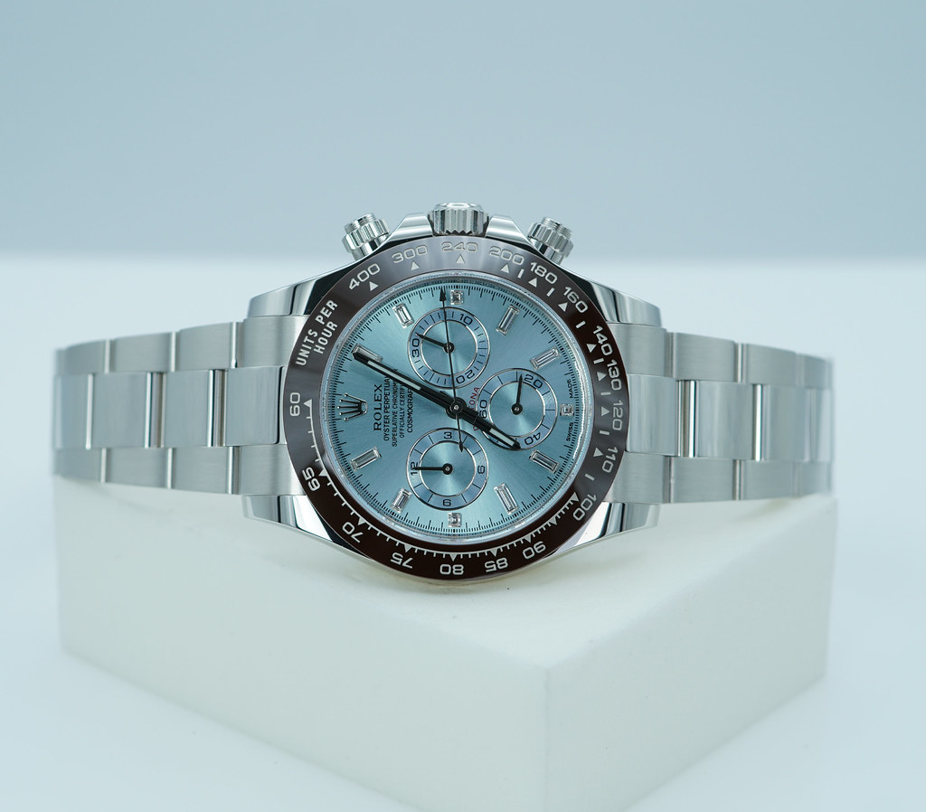 An Excellent Condition & Very Beautiful 2023 Discontinued 40mm Rolex Platona 116506 Cosmograph Daytona Platinum with Ceramic Bezel, Baguette Diamonds Ice Blue Dial. Purchased from Rolex USA Authorized Dealer in 06.2023. Watch Running Perfect with Non Issues. Full Links & Full Set.