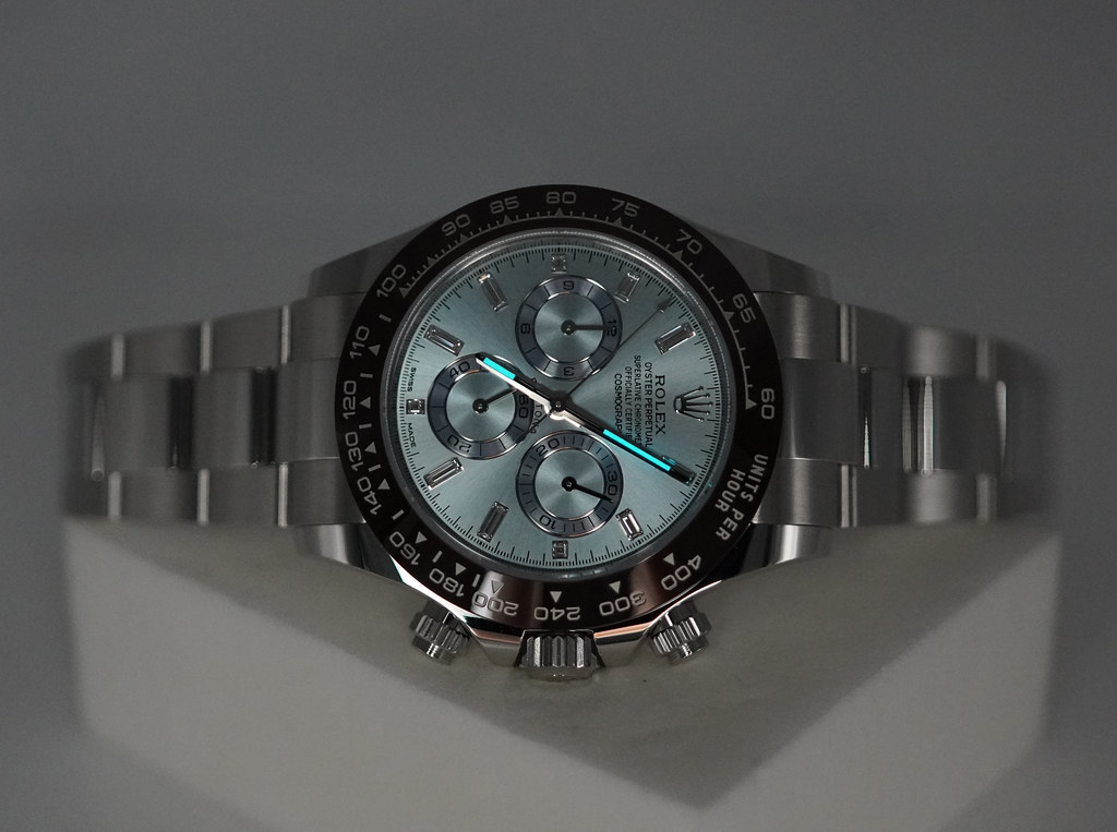 An Excellent Condition & Very Beautiful 2023 Discontinued 40mm Rolex Platona 116506 Cosmograph Daytona Platinum with Ceramic Bezel, Baguette Diamonds Ice Blue Dial. Purchased from Rolex USA Authorized Dealer in 06.2023.
