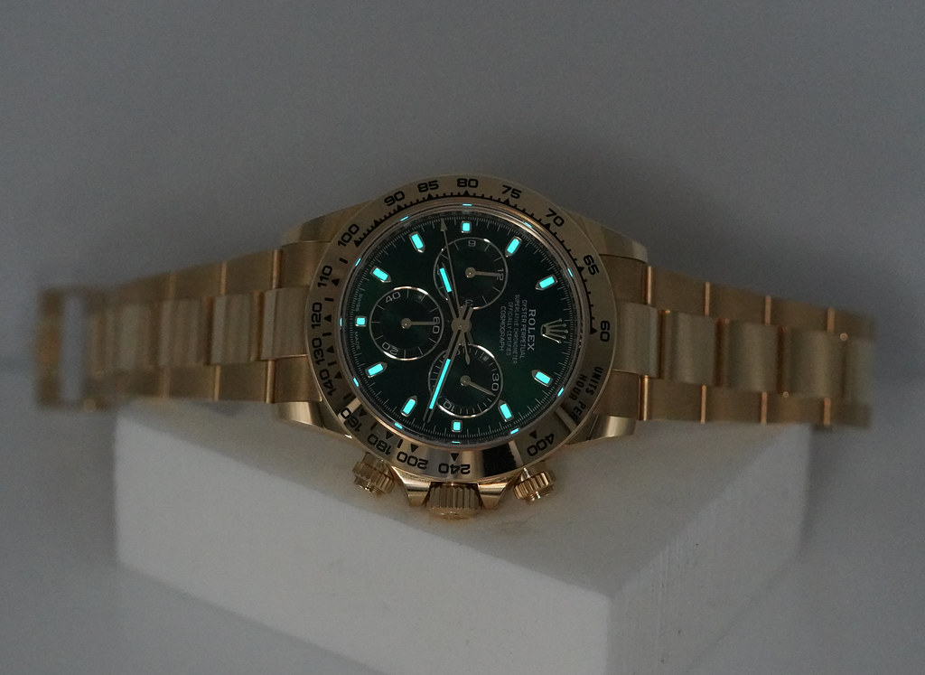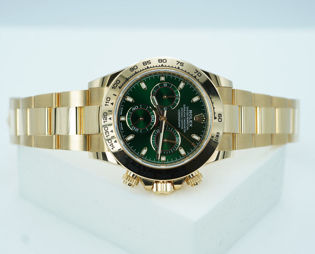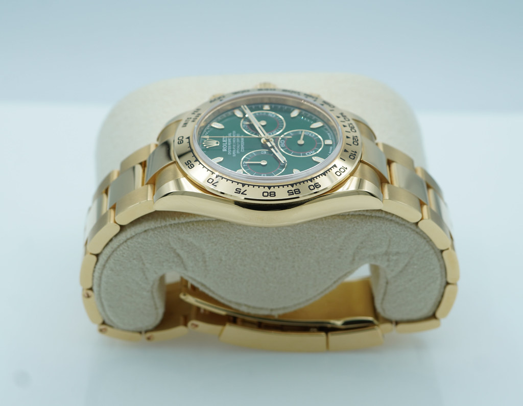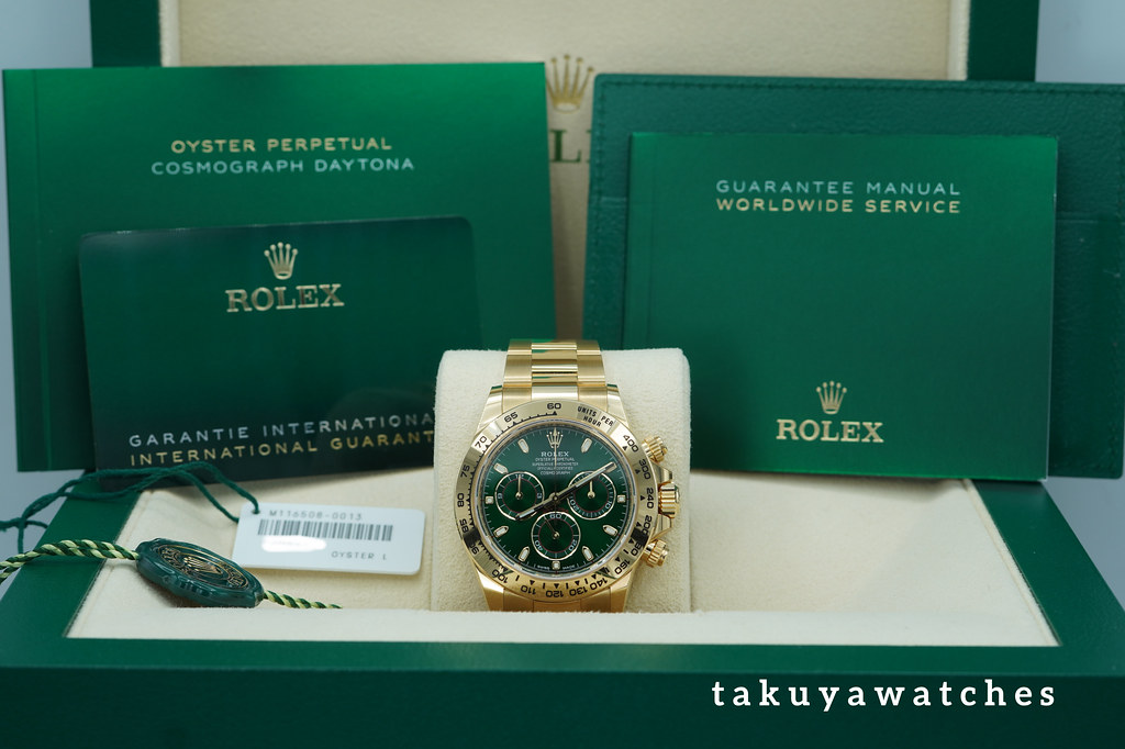 An Excellent Condition & Very Beautiful Discontinued 2024 40mm Rolex 116508 Cosmograph Daytona “John Mayer” 18K Yellow Gold with Green Dial. Purchased from Rolex Authorized Dealer in 12.2024.