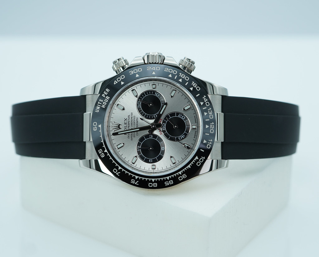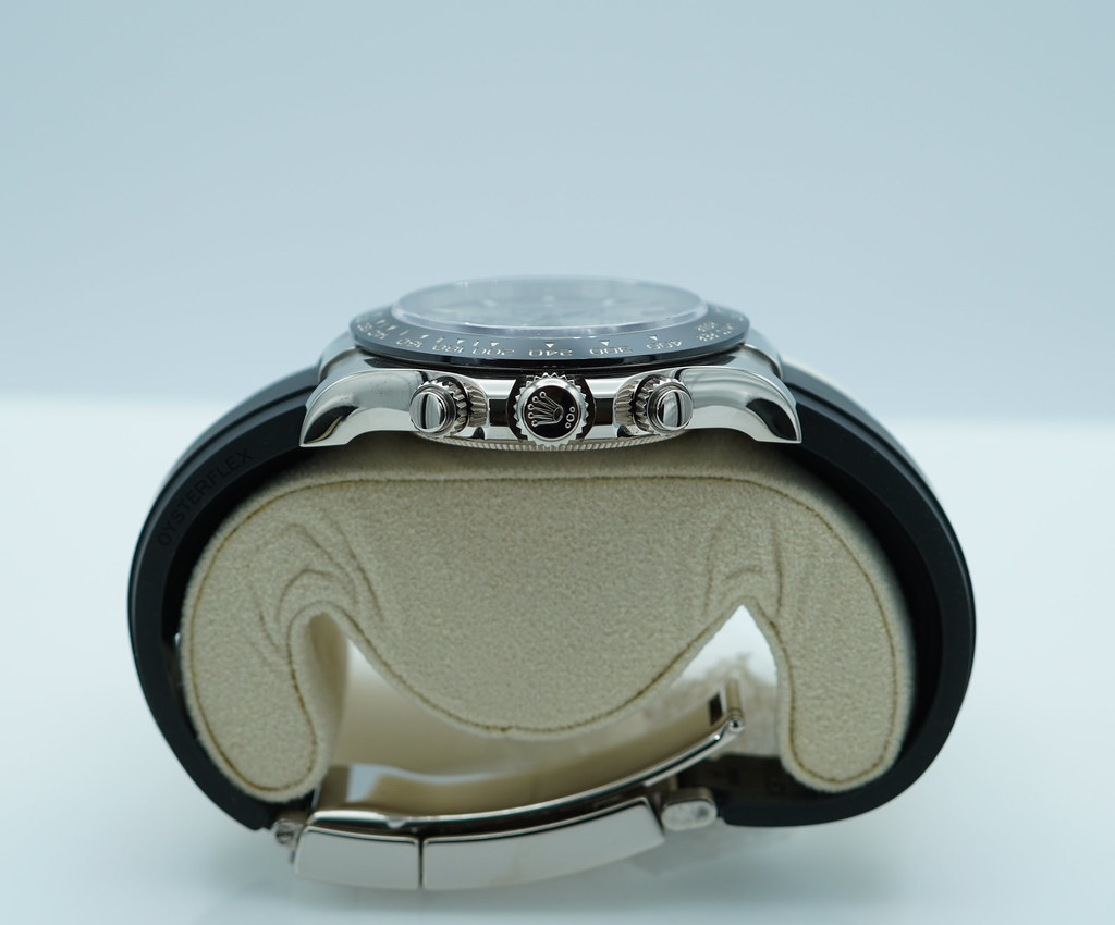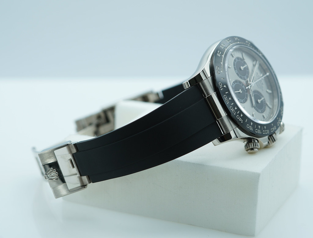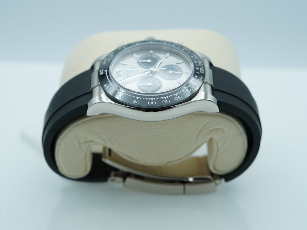 An Excellent Condition & Very Beautiful 2022 40mm Rolex Ghost 116519 Cosmograph Daytona 18K White Gold with Ceramic Bezel, Steel & Black Subs Dial. Its on Oysterflex Strap. Purchased from Rolex Authorized Dealer in 05.2022.