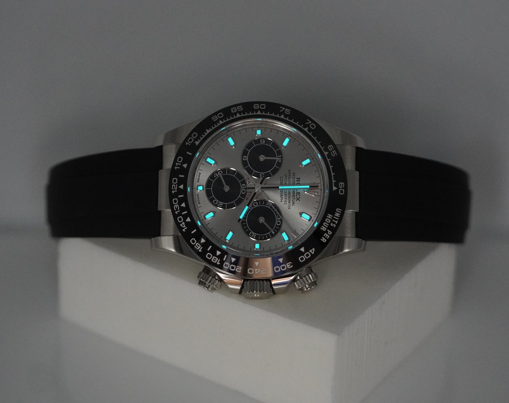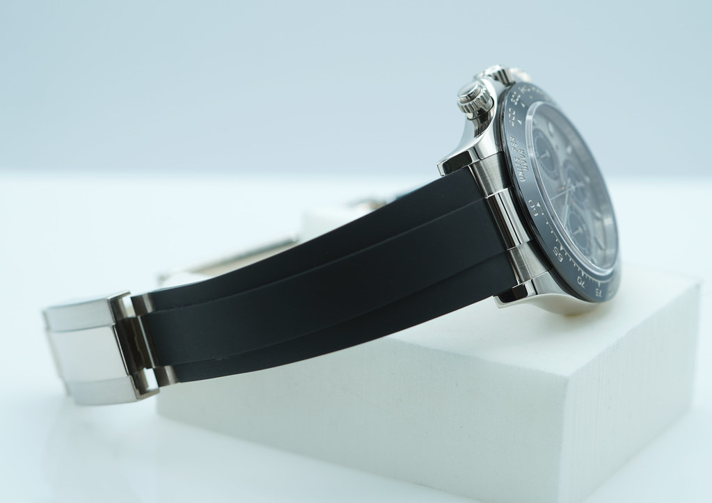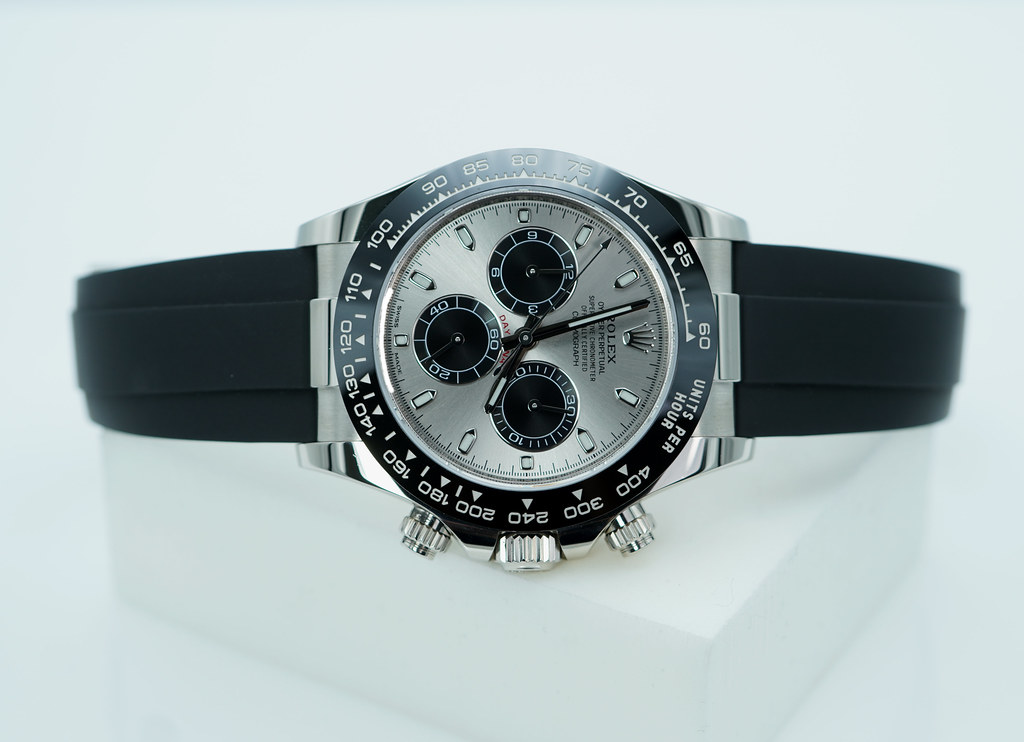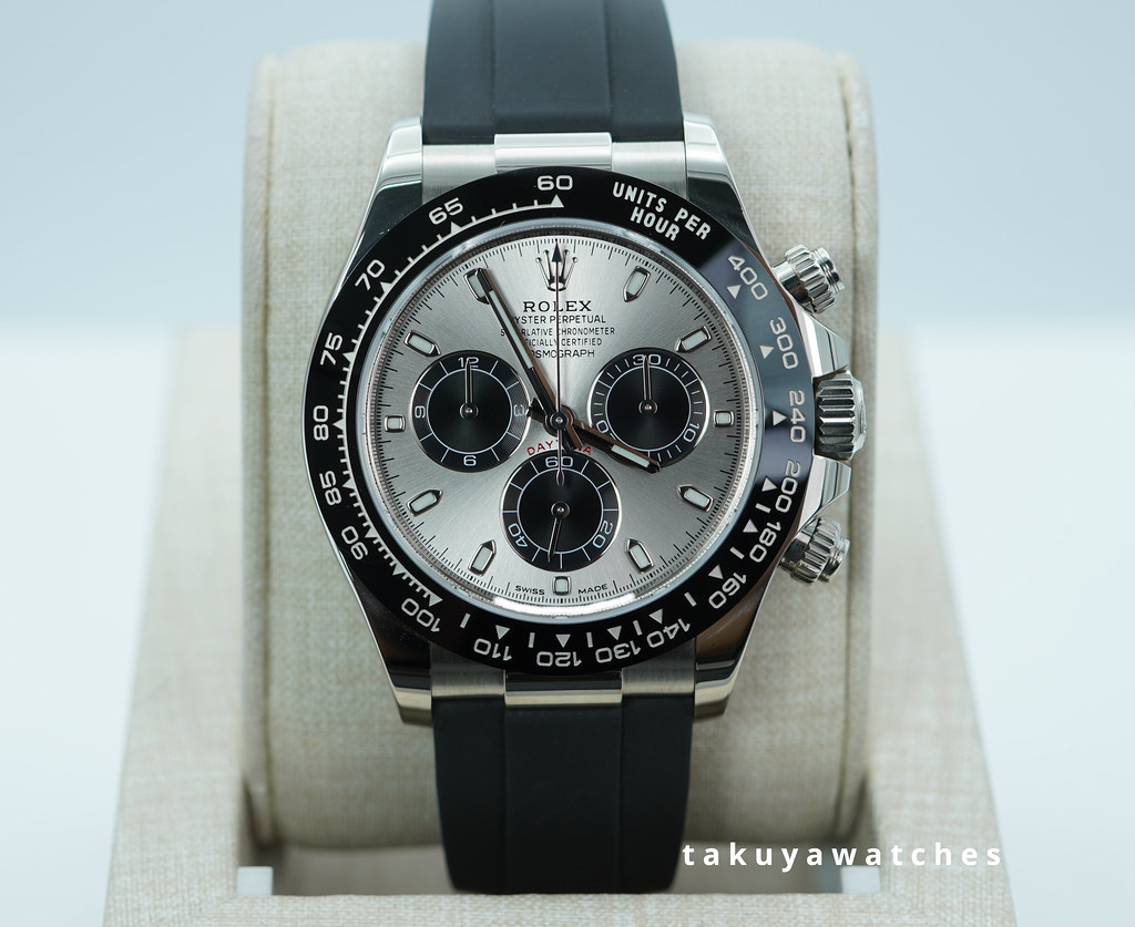 An Excellent Condition & Very Beautiful 2022 40mm Rolex Ghost 116519 Cosmograph Daytona 18K White Gold with Ceramic Bezel, Steel & Black Subs Dial. Its on Oysterflex Strap. Purchased from Rolex Authorized Dealer in 05.2022.