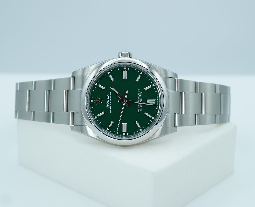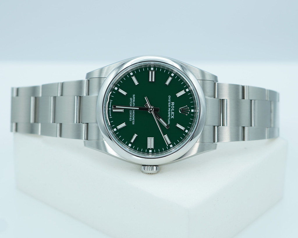 An Excellent Condition & Very Beautiful 2023 36mm Rolex 126000 Oyster Perpetual Stainless Steel with Green Dial. Purchased from Rolex Authorized Dealer in 07.2023. Watch running perfect with Non issues. Full Links. Full Set & Under 5 Years Factory Warranty.