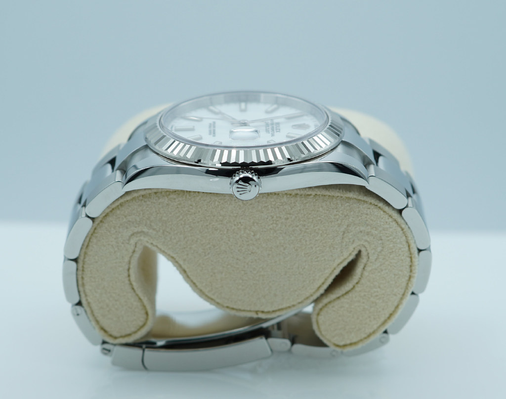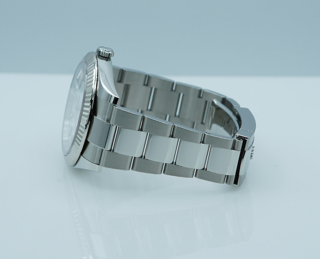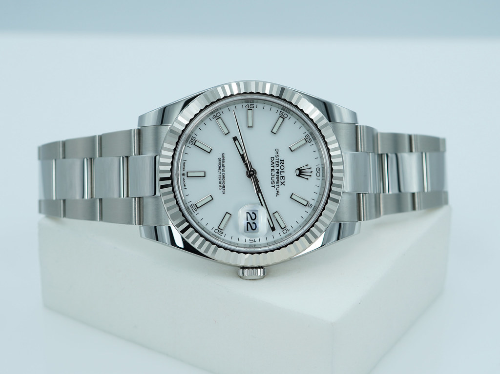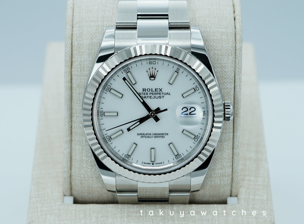 An Excellent, Unpolished Condition & Very Beautiful 2022 41mm Rolex 126334 Datejust 41 Stainless Steel with 18K White Gold Fluted Bezel, White Index Dial. It’s on Oyster Bracelet. Purchased from Rolex Authorized Dealer in 07.2022.