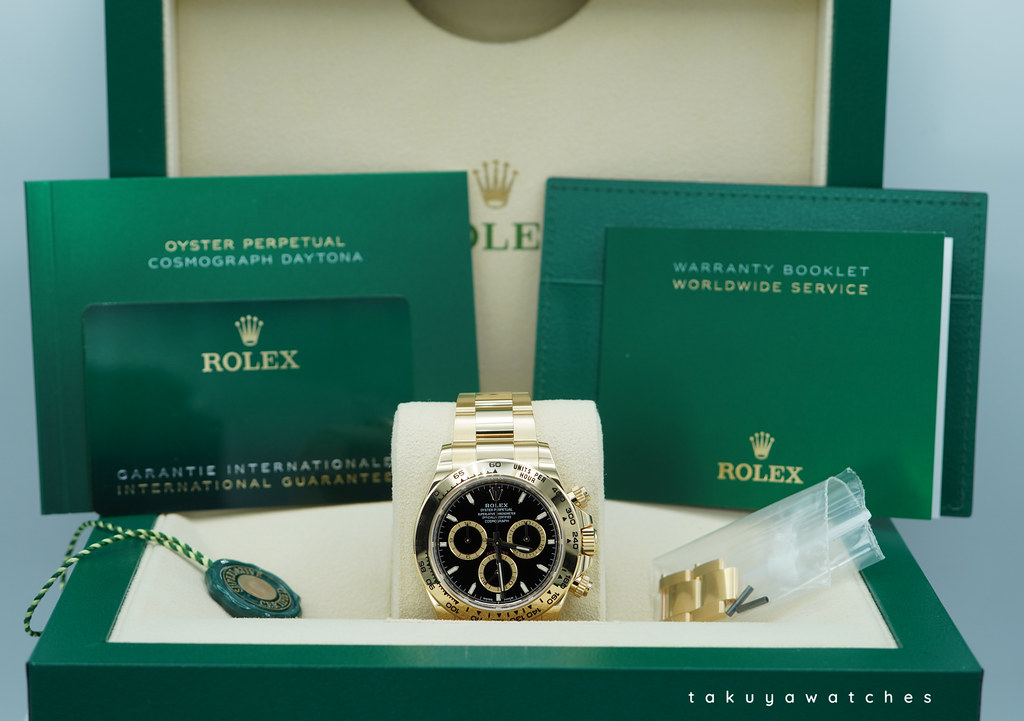An Excellent Condition & Very Beautiful New Model 2024 40mm Rolex 126505 Cosmograph Daytona 18K Yellow Gold with Black Dial & Golden Counter Rings. Purchased from Rolex Authorized Dealer in 06.2024.