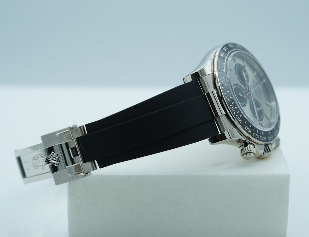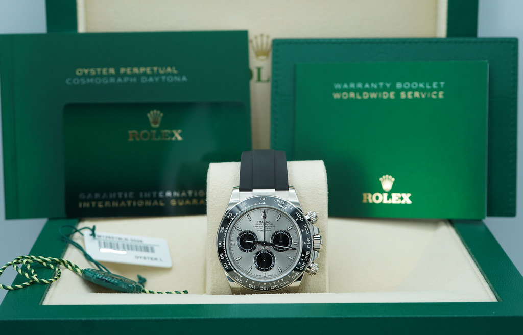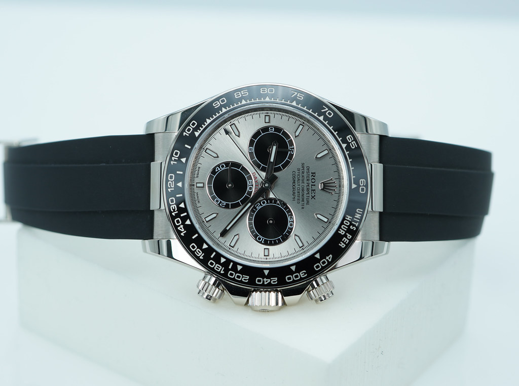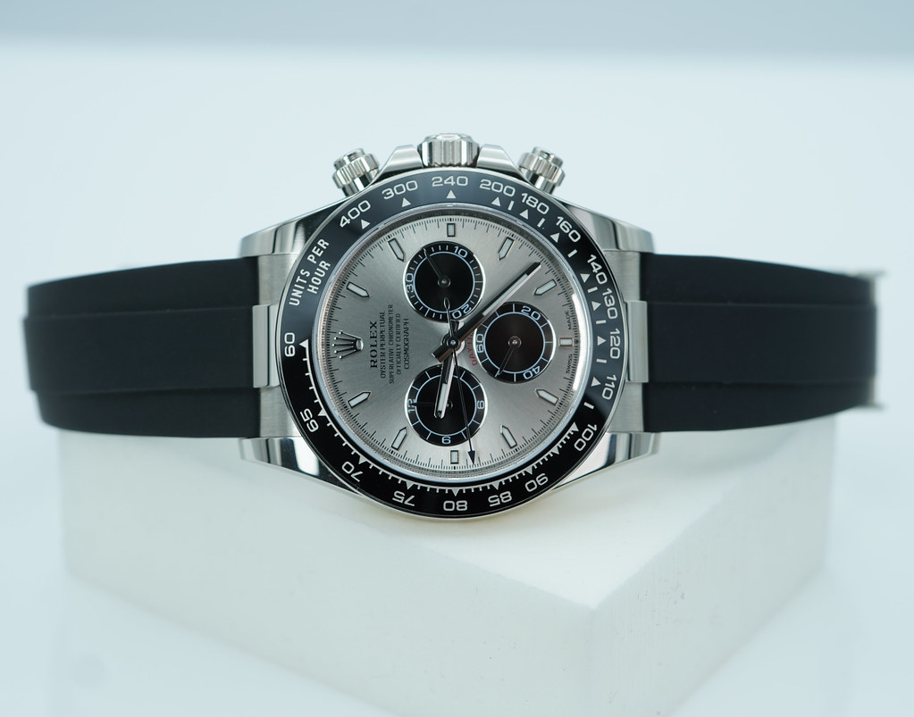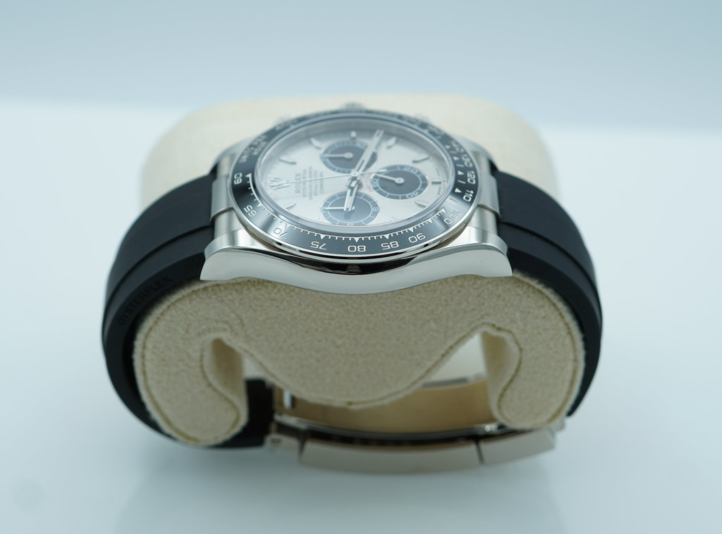 An Excellent Condition & Very Beautiful New Model 2024 40mm Rolex 126519ln Daytona Ghost 18K White Gold with Steel & Bright Black Subs Dial. Its on Oysterflex Strap with White Gold Glidelock Clasp. Purchased from Rolex Authorized Dealer in 09.2024.