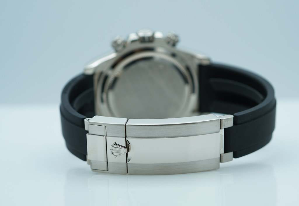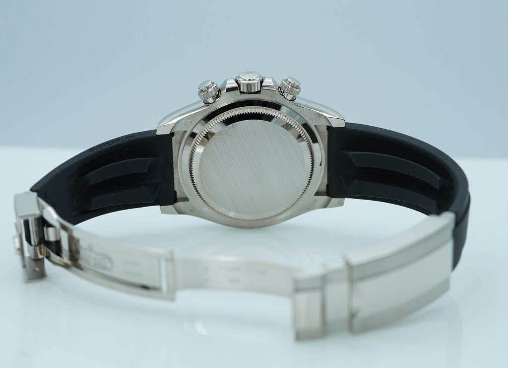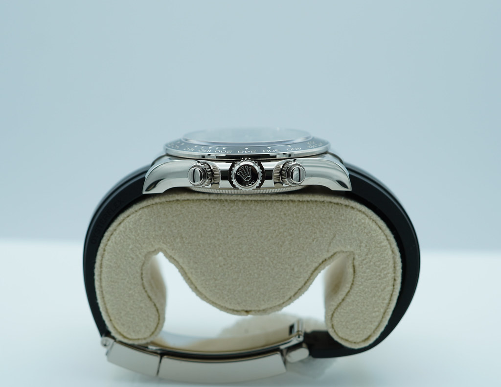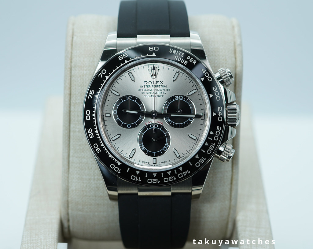 An Excellent Condition & Very Beautiful New Model 2024 40mm Rolex 126519ln Daytona Ghost 18K White Gold with Steel & Bright Black Subs Dial. Its on Oysterflex Strap with White Gold Glidelock Clasp. Purchased from Rolex Authorized Dealer in 09.2024.