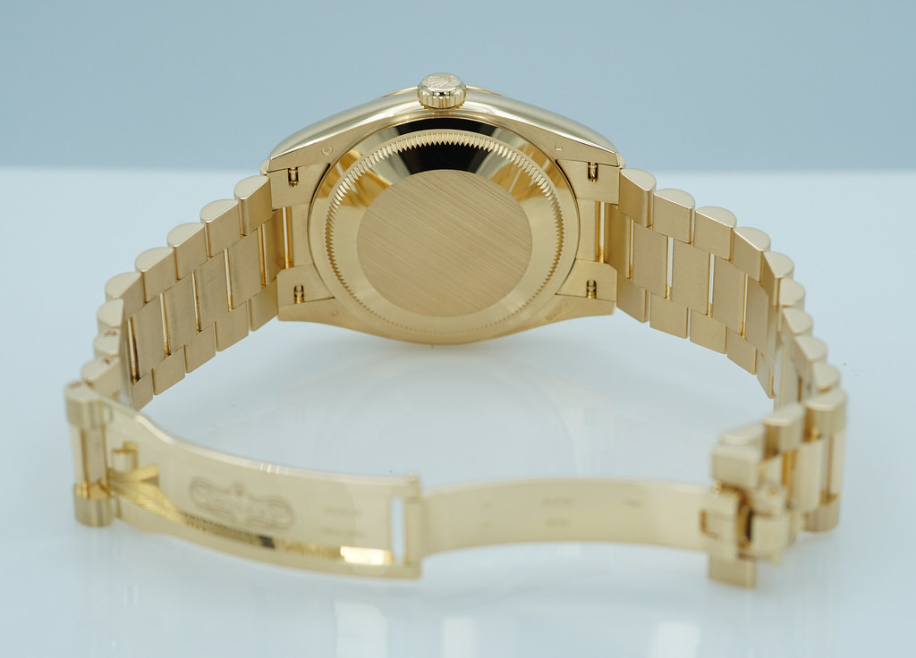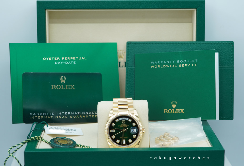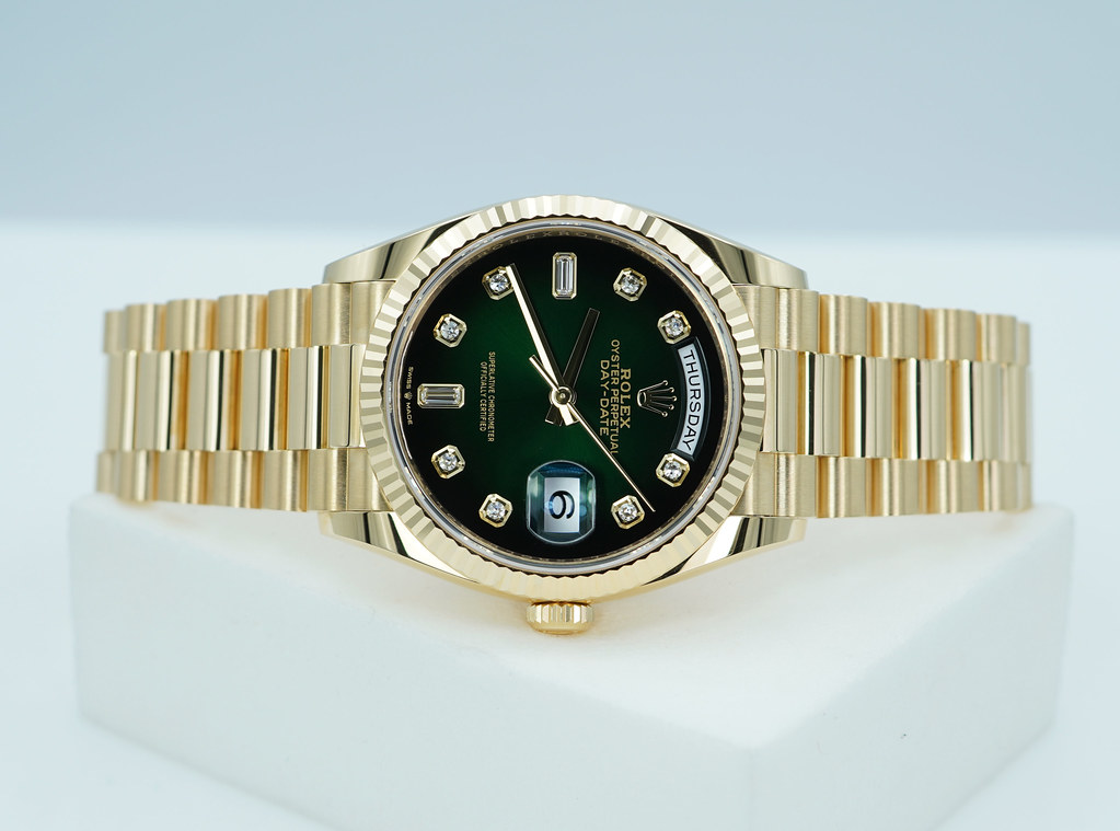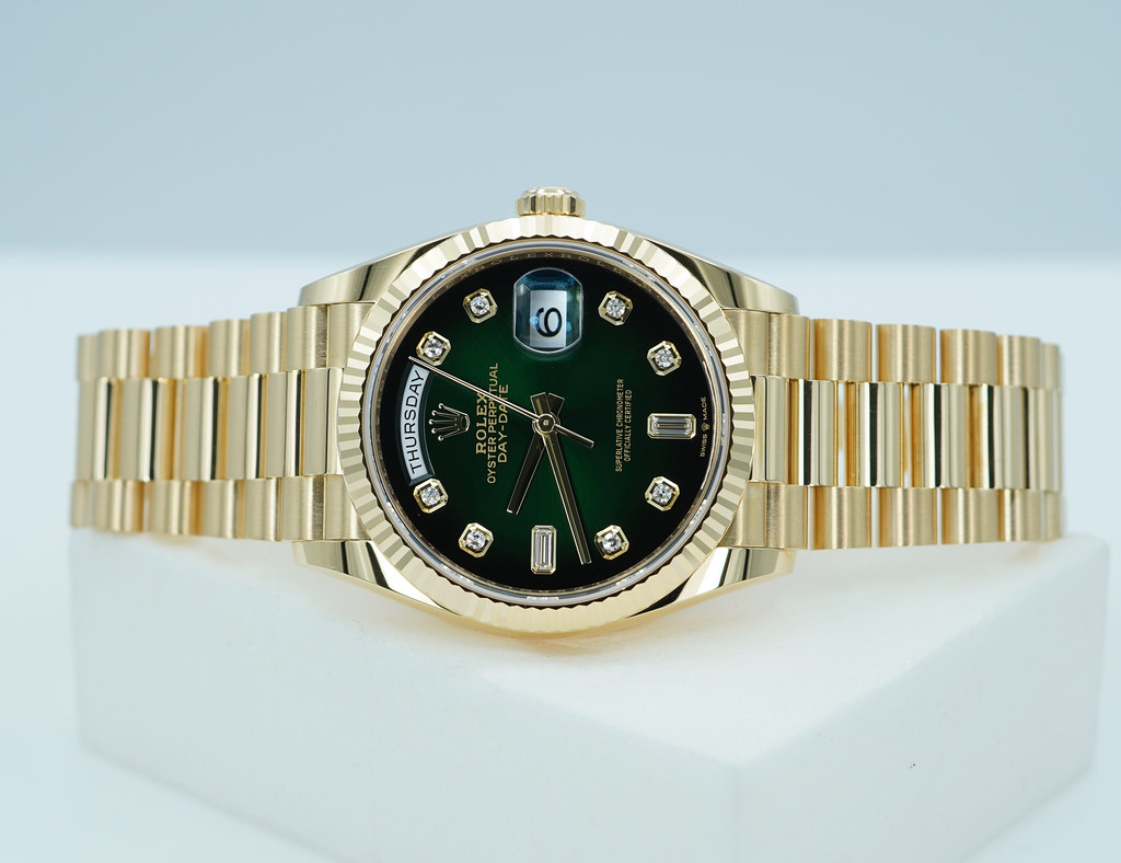 A Mint, Unpolished Condition & Very Beautiful 2024 36mm Rolex 128238 18K Yellow Gold Day-Date President with Green Ombré Diamond-Set Dial. New Rolex 3255 Movement. Purchased from Rolex Authorized Dealer in 04.2024. Watch Running Perfect with Non Issues. Full Links. Full Set & Under 5 Years Factory Warranty.