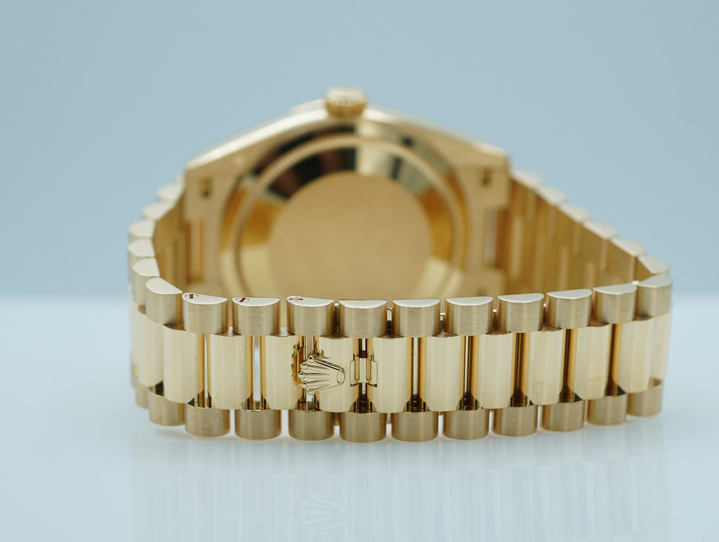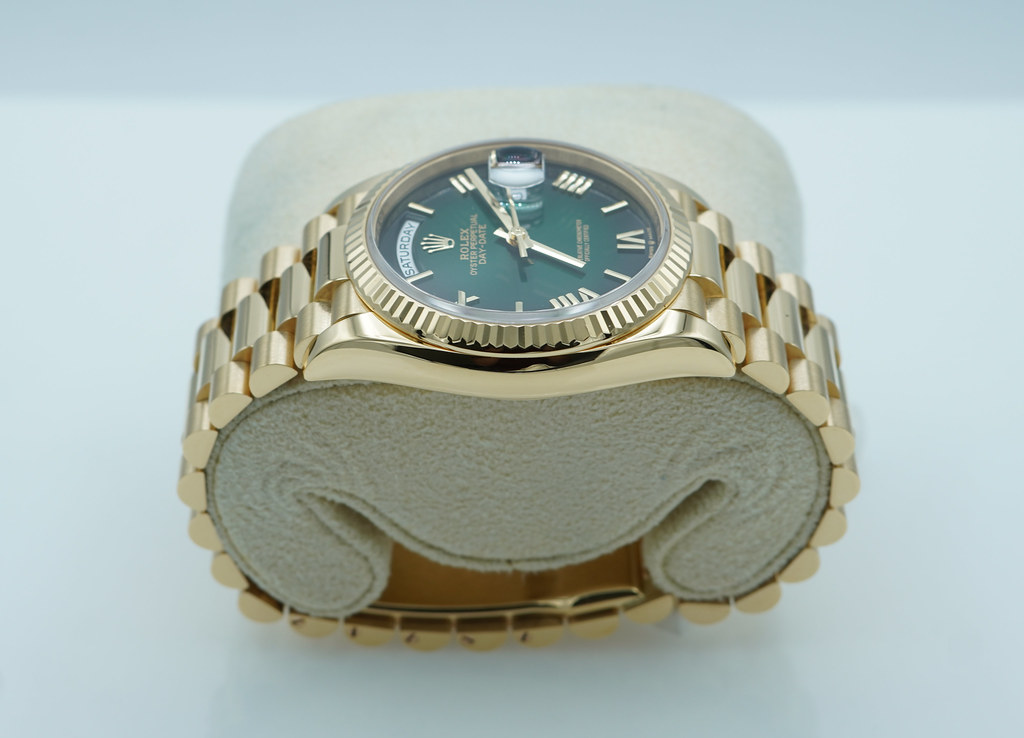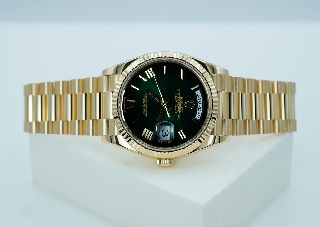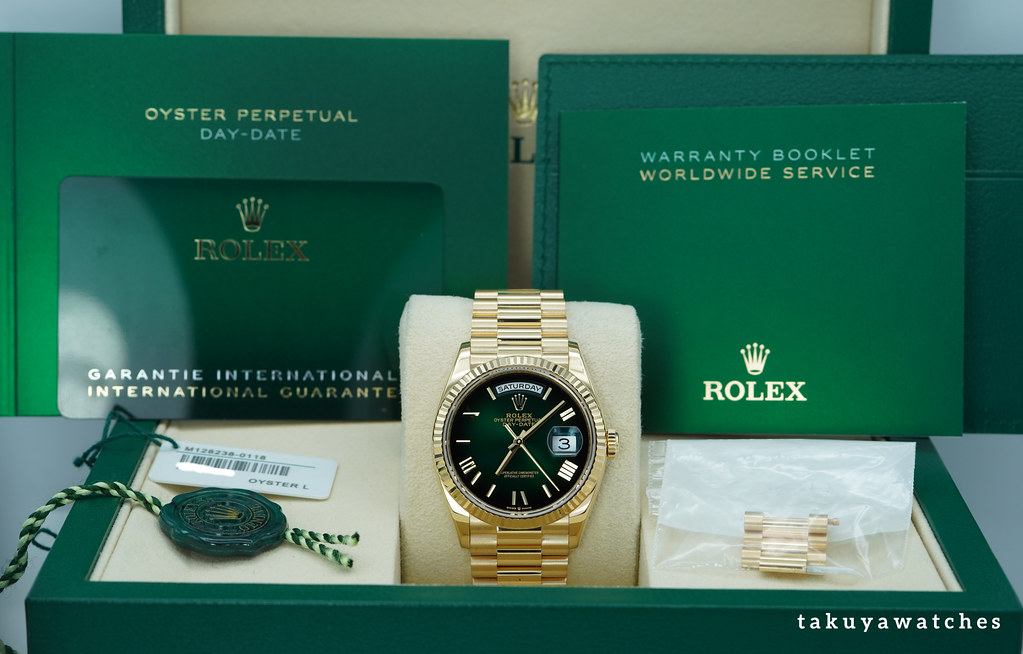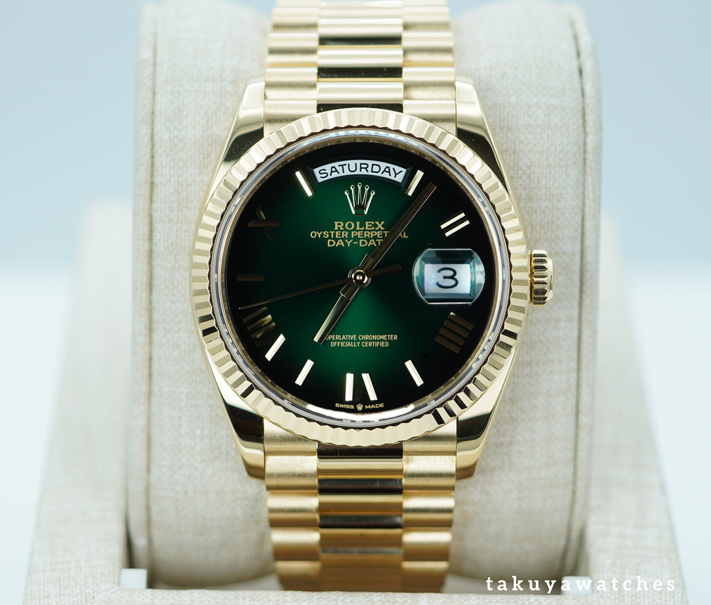 An Excellent Condition & Very Beautiful 2025 36mm Rolex 128238 18K Yellow Gold Day-Date President with Green Ombré Roman Numerals Dial. New Rolex 3255 Movement. Purchased from Rolex Authorized Dealer in 02.2025. Watch Running Perfect with Non Issues. Full Links. Full Set & Under 5 Years Factory Warranty.
